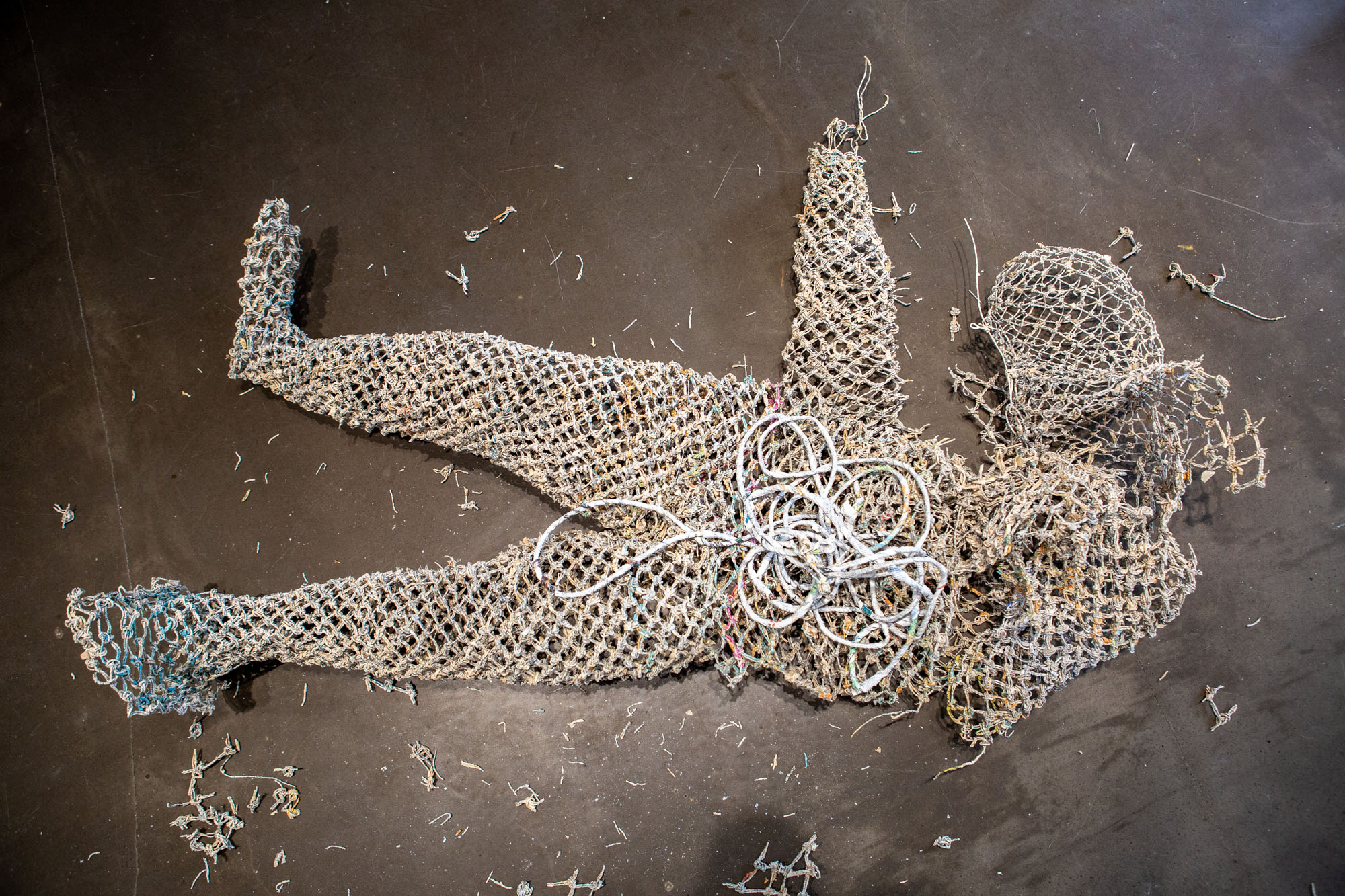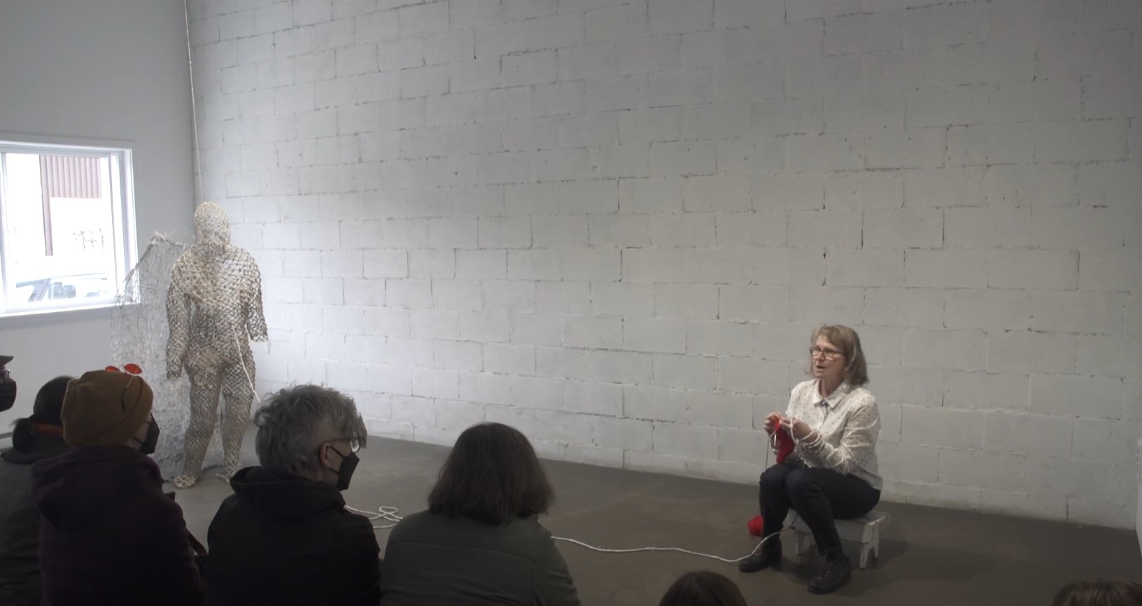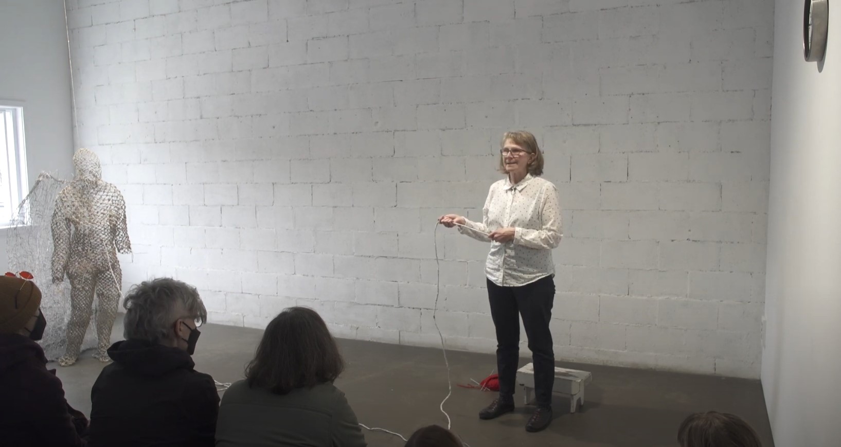 Hanging from a Thread sculpture and a performance explore the fragile and temporal nature of life, paper and words. The sculpture is formed from paper threads spun from the Grolier Encyclopedia Canadiana 1958. The threads have been knotted and solidified with a sugar-water solution to create a life-size representation of my father. I chose to work with the Canadiana encyclopedia because it represents the “father knows best” era and attitude that I grew up with. Spinning and weaving is my way of stripping this outdated mode of describing and distributing information of its arrogance and power.