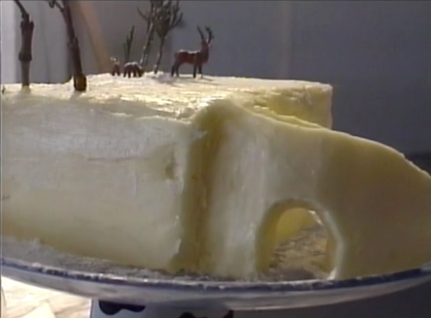 In another variation of the series of performances, for Mardi Gras, Karen dressed up in a costume with a white lab coat and balaclava covered with white plastic utensils, white gloves and white make-up on her face. On the chair was a scale model of an elaborate ski jump made of butter placed on a raised platter, and on each side of it was placed a block of ice in the shape of a loaf of bread. She walked down the main commercial street of Granby and went into each store offering the sales people a toothpick wrapped with a paper that had the message “J’aime l’hiver, j’hais l’hiver” (I love winter, I hate winter).