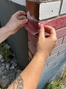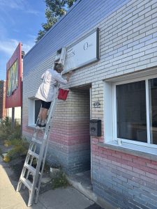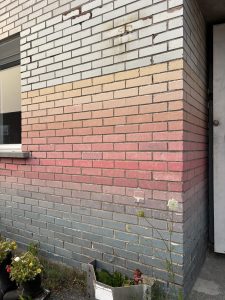 The Shadow of the Earth is an installation of handmade pigmented papers. Thin sheets were glued row by row to the bricks of the building. The work is part of the group exhibition, Emprunter Alexandra-Marconi curated by Lynn Hughes and Francine Lalonde, for exhibition at Produit Rien from October 15 to November 2, 2025.