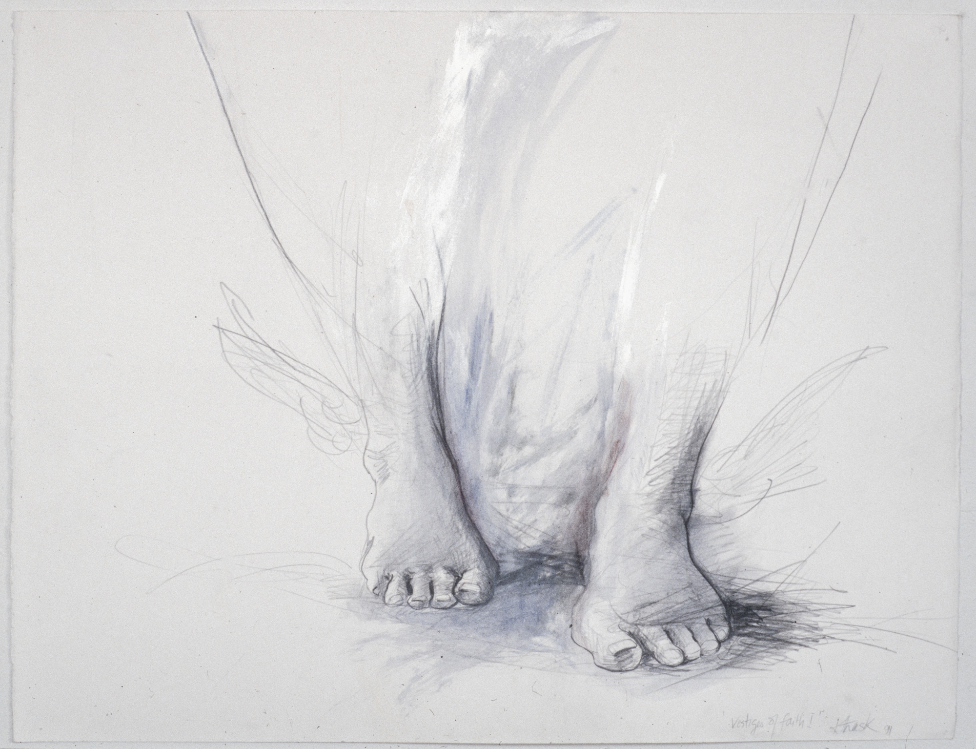 Vestiges of Faith is a drawing of feet standing on the ground with wings loosely sketched at the ankles.There are light touches of blue and white acrylic paint.
