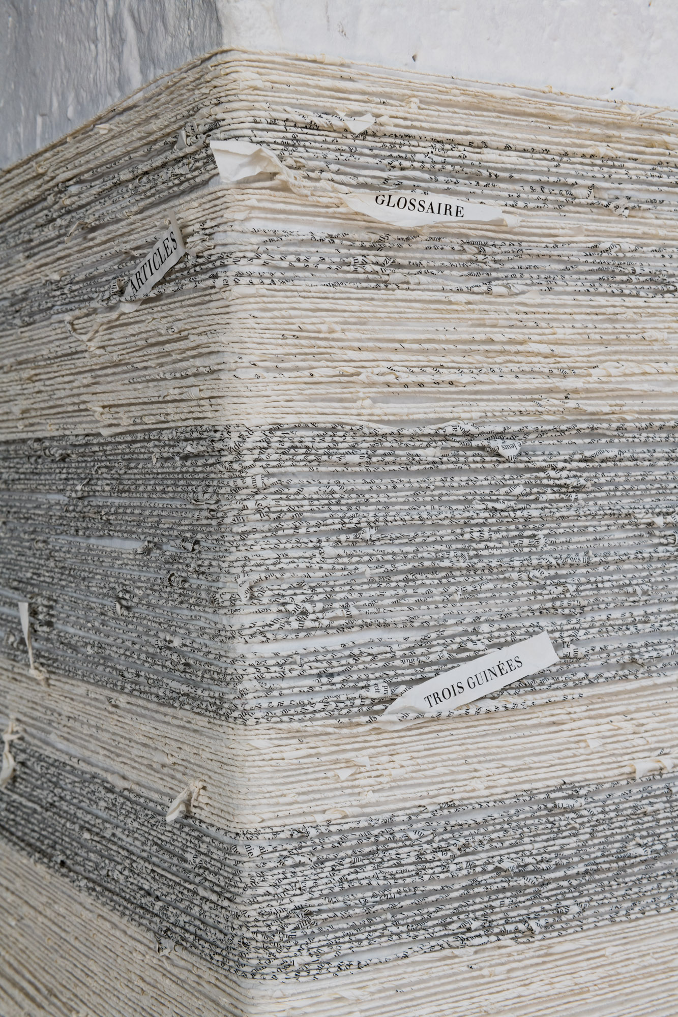 J’ai commencé à démonter des livres imprimés et à filer les pages en fils selon la technique japonaise du shifu, dans le cadre d’une performance pour l’exposition Lit de Proust en attente d’un baiser. Ce projet toujours en cours.