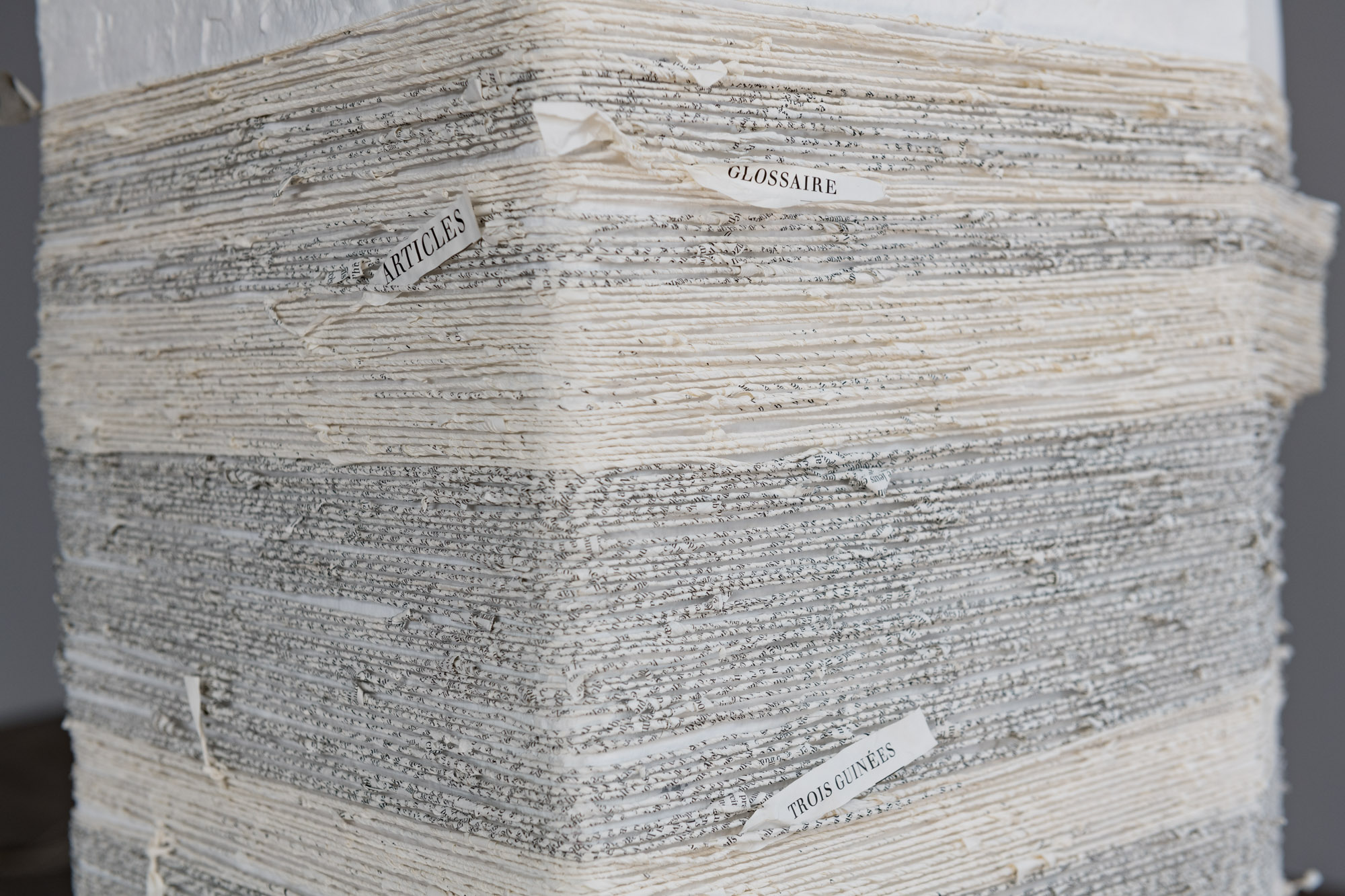Le geste de démonter des publications (encyclopédies, dictionnaires, atlas et textes religieux) est une tentative de déconstruire l’histoire longue et tenace du silence imposé aux voix féminines, et la domination du discours masculin. À travers le filage, le nouage et le tissage, je rappelle la contribution silencieuse des femmes à l’histoire depuis plus de 20 000 ans, souvent de manière anonyme. Quand une pile de dictionnaires devient une énorme pelote de fil déroulée dans les rues, ou que des cordes de papier s’échappent de la coque brisée d’un bateau échoué, je cherche à décentraliser le pouvoir des textes tout en mettant en valeur leur matérialité et le papier sur lequel ils sont imprimés. Lorsque, dans l’œuvre Ne tenir qu’à un fil, j’écrase un corps représentant mon père, fabriqué à partir des pages d’une encyclopédie, je me confronte à la violence du patriarcat.
