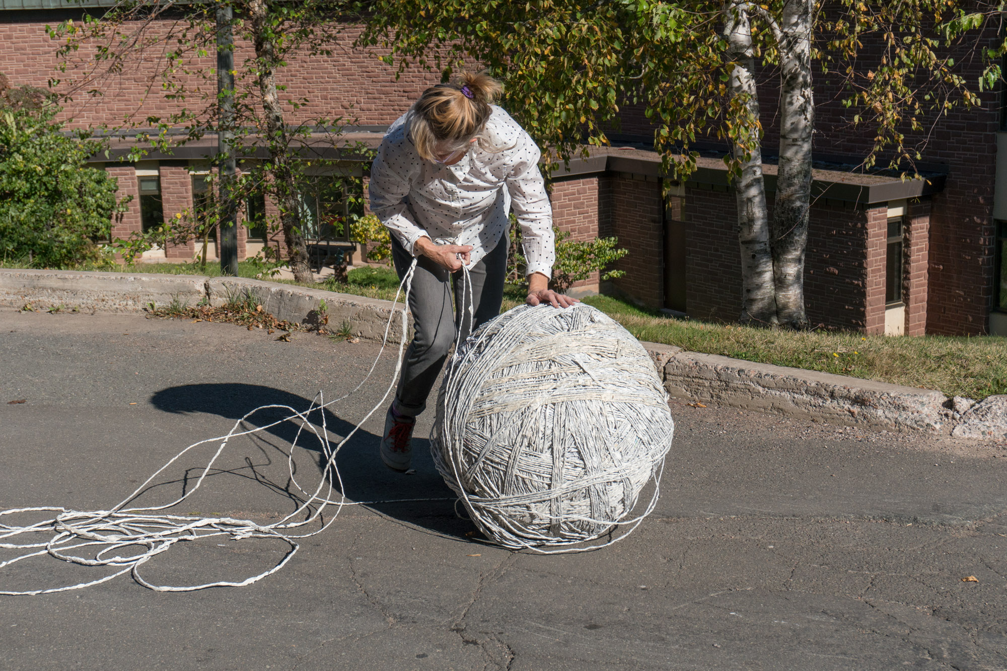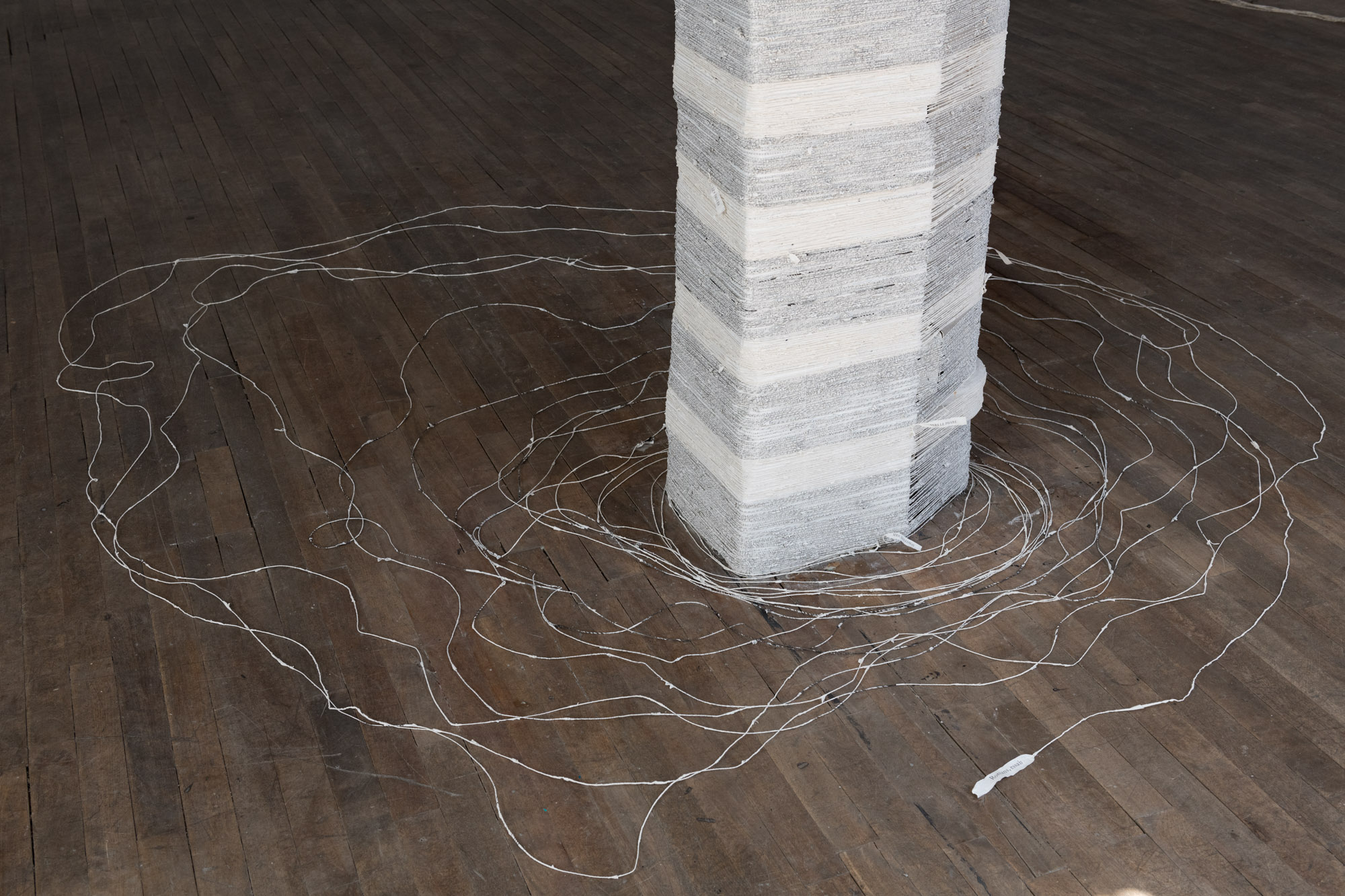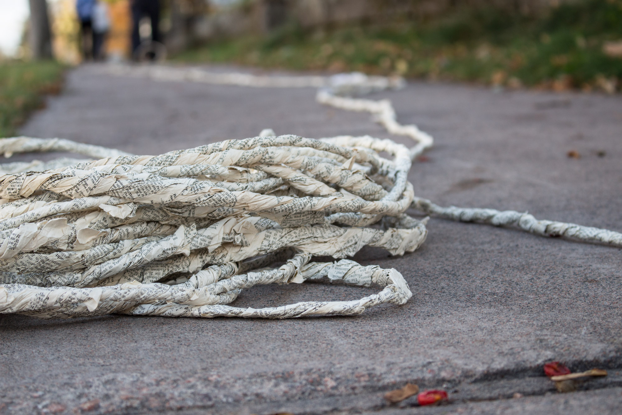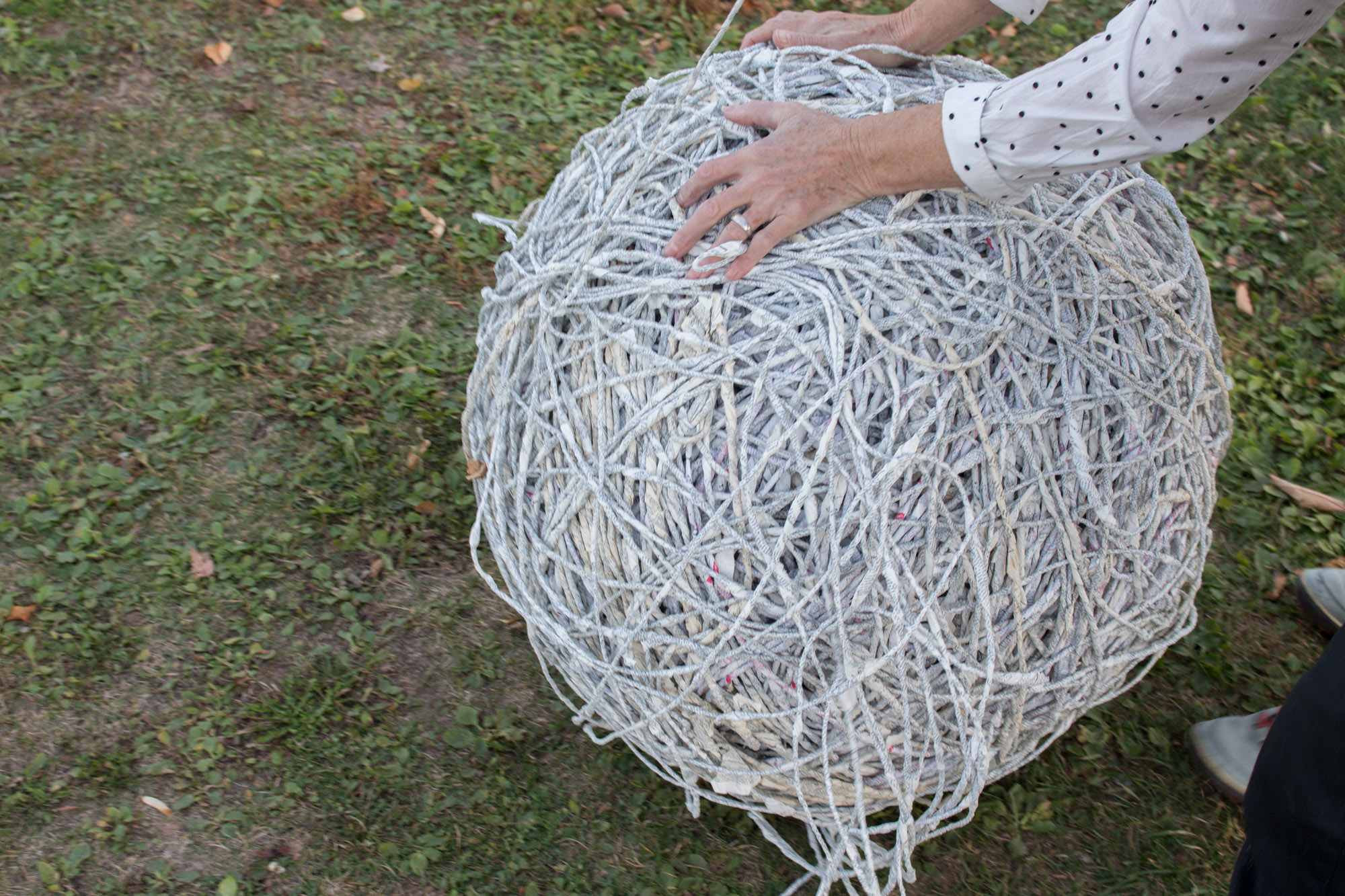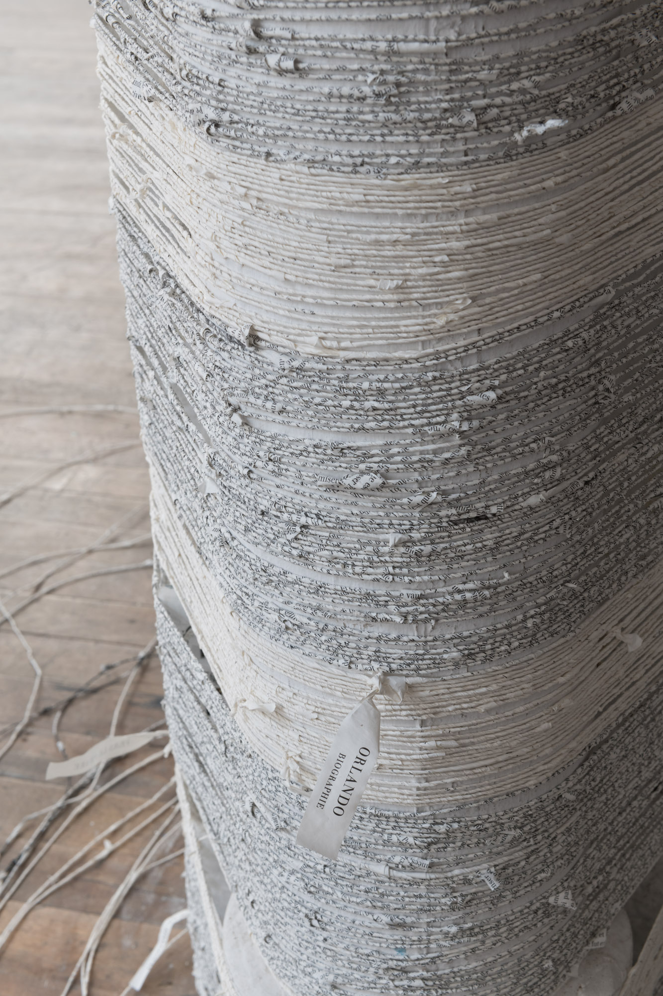The act of taking apart publications, such as encyclopedias, dictionaries, atlases and religious texts, is a gesture towards undoing the long history of silencing women’s voices and the dominance of male discourse. It is a reminder, through spinning, knotting and weaving, of women’s silent contribution to history for over 20,000 years in an all too anonymous way. When a pile of dictionaries becomes a huge ball of thread that is unravelled through the streets, or paper cords spilling out from the broken hull of a beached boat, I seek to decentralize the power of texts, while emphasizing their materiality and the paper they are written on. When, in the work Hanging by a Thread, I crush a body made from the pages of the encyclopedia representing my father, I push back against the violence of patriarchy.