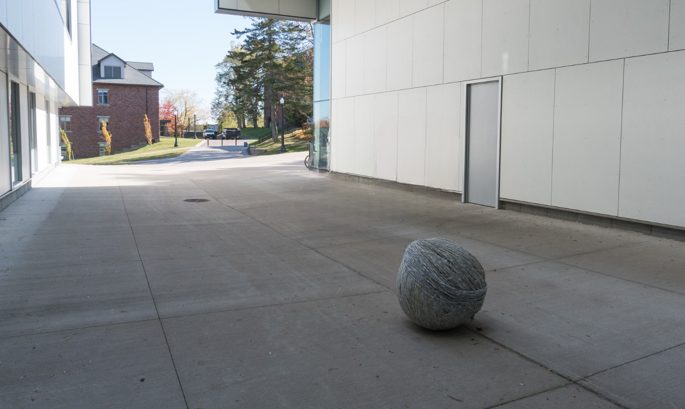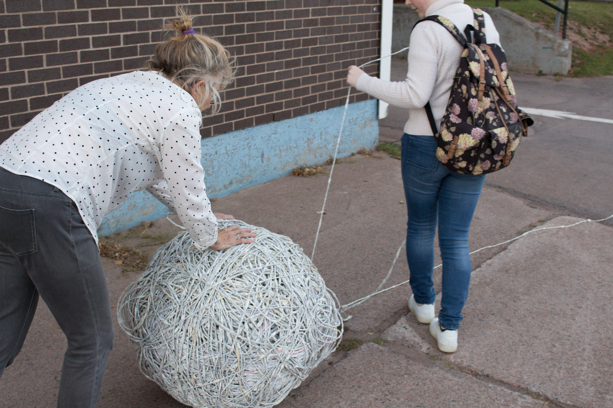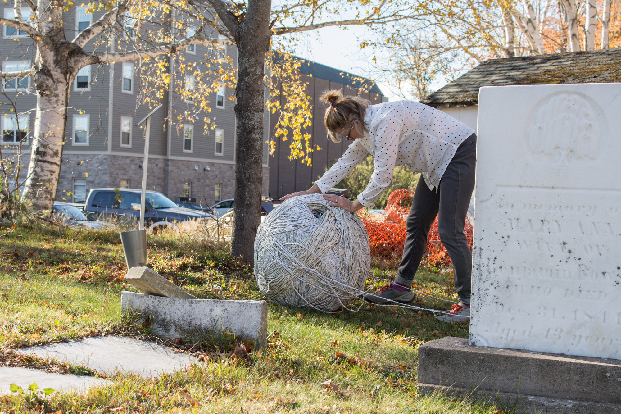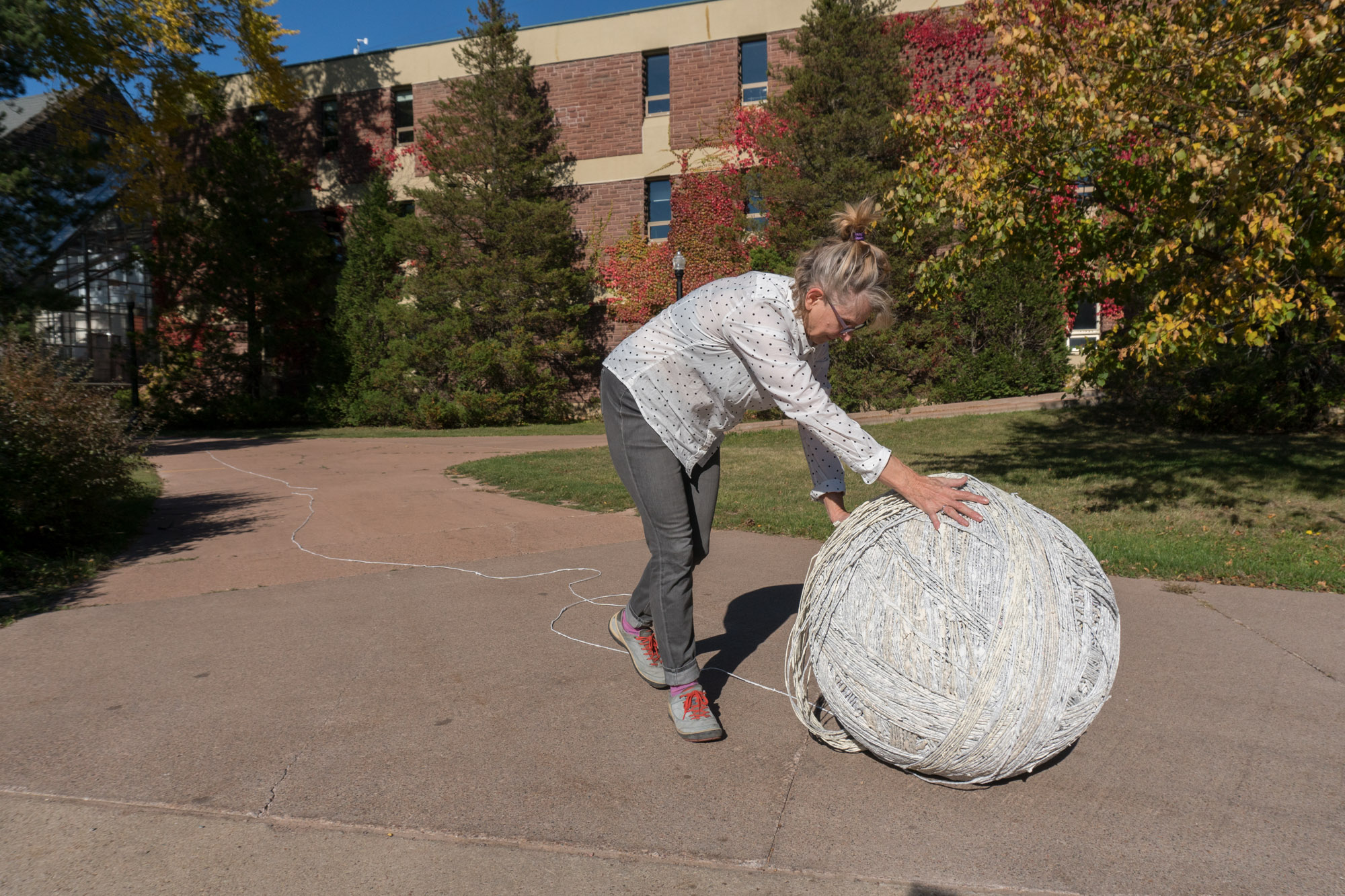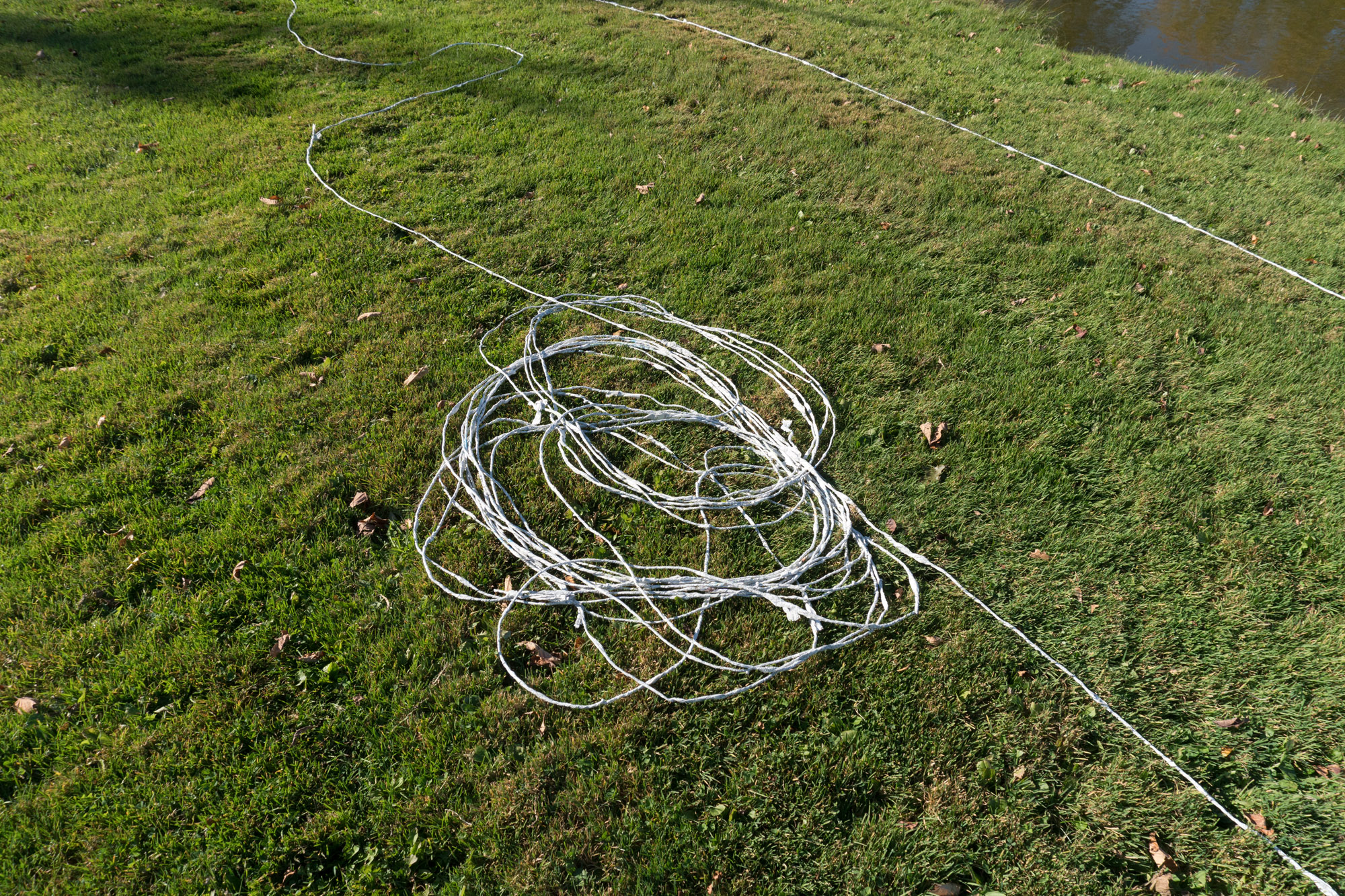 The act of taking apart publications, such as encyclopedias, dictionaries, atlases and religious texts, is a gesture towards undoing the long history of silencing women’s voices and the dominance of male discourse. It is a reminder, through spinning, knotting and weaving, of women’s silent contribution to history for over 20,000 years in an all too anonymous way. When a pile of dictionaries becomes a huge ball of thread that is unravelled through the streets, or paper cords spilling out from the broken hull of a beached boat, I seek to decentralize the power of texts, while emphasizing their materiality and the paper they are written on. When, in the work Hanging by a Thread, I crush a body made from the pages of the encyclopedia representing my father, I push back against the violence of patriarchy.