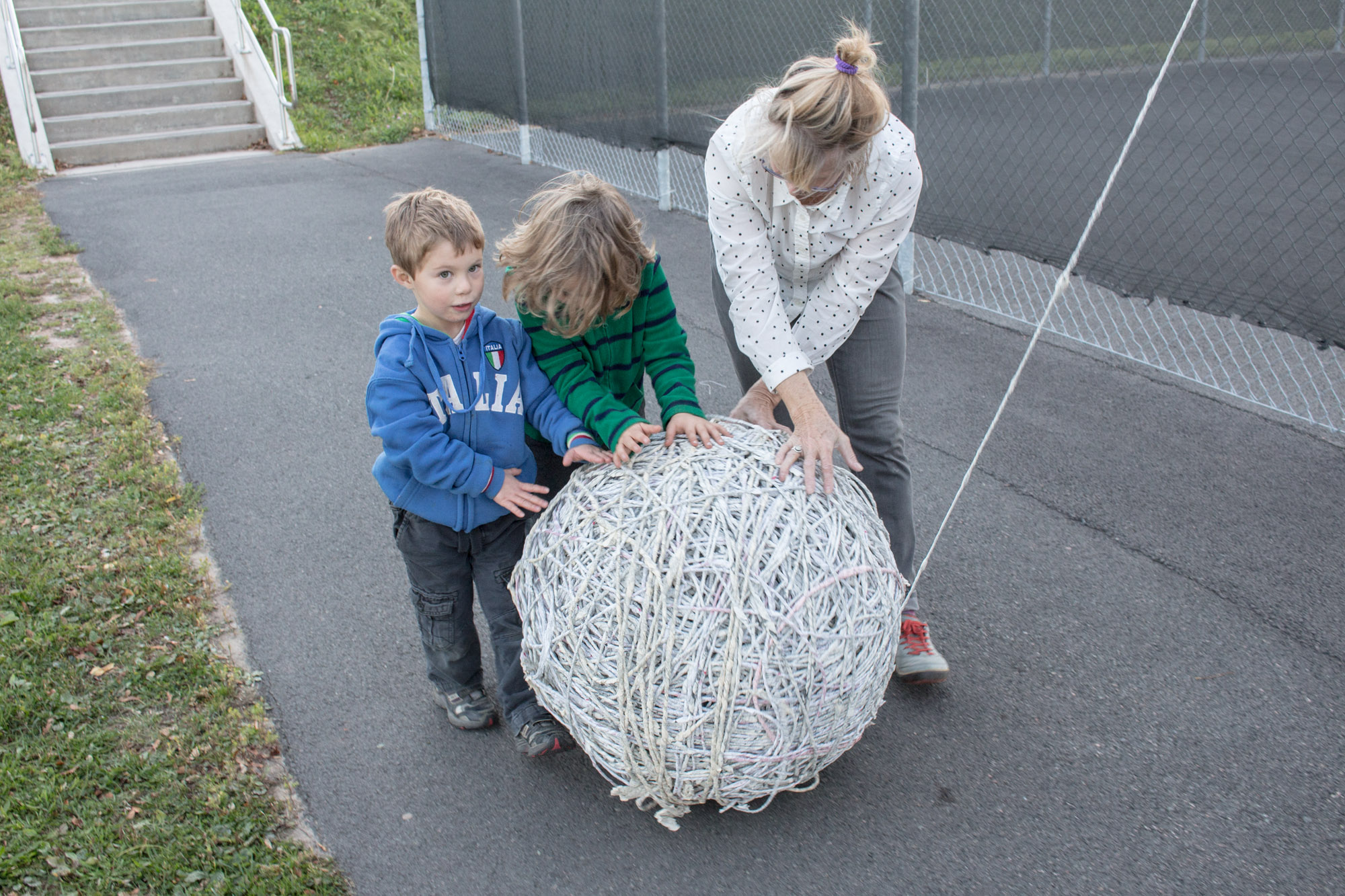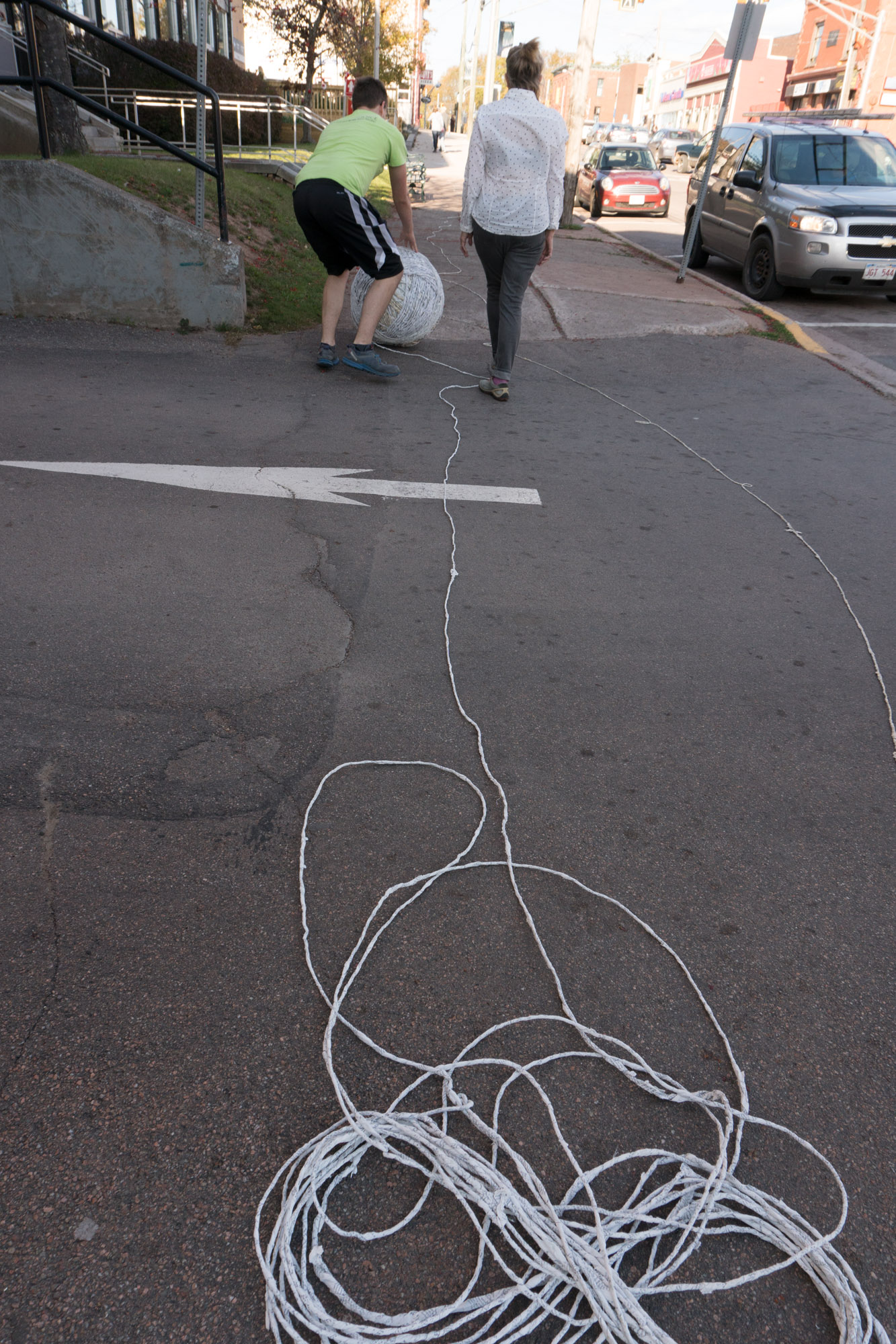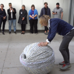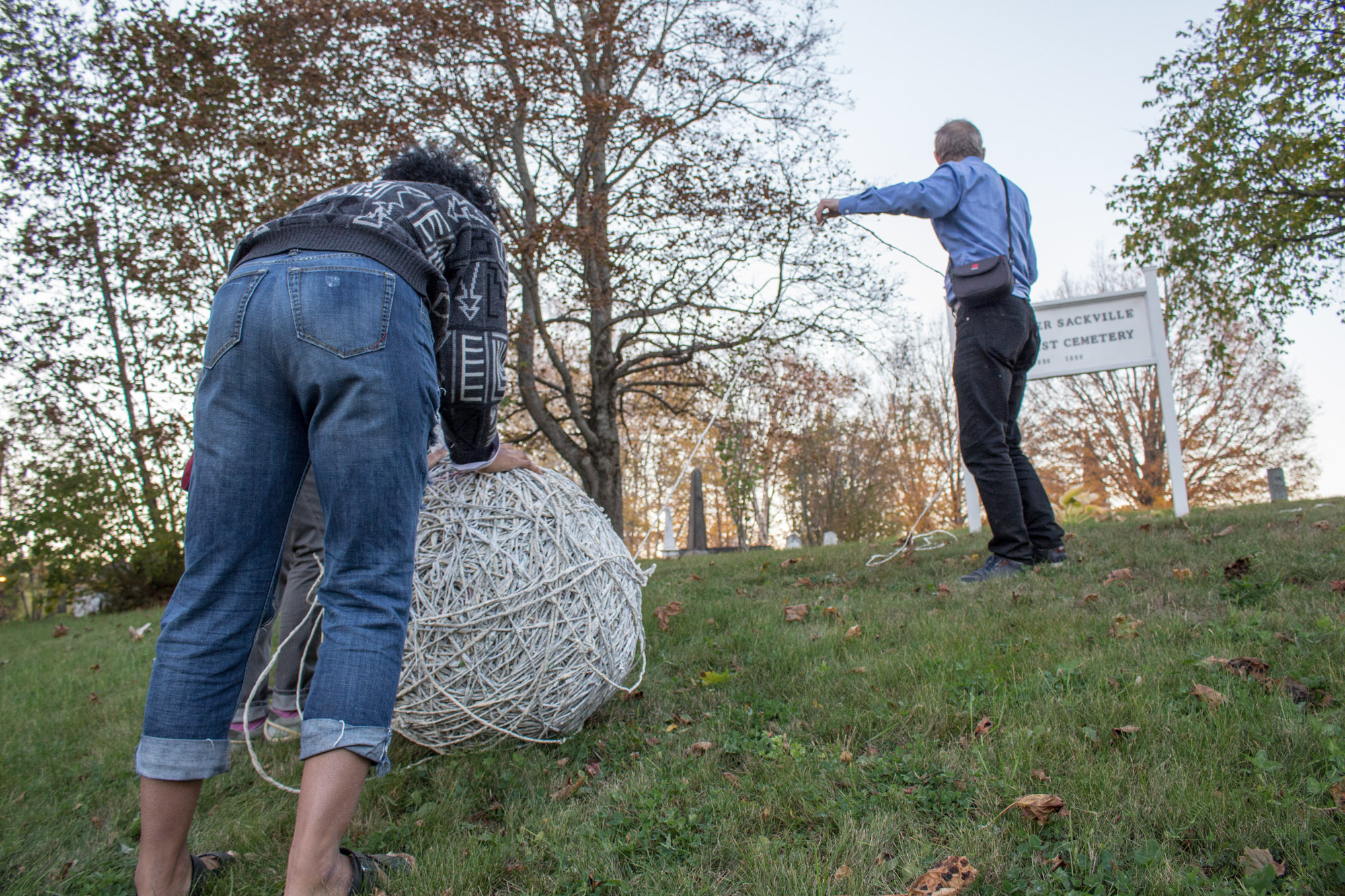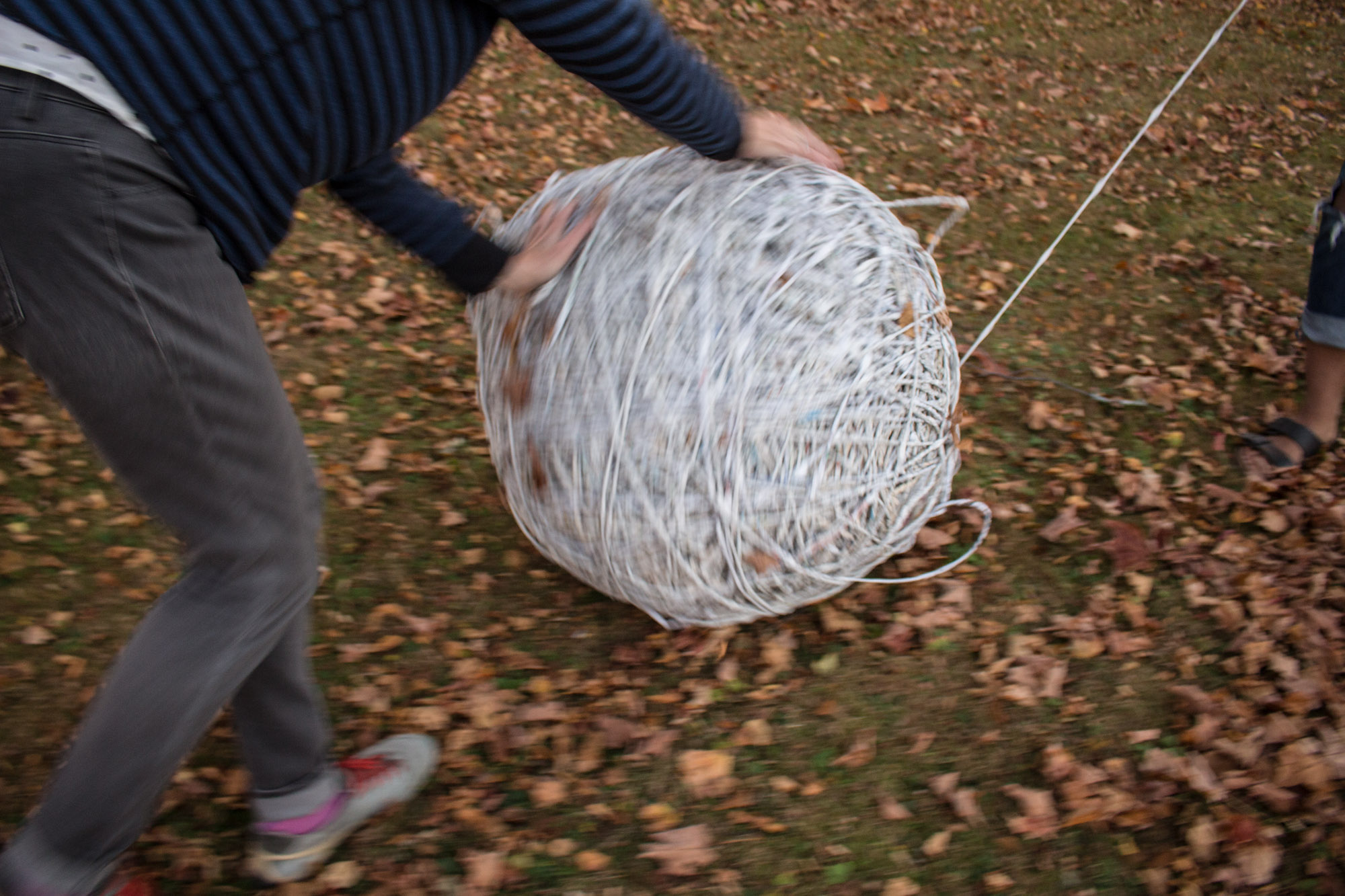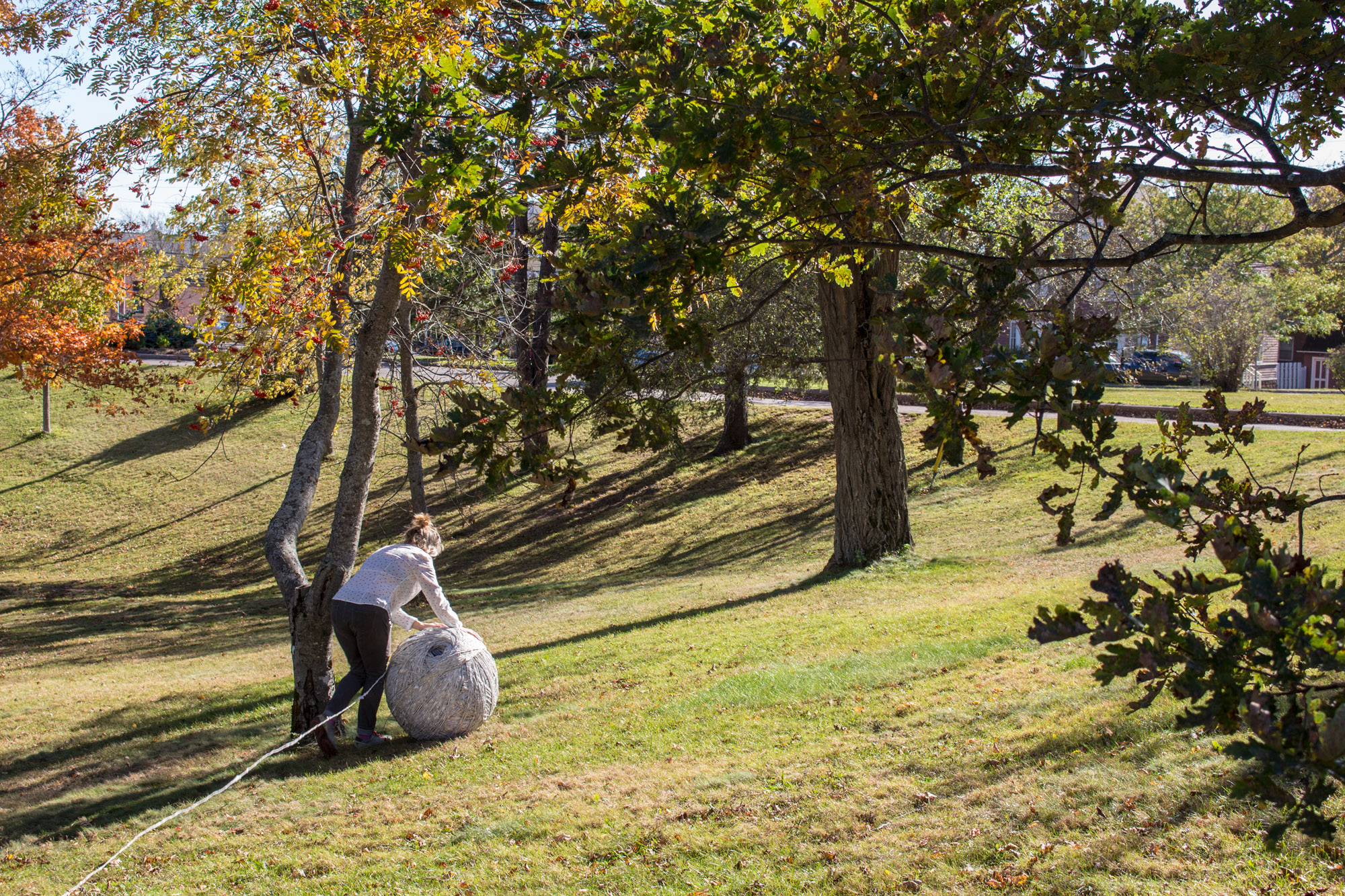 The act of taking apart publications, such as encyclopedias, dictionaries, atlases and religious texts, is a gesture towards undoing the long history of silencing women’s voices and the dominance of male discourse. It is a reminder, through spinning, knotting and weaving, of women’s silent contribution to history for over 20,000 years in an all too anonymous way. When a pile of dictionaries becomes a huge ball of thread that is unravelled through the streets, or paper cords spilling out from the broken hull of a beached boat, I seek to decentralize the power of texts, while emphasizing their materiality and the paper they are written on. When, in the work Hanging by a Thread, I crush a body made from the pages of the encyclopedia representing my father, I push back against the violence of patriarchy.
