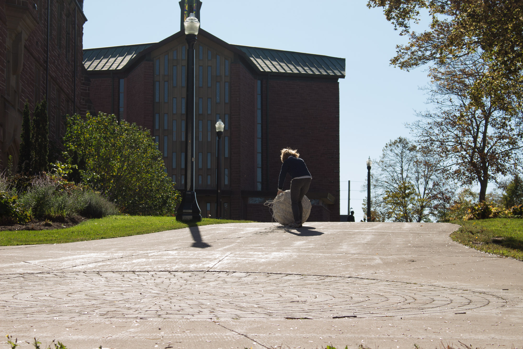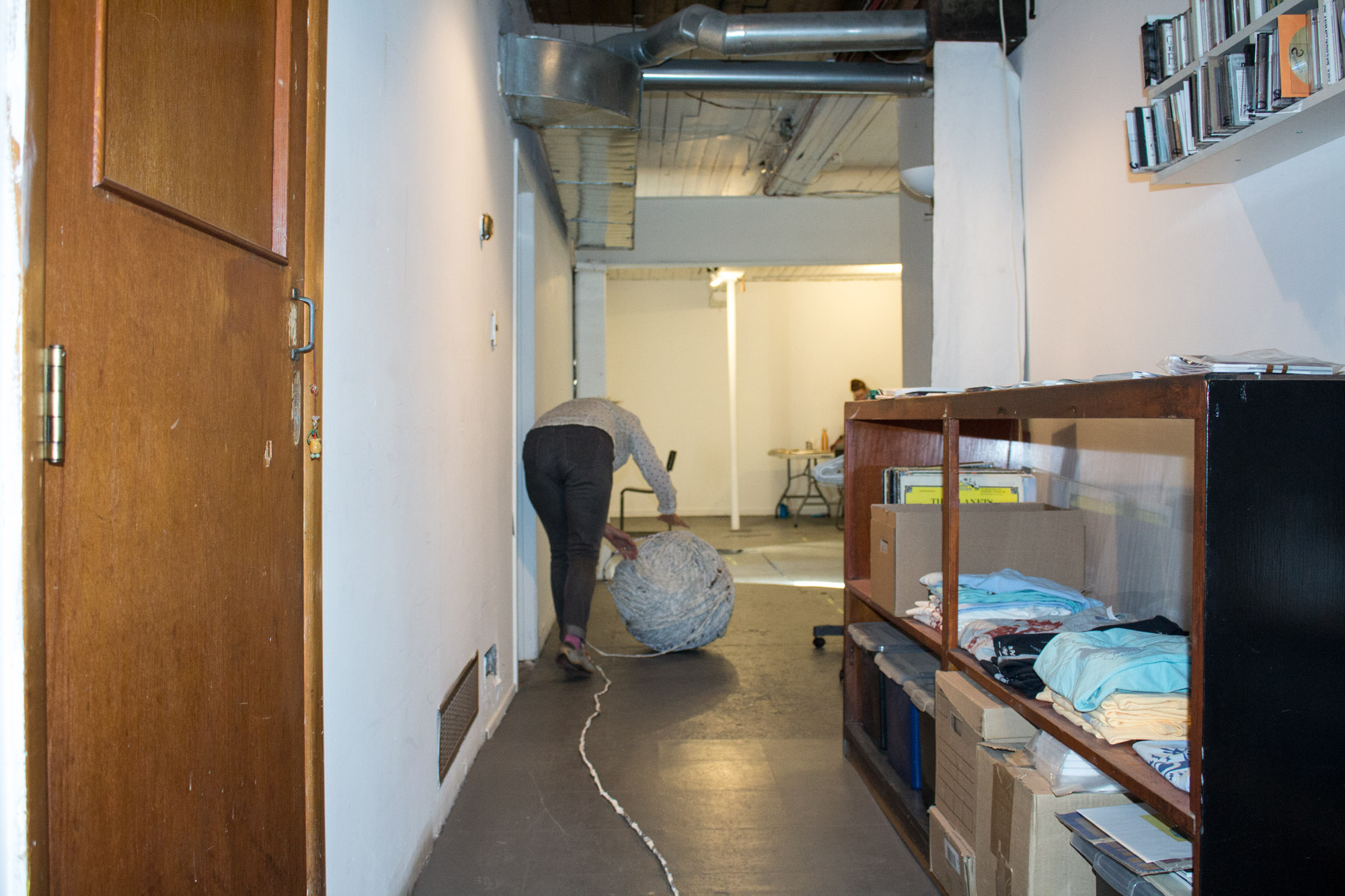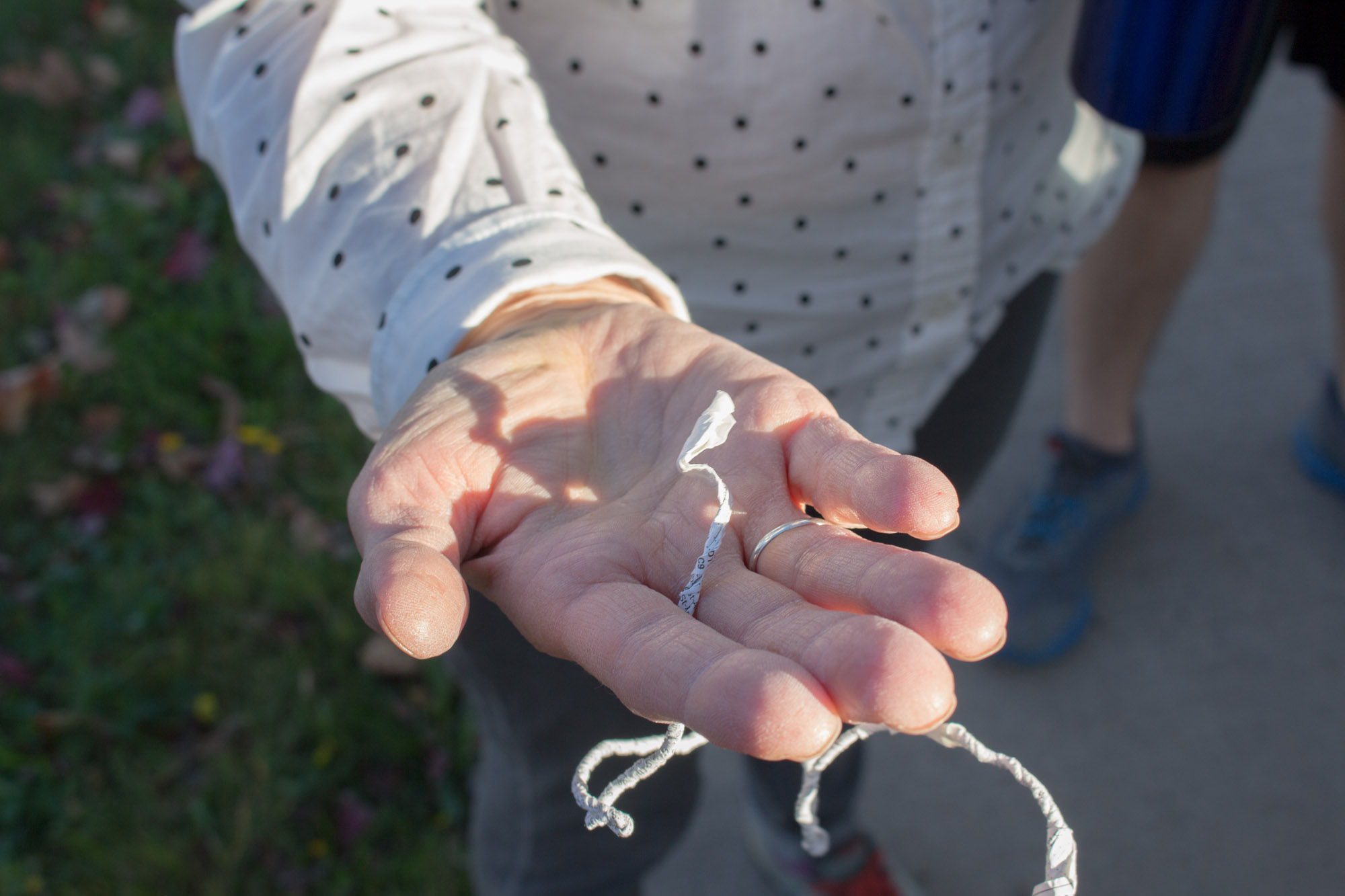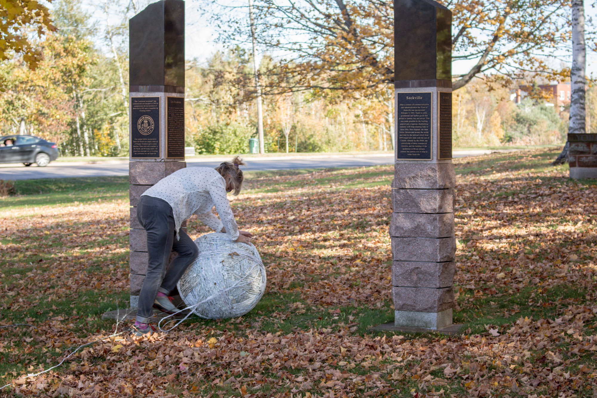 The act of taking apart publications, such as encyclopedias, dictionaries, atlases and religious texts, is a gesture towards undoing the long history of silencing women’s voices and the dominance of male discourse. It is a reminder, through spinning, knotting and weaving, of women’s silent contribution to history for over 20,000 years in an all too anonymous way. When a pile of dictionaries becomes a huge ball of thread that is unravelled through the streets, or paper cords spilling out from the broken hull of a beached boat, I seek to decentralize the power of texts, while emphasizing their materiality and the paper they are written on. When, in the work Hanging by a Thread, I crush a body made from the pages of the encyclopedia representing my father, I push back against the violence of patriarchy.