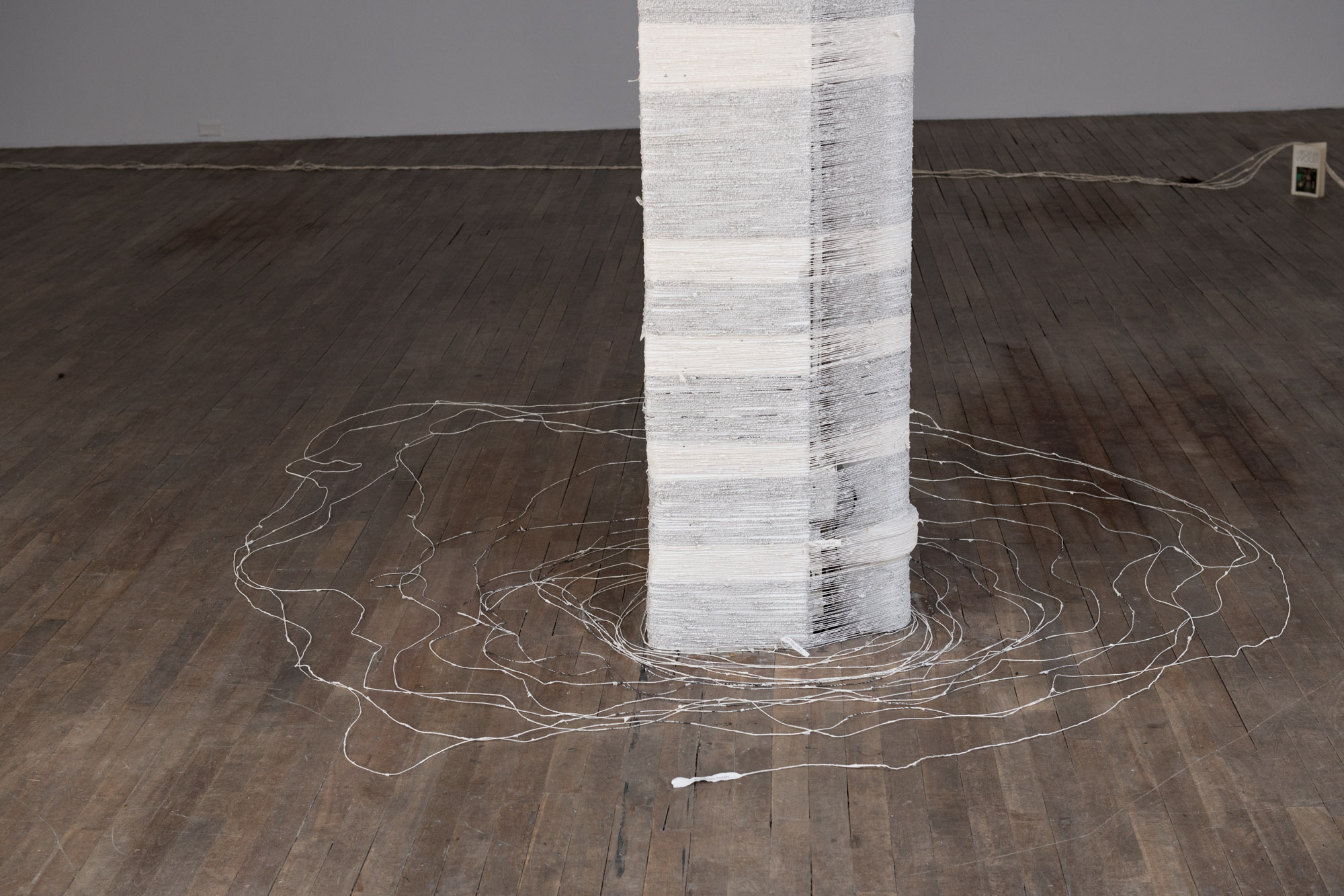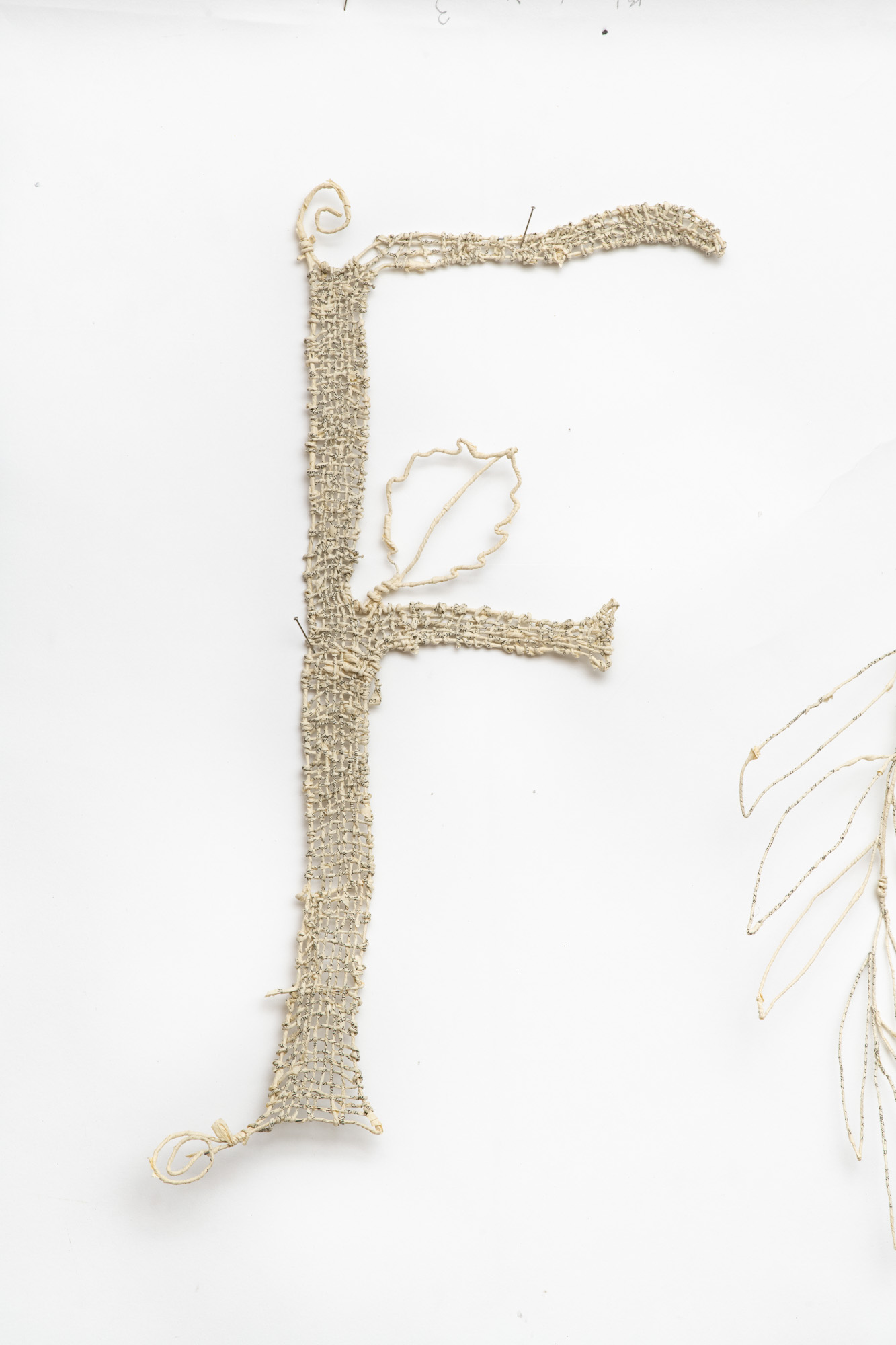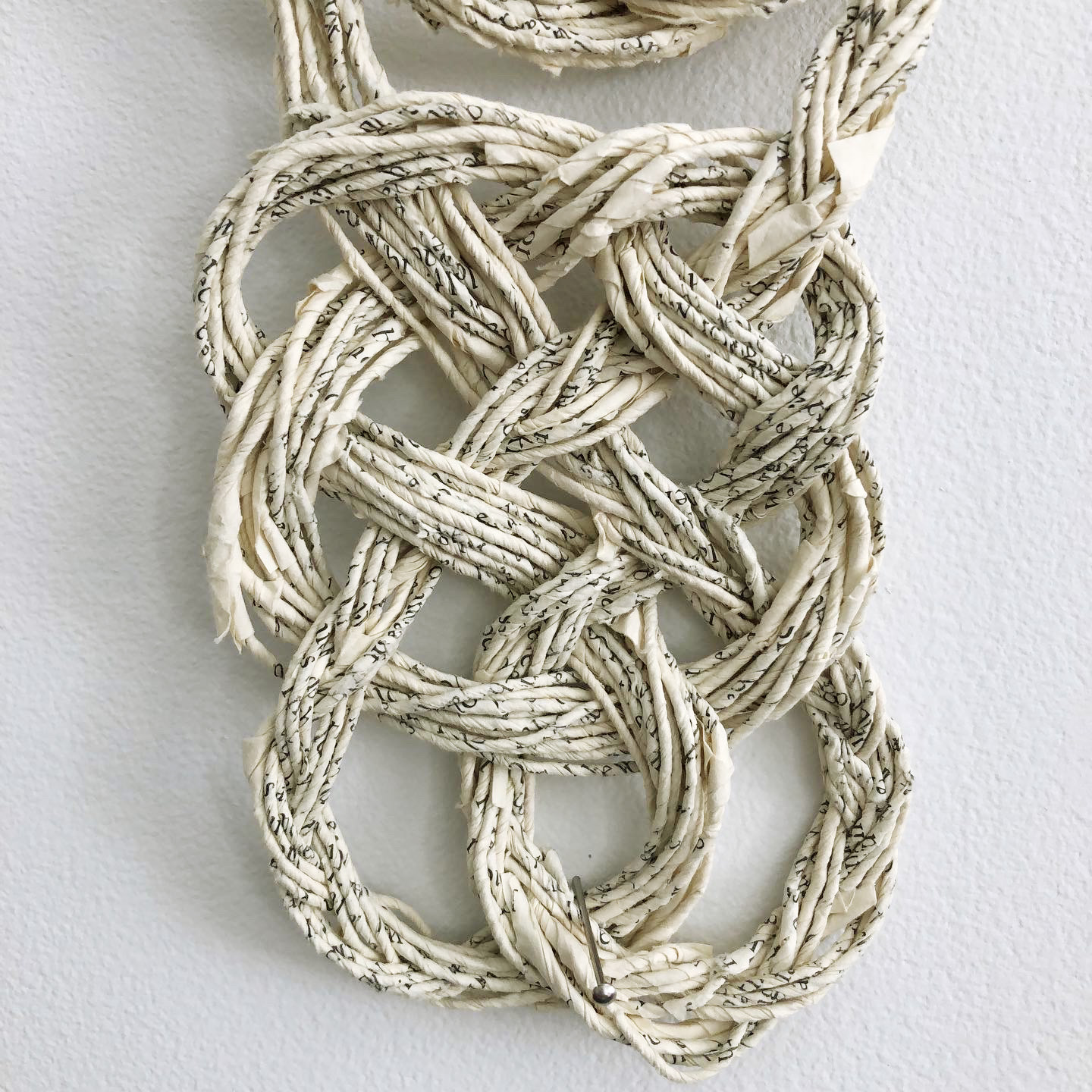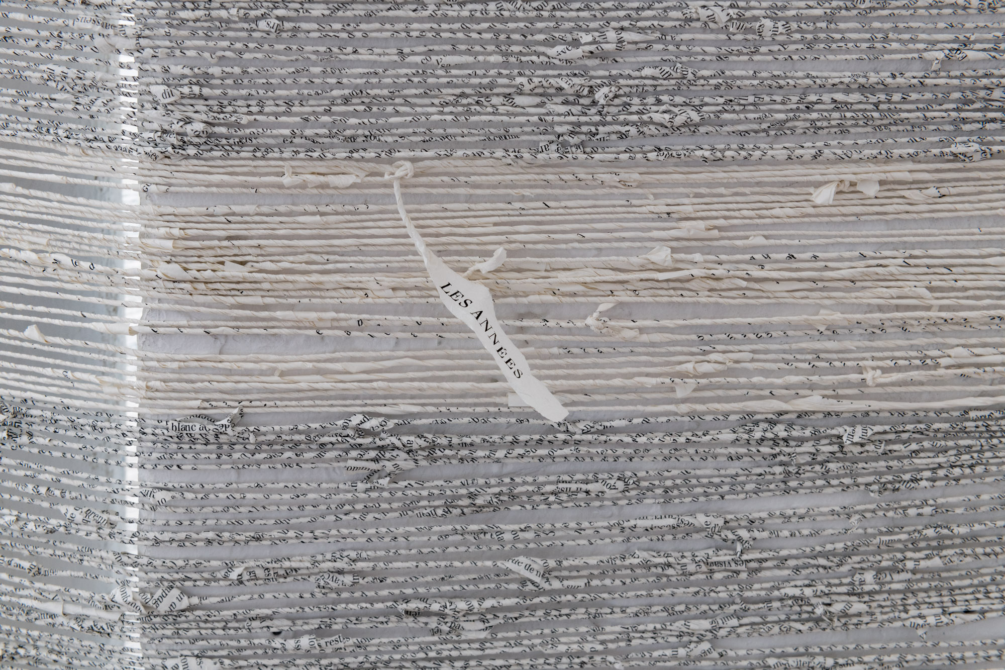 Les œuvres sculpturales dans Défaire le mot imprimé utilisent du fil fabriqué à partir des pages de deux sources distinctes : des livres de référence et des œuvres classiques de fiction. Mon intention diffère selon la source : une forme de critique pour l’une, un hommage pour l’autre. Toutes les œuvres explorent les possibilités de formes créées par le filage, le tissage et le nouage de ces fils.