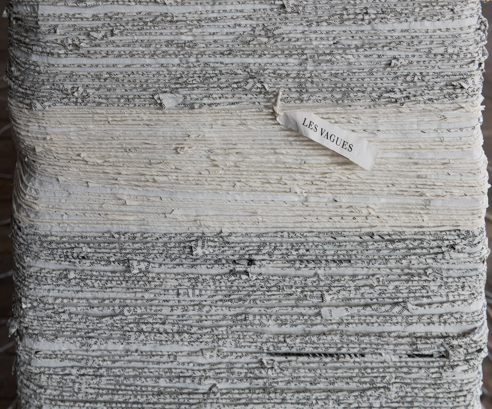 Artworks in Undoing the Printed Word also include transformations of some of my most esteemed literary works –such as James Joyce’s Ulysses, Virginia Woolf’s The Waves and Marcel Proust’s À la recherche du temps perdu. Here, transforming the pages of these works into weavings is an homage to these authors’ writings. They are a way for me to visually interpret the stories told. All these novels are of particular interest to me because they reference and draw inspiration from textile arts.