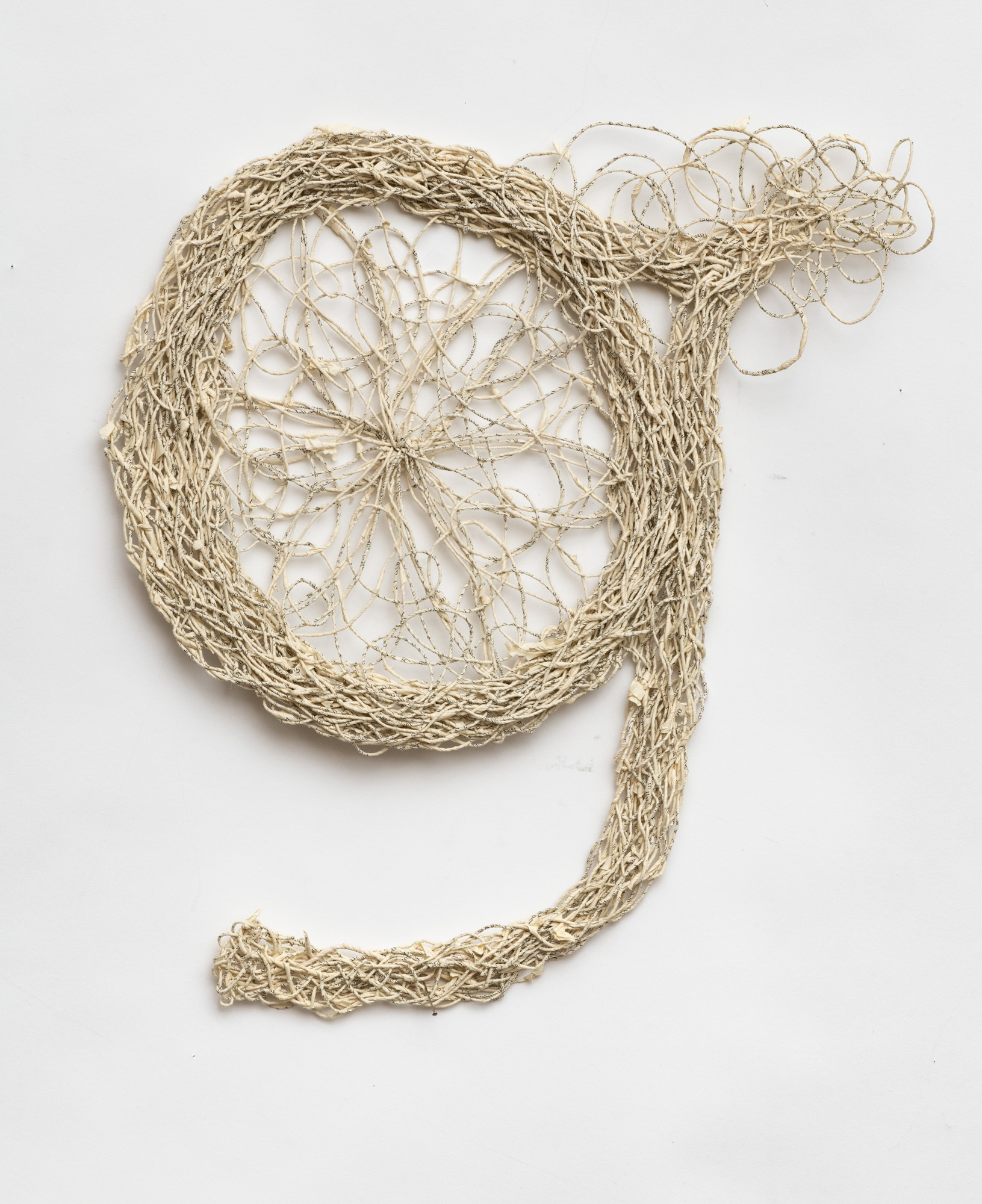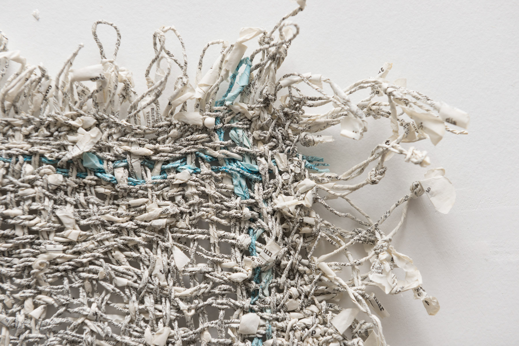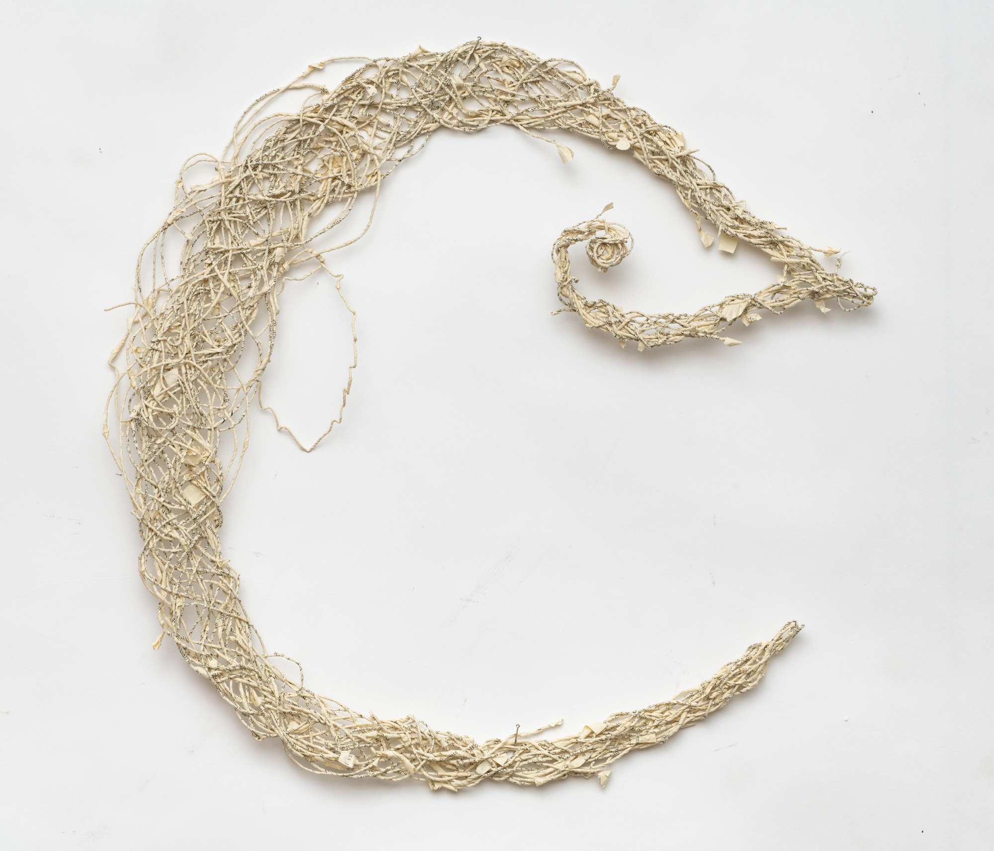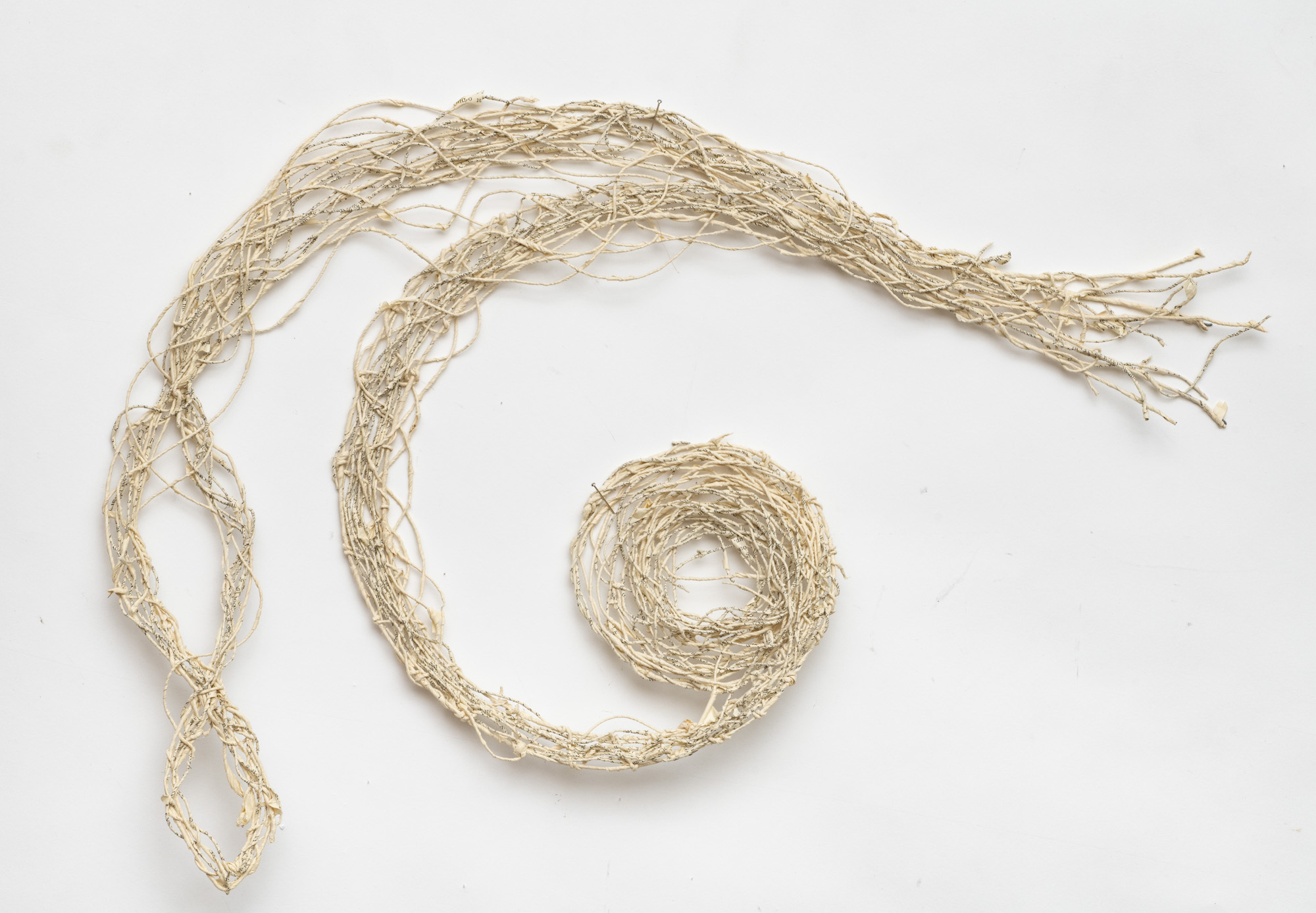 The sculptural works in Undoing the Printed Word use thread made from the pages of two distinct sources: reference books and classic works of fiction. My intentions behind using these sources differ: one a critique, the other an homage. All the works explore the possible forms that can be created by spinning, weaving and knotting these threads.