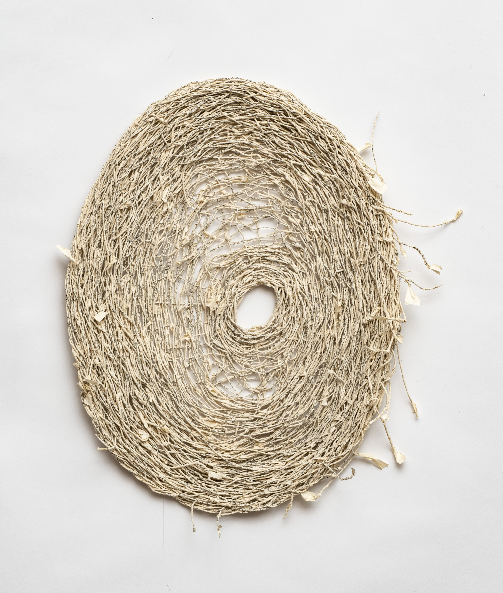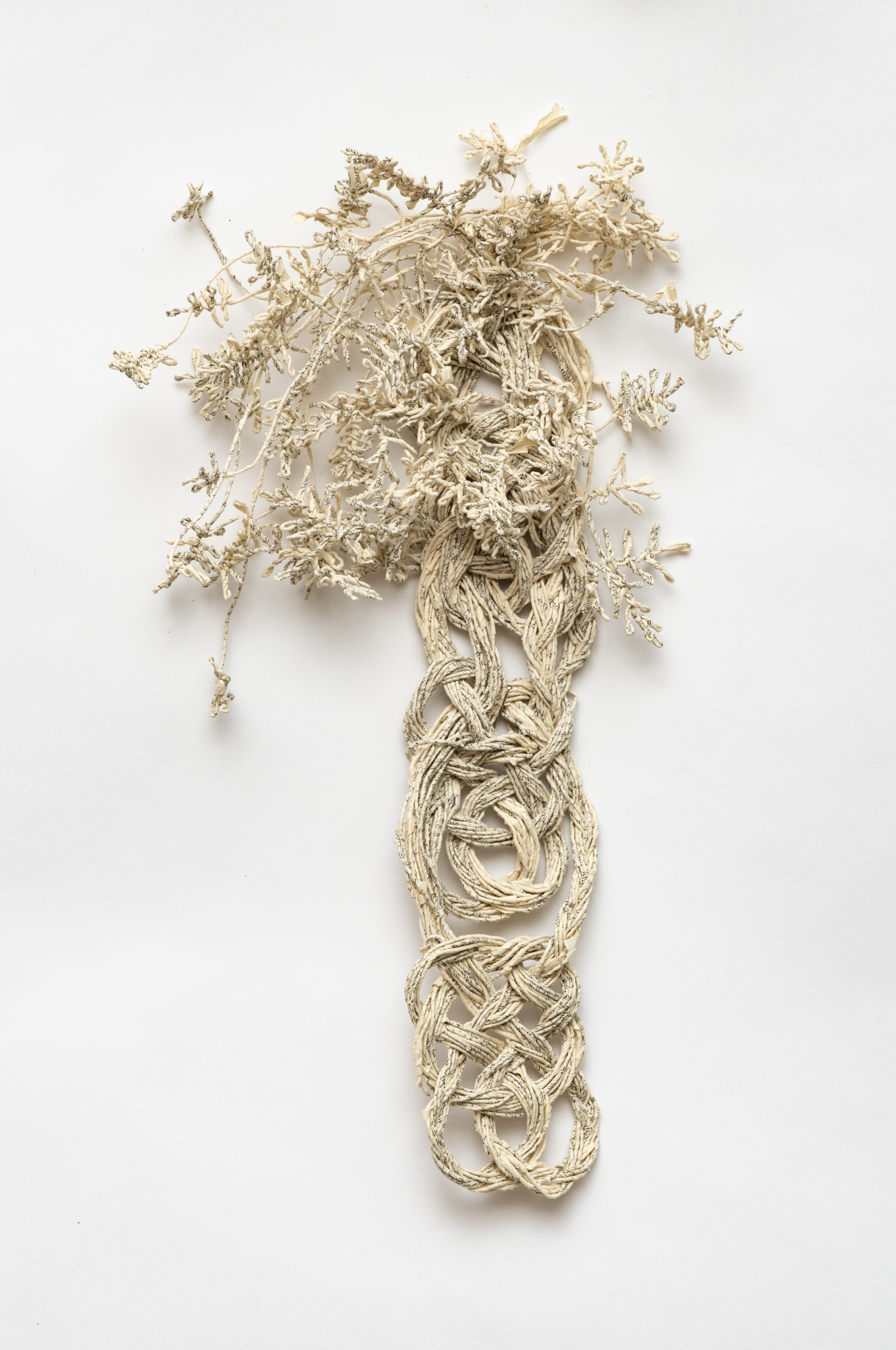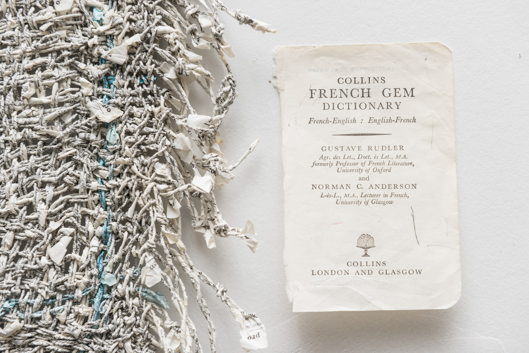The sculptural works in Undoing the Printed Word use thread made from the pages of two distinct sources: reference books and classic works of fiction. My intentions behind using these sources differ: one a critique, the other an homage. All the works explore the possible forms that can be created by spinning, weaving and knotting these threads.