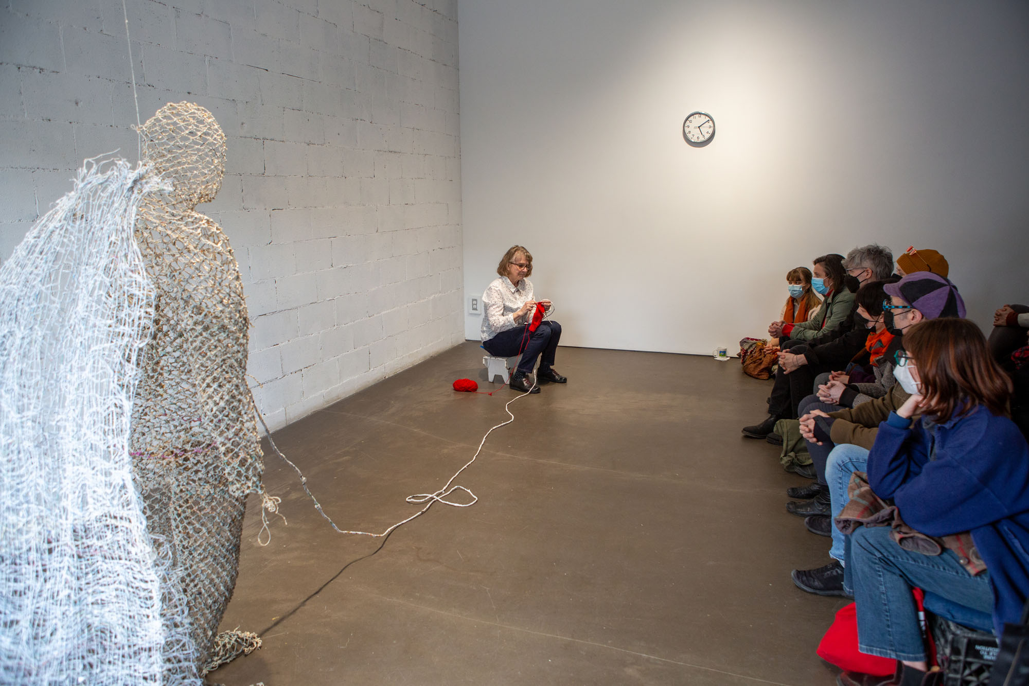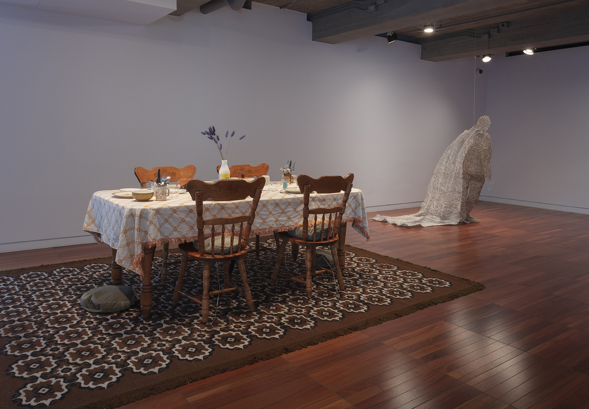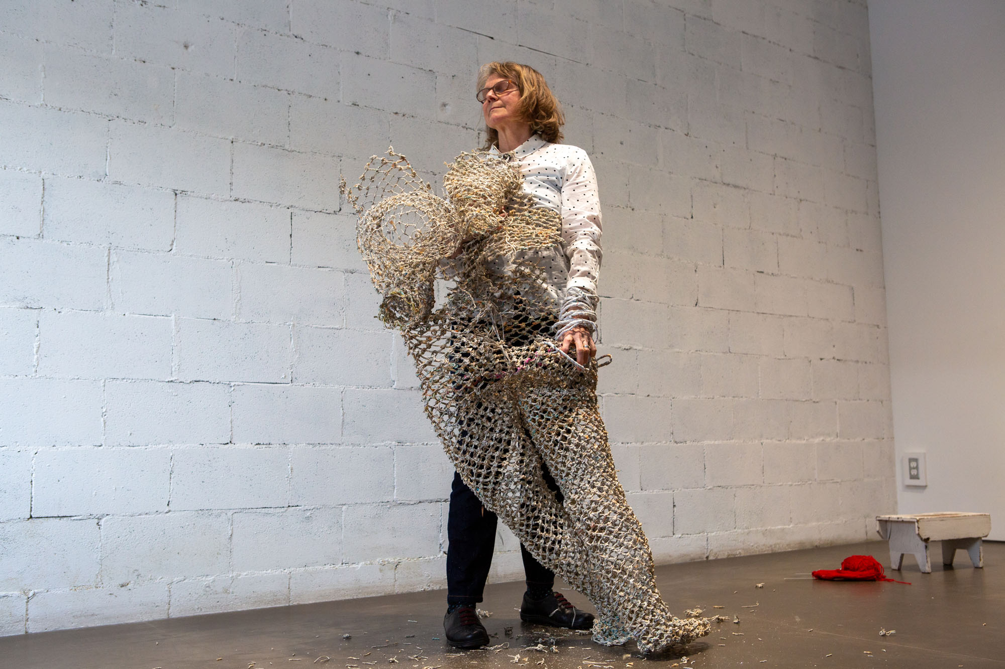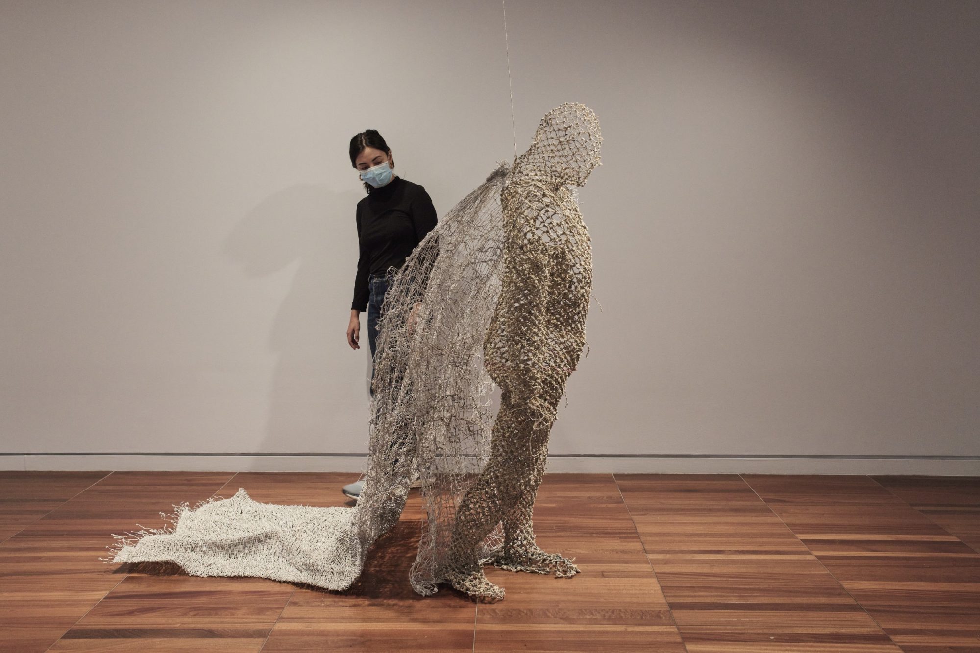 … and room in the bag of stars is a group exhibition that presents works produced in the context of the inaugural PHI MONTRÉAL residency, launched by PHI and carried out in the summer of 2021. The five laureates of this edition of the residency, kimura byol-nathalie lemoine, Salima Punjani, Dominique Sirois, Santiago Tamayo Soler and Karen Trask, proposed projects in response to a theme inspired by the work of science-fiction author Ursula K. Le Guin. It was an invitation, after a moment of prolonged social isolation, to imagine spaces, temporalities, conditions, or systems where we can all get together, again. (source: press release Centre Phi) For the exhibition Karen Trask presented Hanging by a Thread / Ne tenir qu’à un fil, which was a work in two parts: a sculpture of a life-size figure constructed of paper threads crystallized