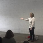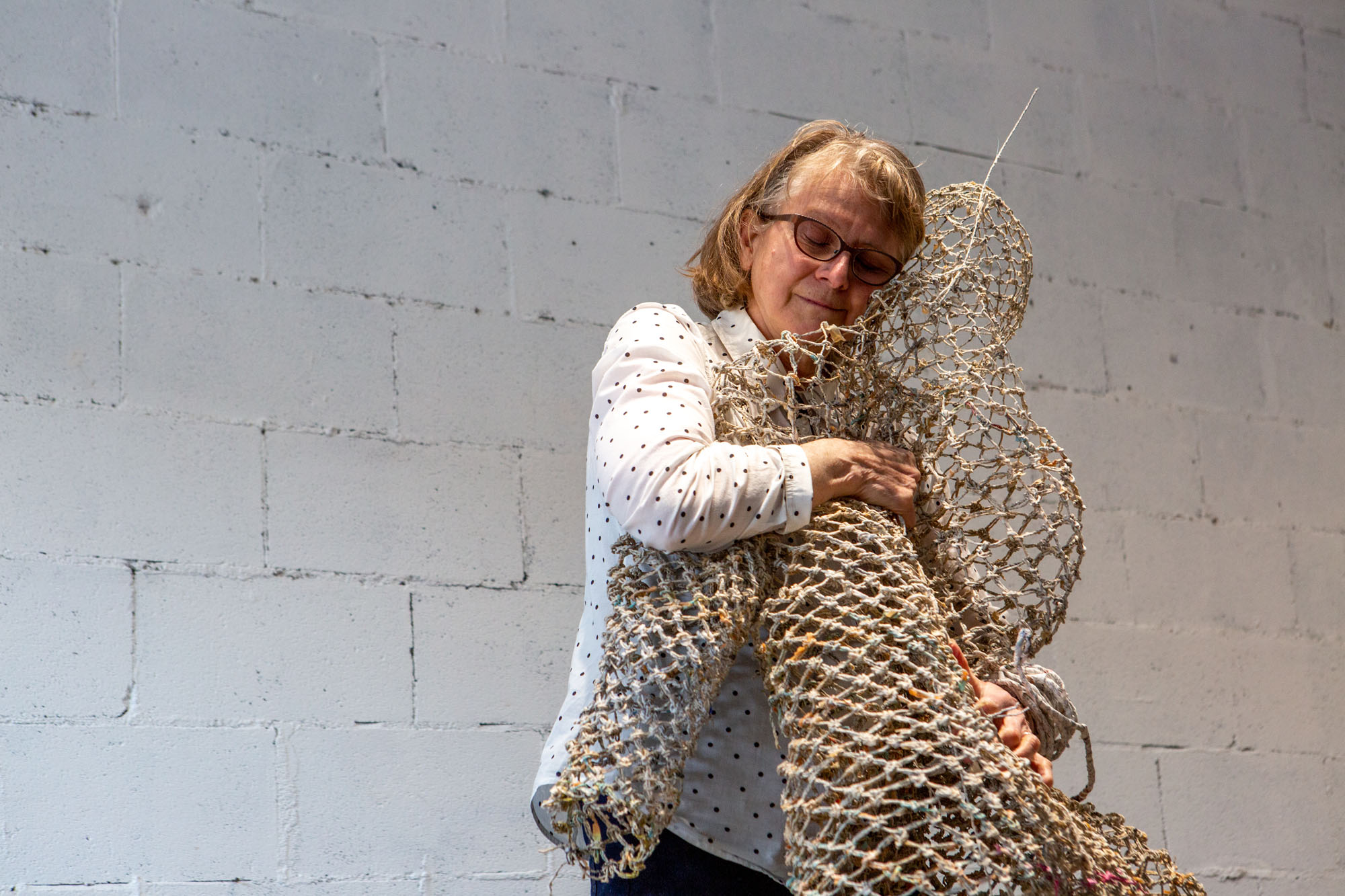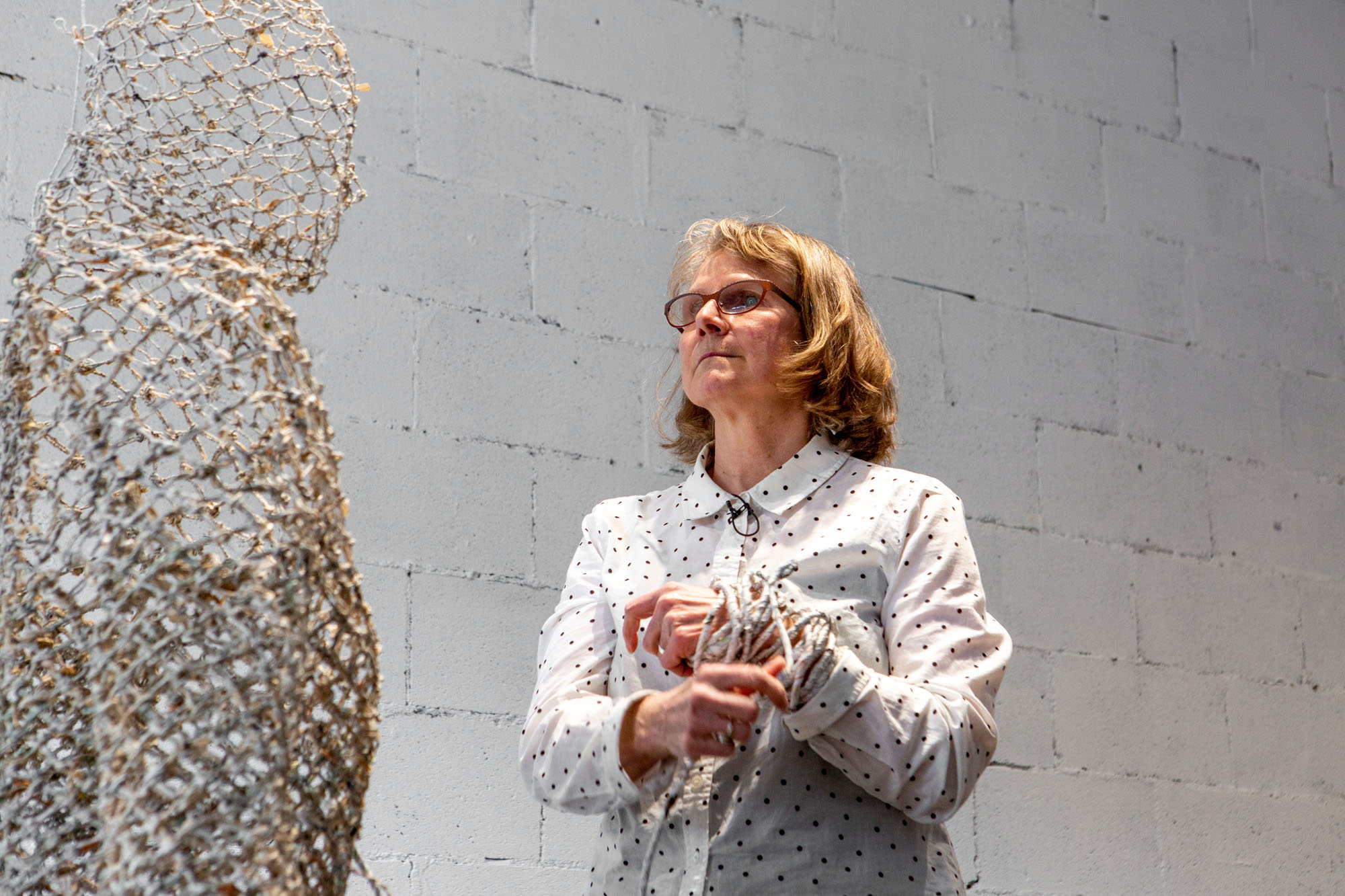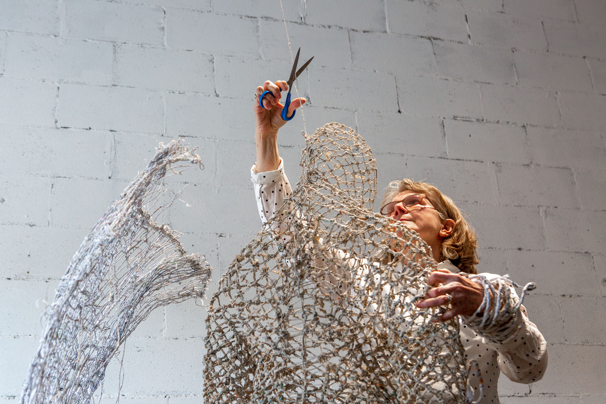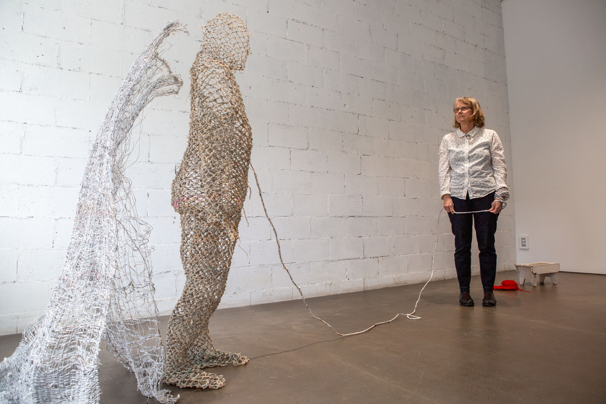 … and room in the bag of stars is a group exhibition that presents works produced in the context of the inaugural PHI MONTRÉAL residency, launched by PHI and carried out in the summer of 2021. The five laureates of this edition of the residency, kimura byol-nathalie lemoine, Salima Punjani, Dominique Sirois, Santiago Tamayo Soler and Karen Trask, proposed projects in response to a theme inspired by the work of science-fiction author Ursula K. Le Guin. It was an invitation, after a moment of prolonged social isolation, to imagine spaces, temporalities, conditions, or systems where we can all get together, again. (source: press release Centre Phi) For the exhibition Karen Trask presented Hanging by a Thread / Ne tenir qu’à un fil, which was a work in two parts: a sculpture of a life-size figure constructed of paper threads crystallized