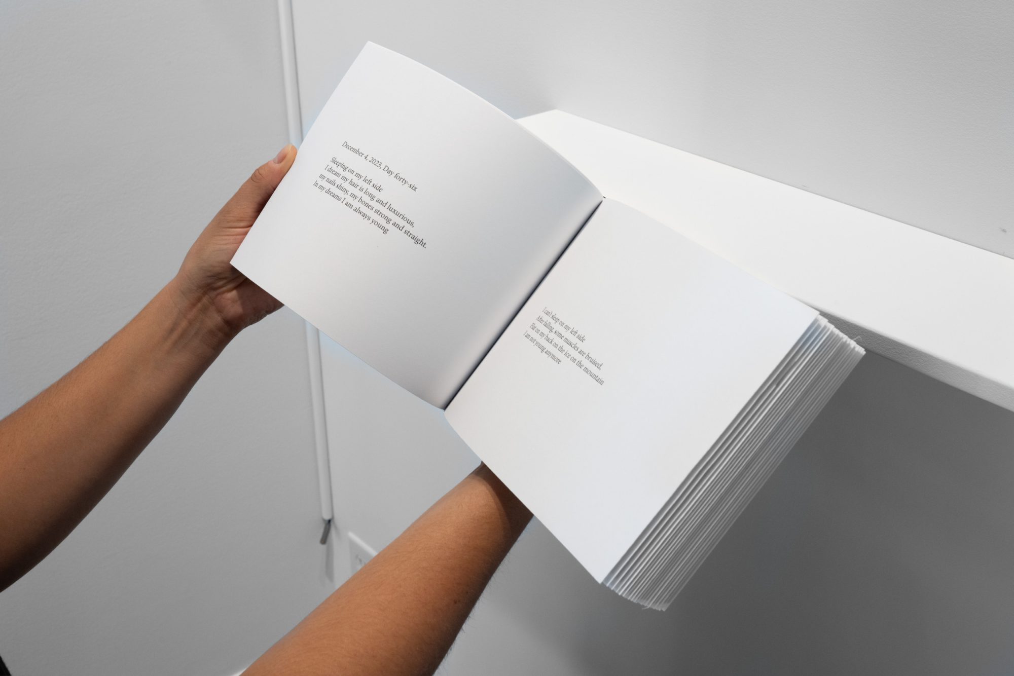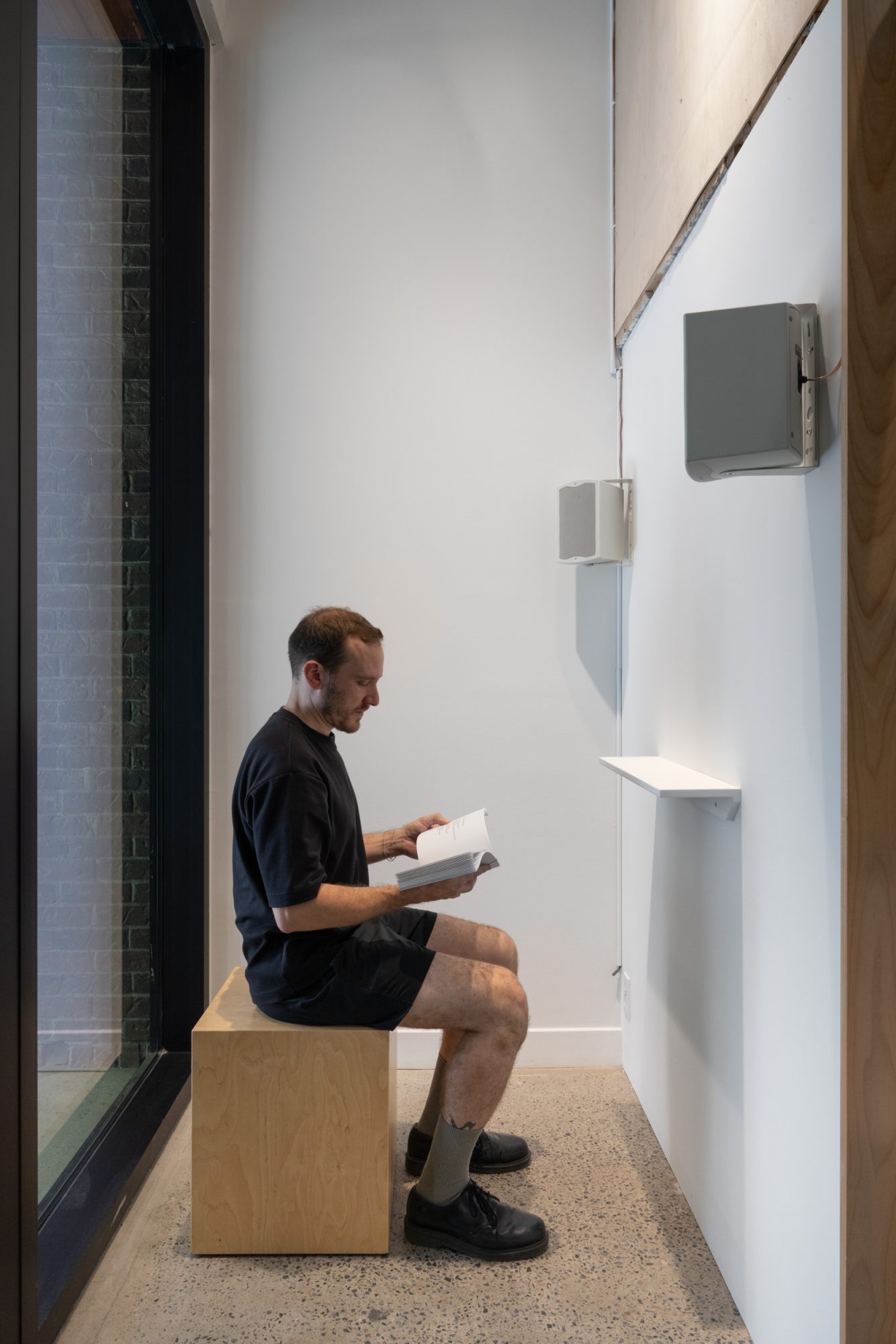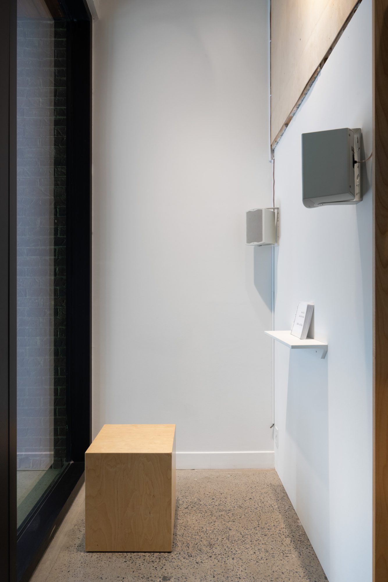 Audio installation with two speakers. The artists read a selection of their exchange of over 200 poems. A printed version of the selected poems is placed on a shelf available for the view to consult while listening.