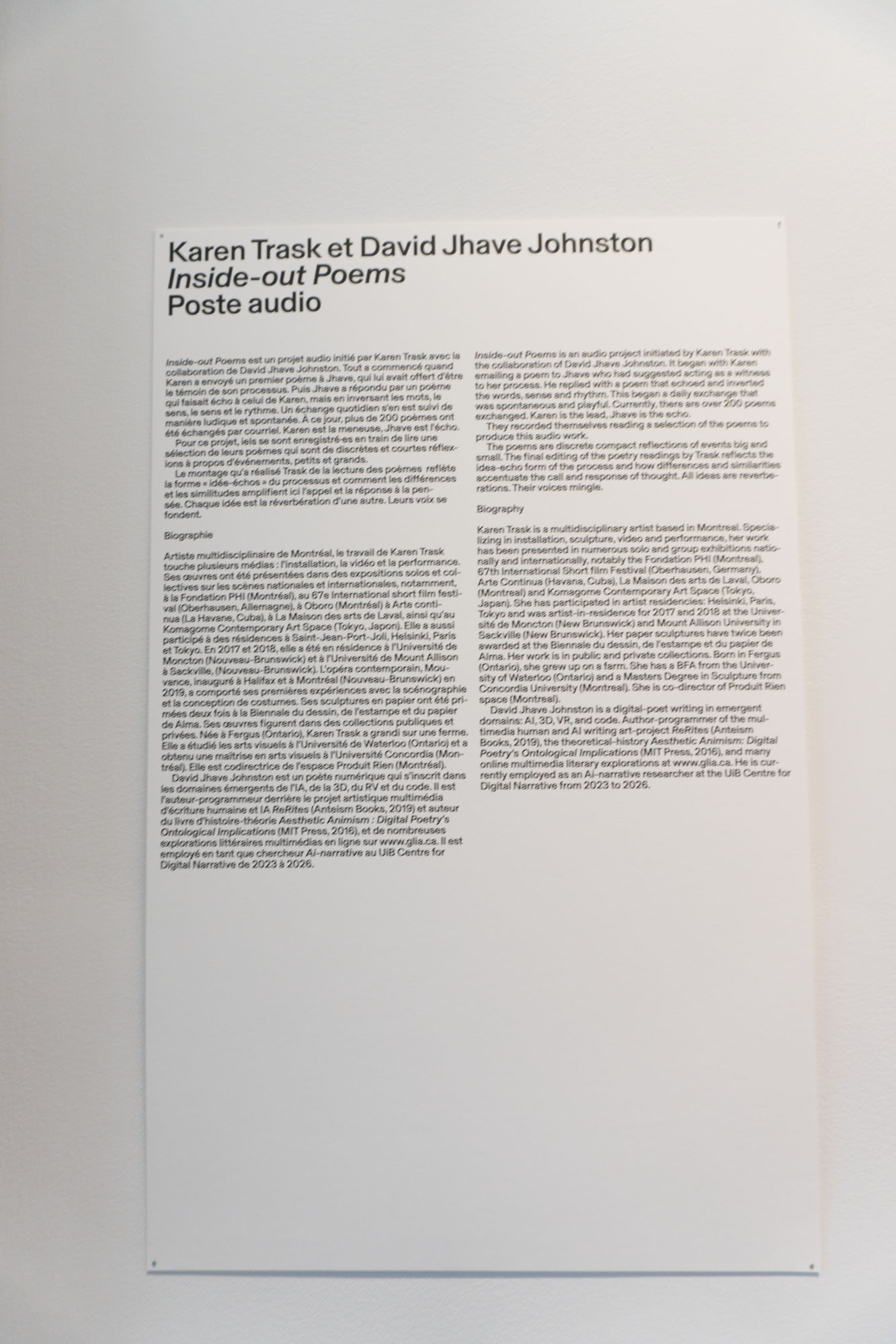 Inside-out Poems est un projet audio initié par Karen Trask avec la collaboration de David Jhave Johnston. Tout a commencé quand Karen a courriellé un premier poème à Jhave, qui lui avait offert d’être le témoin de son processus. Puis Jhave a répondu par un poème qui faisait écho à celui de Karen, mais en n’en inversant les mots, le sens et le rythme. Un échange quotidien s’en est suivi de manière ludique et spontanée. À ce jour, plus de 200 poèmes ont été échangés par courriel. Karen est la meneuse, Jhave est l’écho.