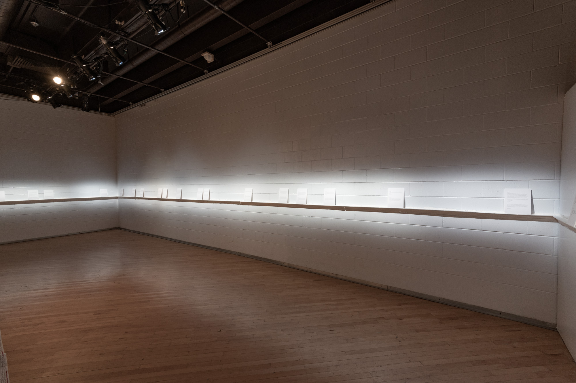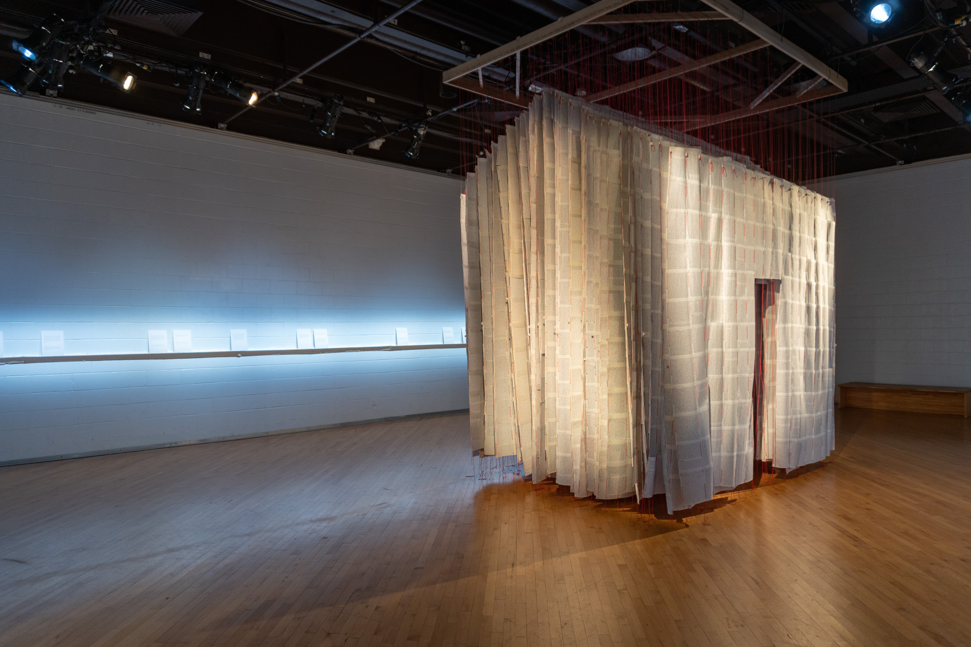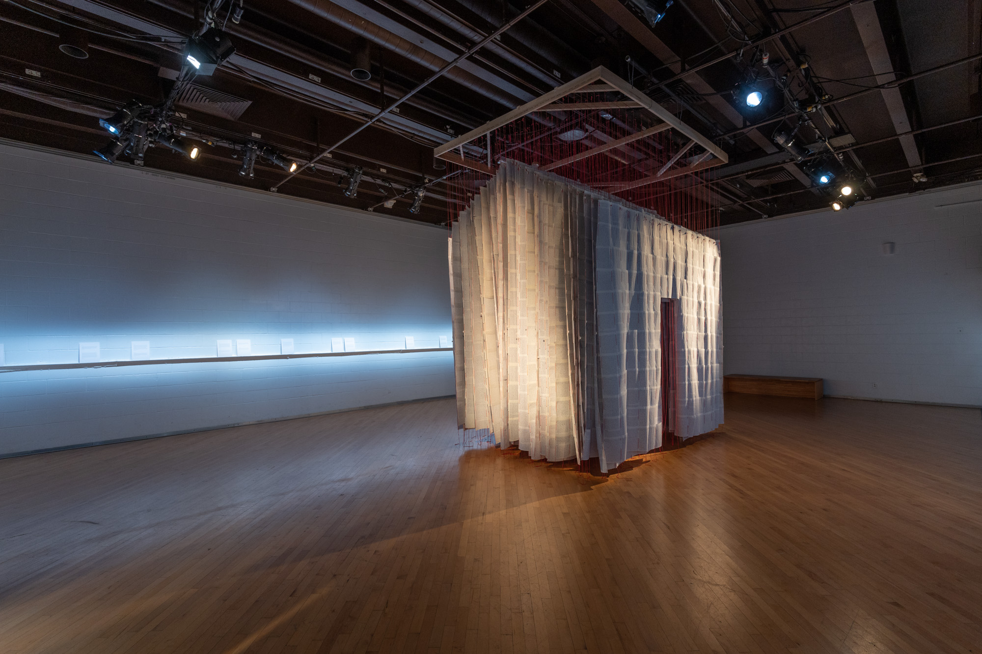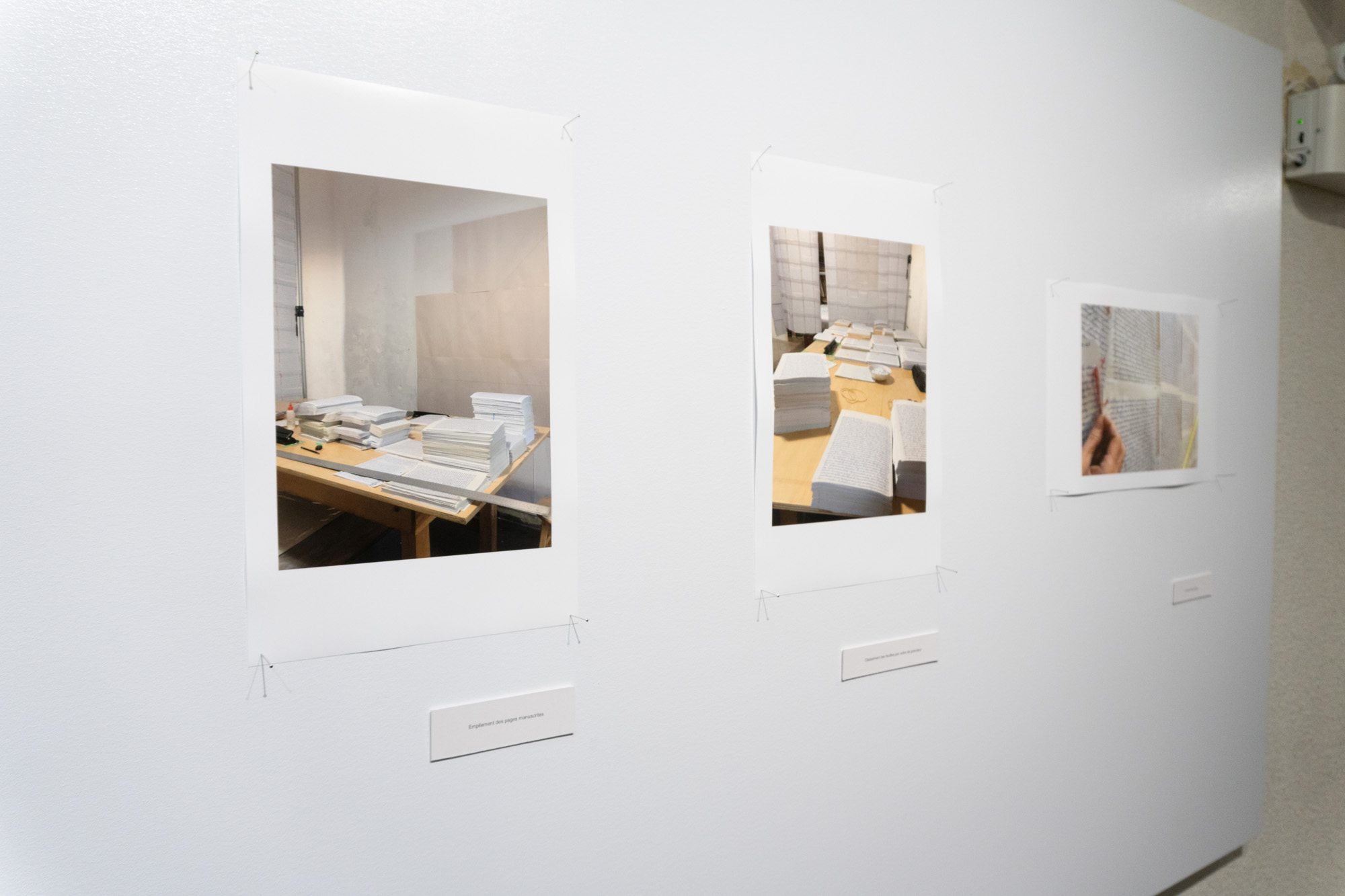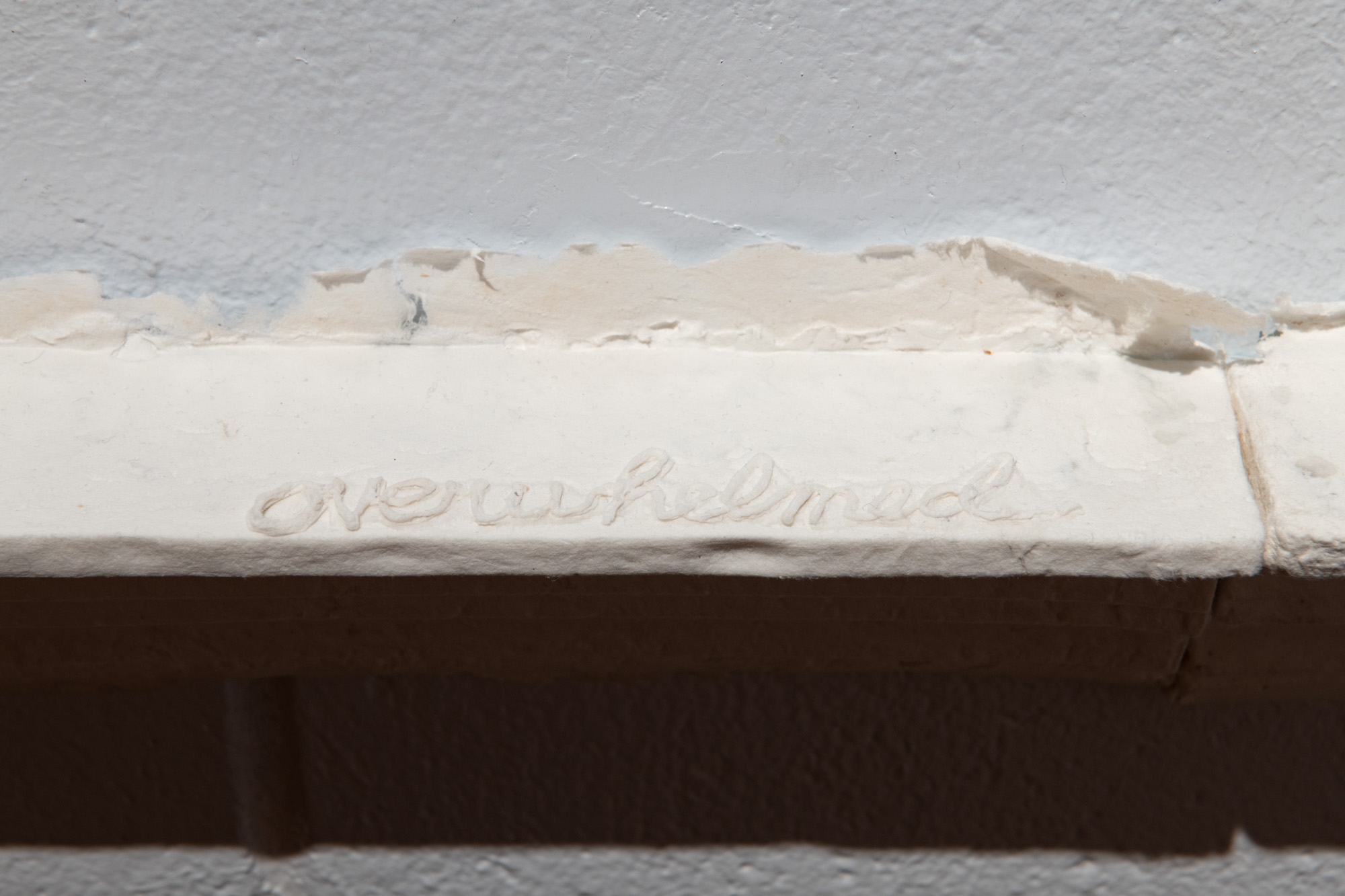 Maison de rêves is a collaborative installation between Karen Trask and Réjane Bougé. It has two parts: a house shape suspended in the middle of the gallery and a series of cast-paper shelves installed on the gallery walls. The house is made of some 40 large panels, each approximately 12 x 13 feet. The panels are suspended just above the floor in the form of a house with a peaked roof. The pages that make up the house are all original texts from 30 years of author Réjane Bougé’s stream of consciousness dream journals. They are written in a neat cursive script with a ballpoint pen. Attached to the walls in the space of the installation are a series of cast-paper corniche-style shelves, each approximately 6 feet in length. On these are placed pages glued to foam core panels. On