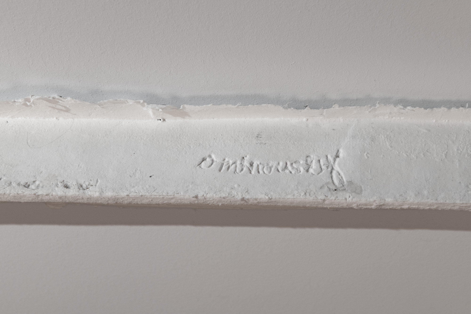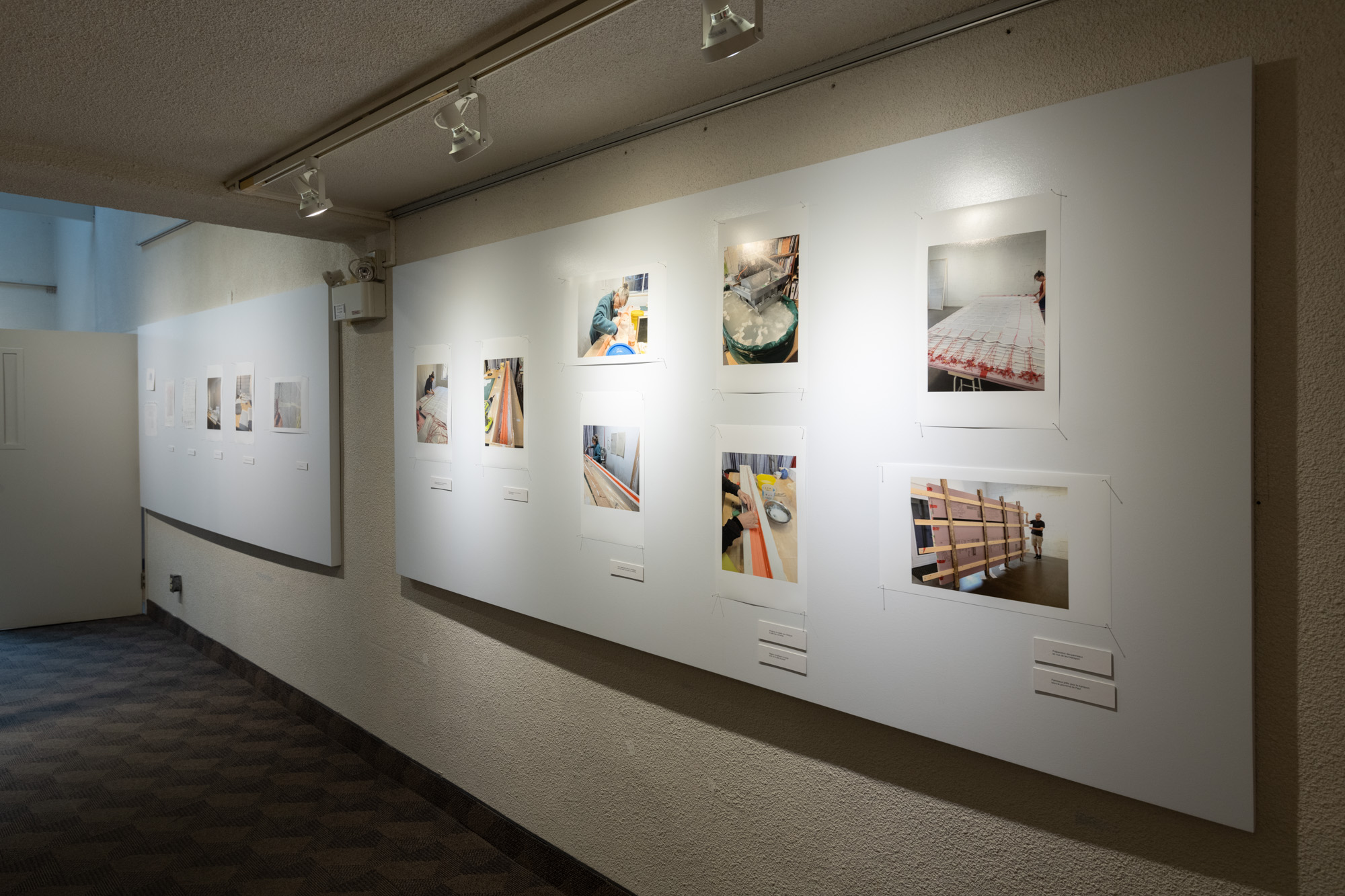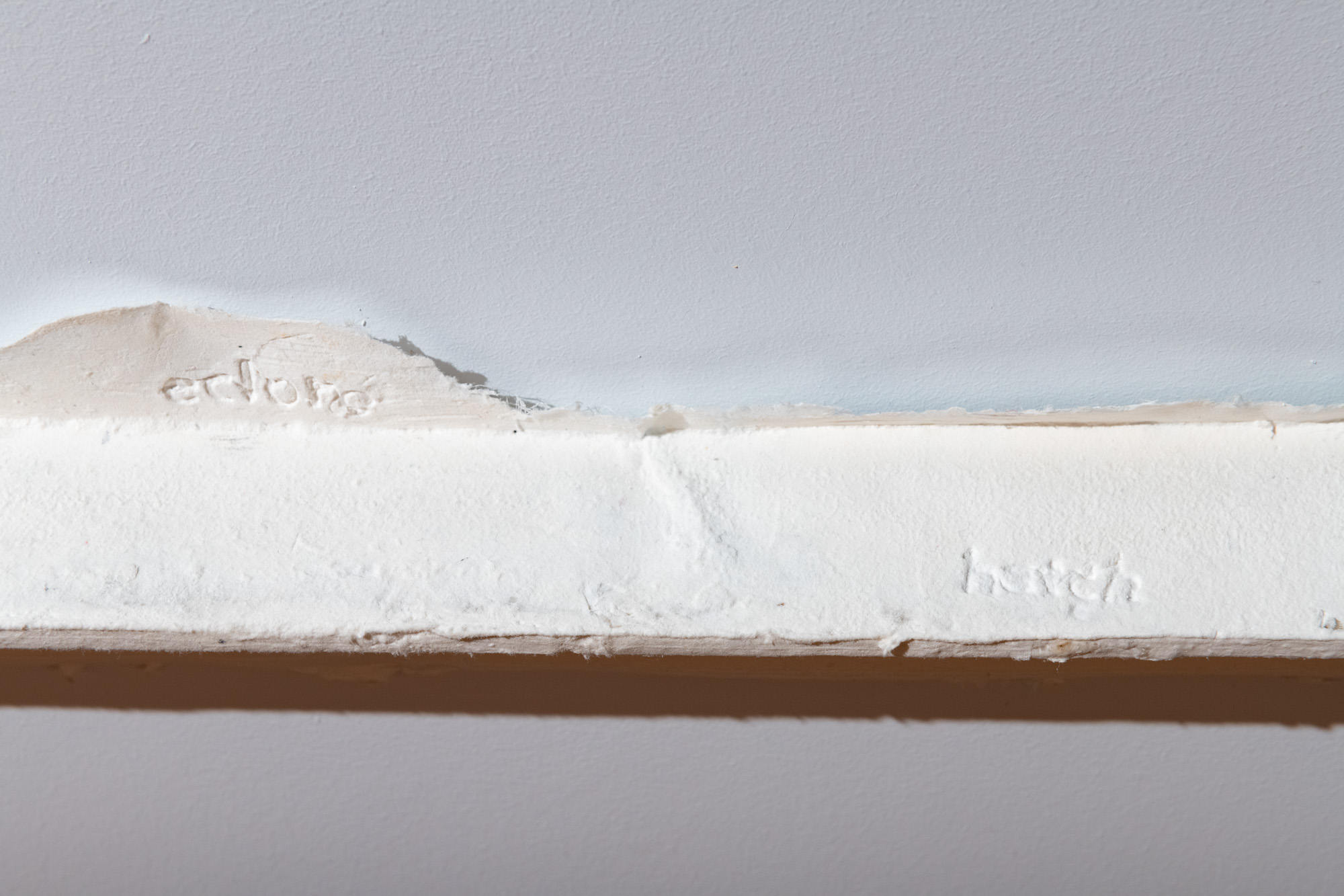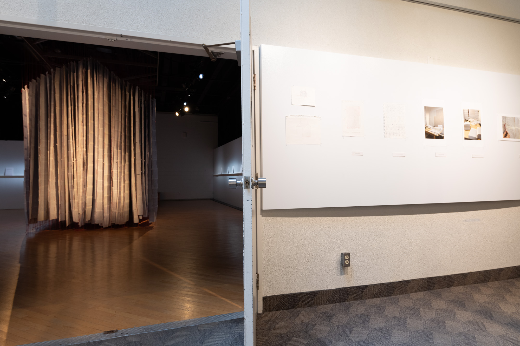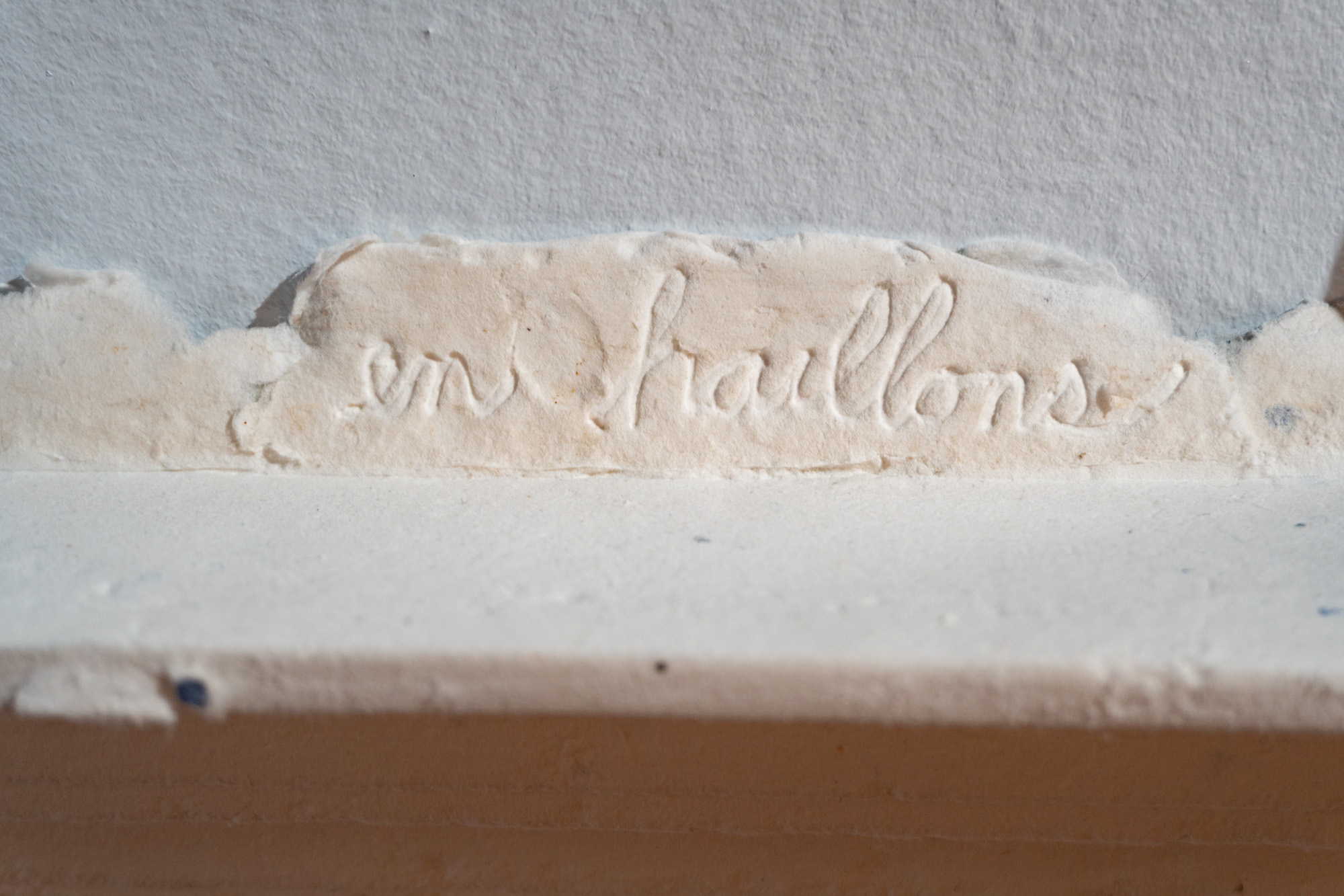 Maison de rêves is a collaborative installation between Karen Trask and Réjane Bougé. It has two parts: a house shape suspended in the middle of the gallery and a series of cast-paper shelves installed on the gallery walls. The house is made of some 40 large panels, each approximately 12 x 13 feet. The panels are suspended just above the floor in the form of a house with a peaked roof. The pages that make up the house are all original texts from 30 years of author Réjane Bougé’s stream of consciousness dream journals. They are written in a neat cursive script with a ballpoint pen. Attached to the walls in the space of the installation are a series of cast-paper corniche-style shelves, each approximately 6 feet in length. On these are placed pages glued to foam core panels. On