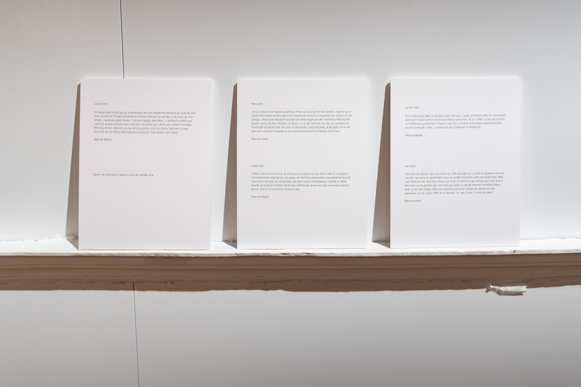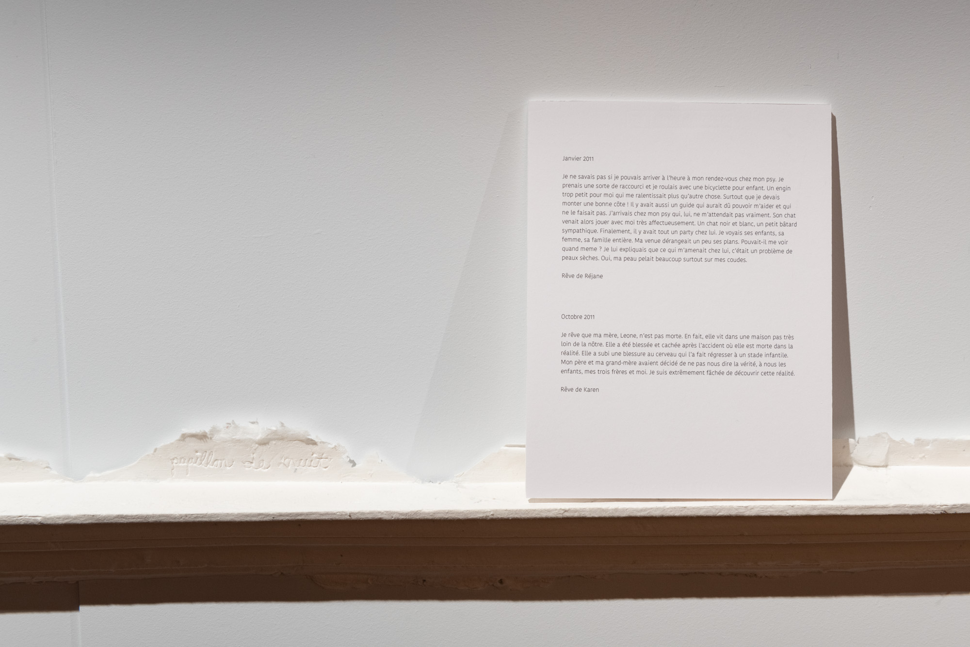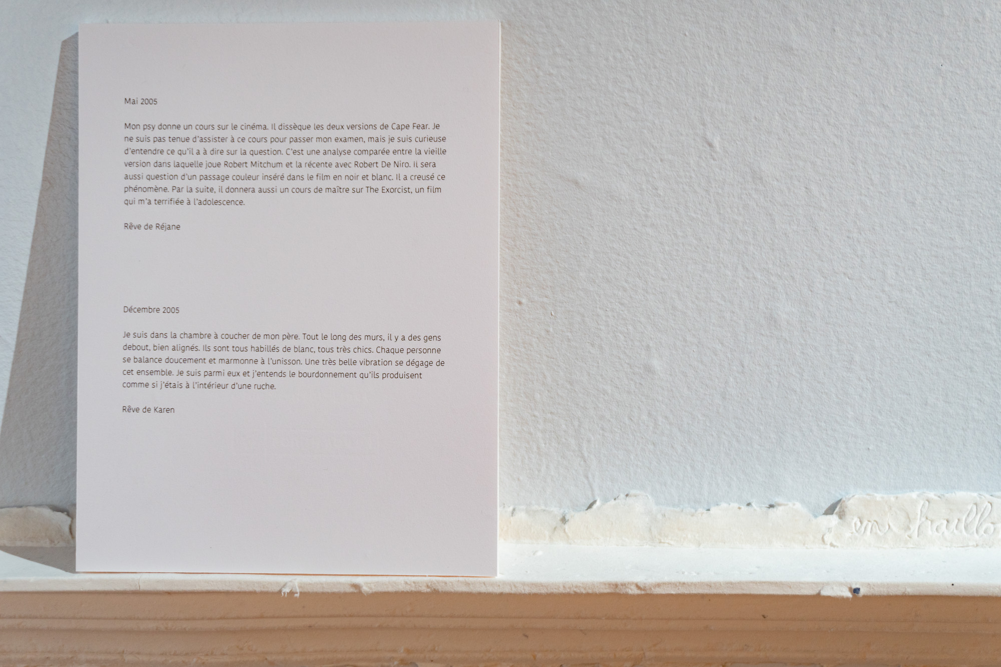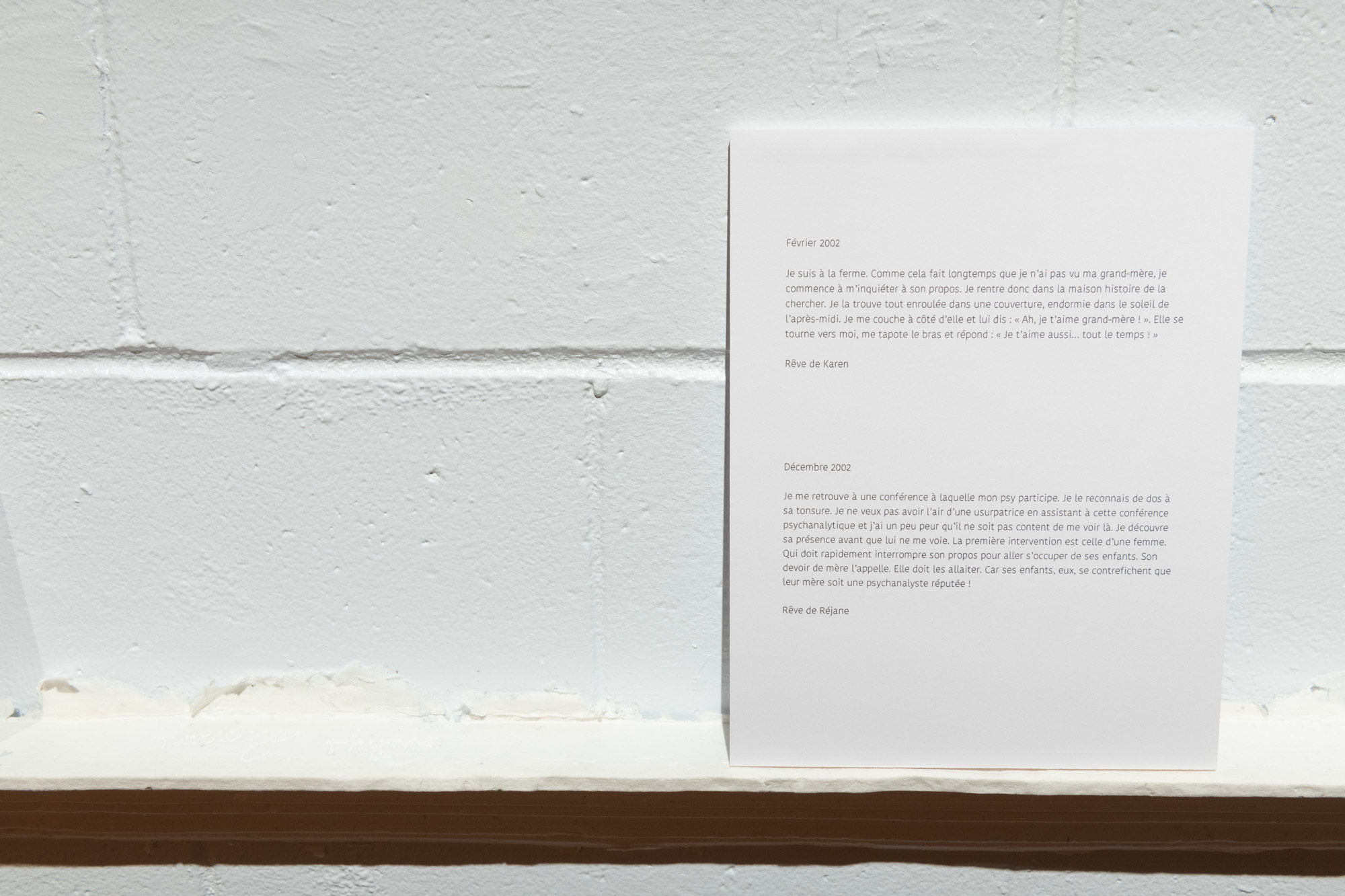 Pour Karen, le papier est un matériau fondamental, pour Réjane, ce sont les mots. En utilisant les pages manuscrites des cahiers de rêves de Réjane que celle-ci écrit depuis plus de trente ans, soit plus de 8 000 feuilles, Karen a construit une maison de rêves en papier. Le travail patient et répétitif qu’a exigé la fabrication de cette sculpture/installation fait ici écho à la discipline quotidienne d’écriture de Réjane tout en la matérialisant.