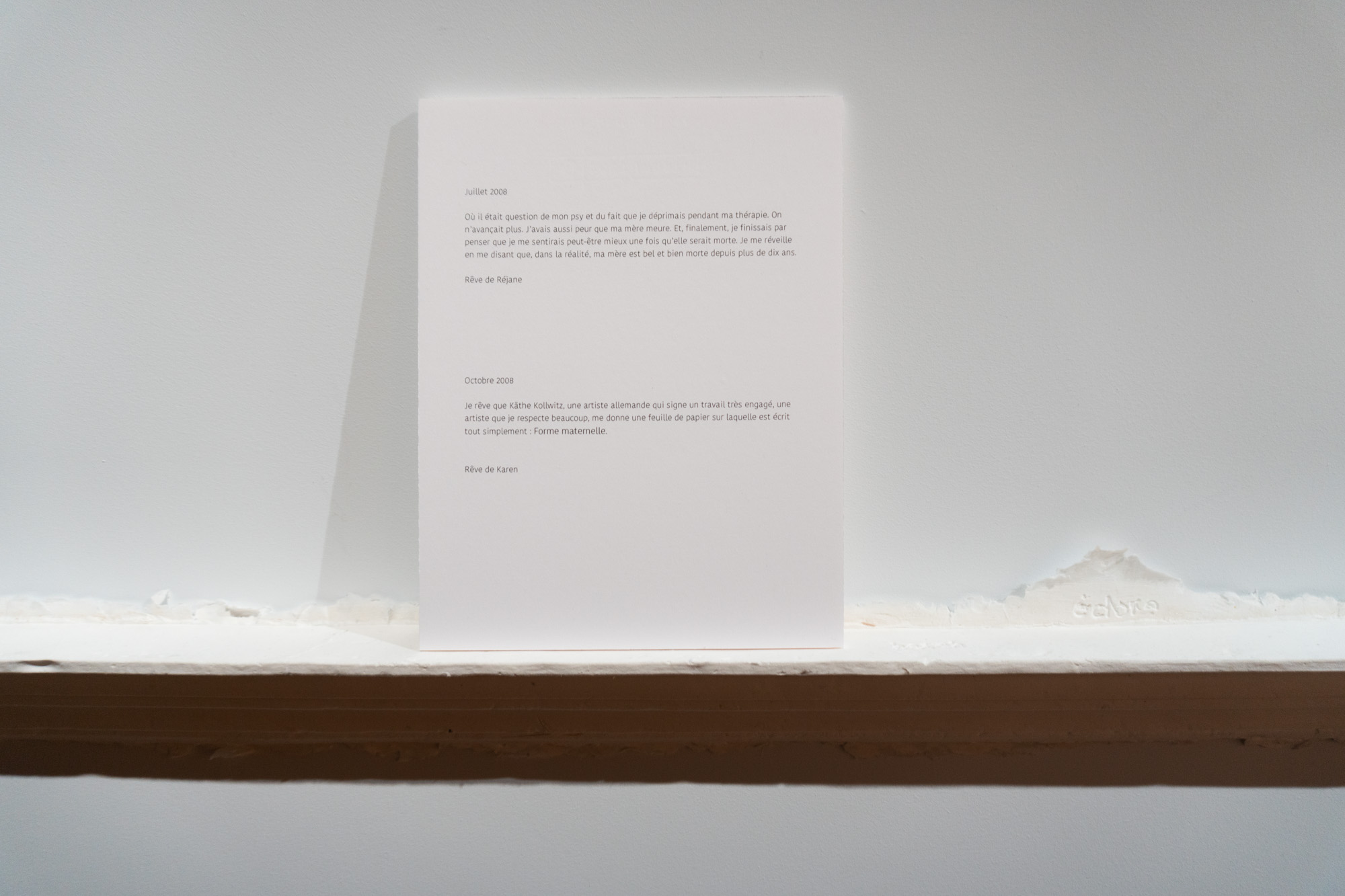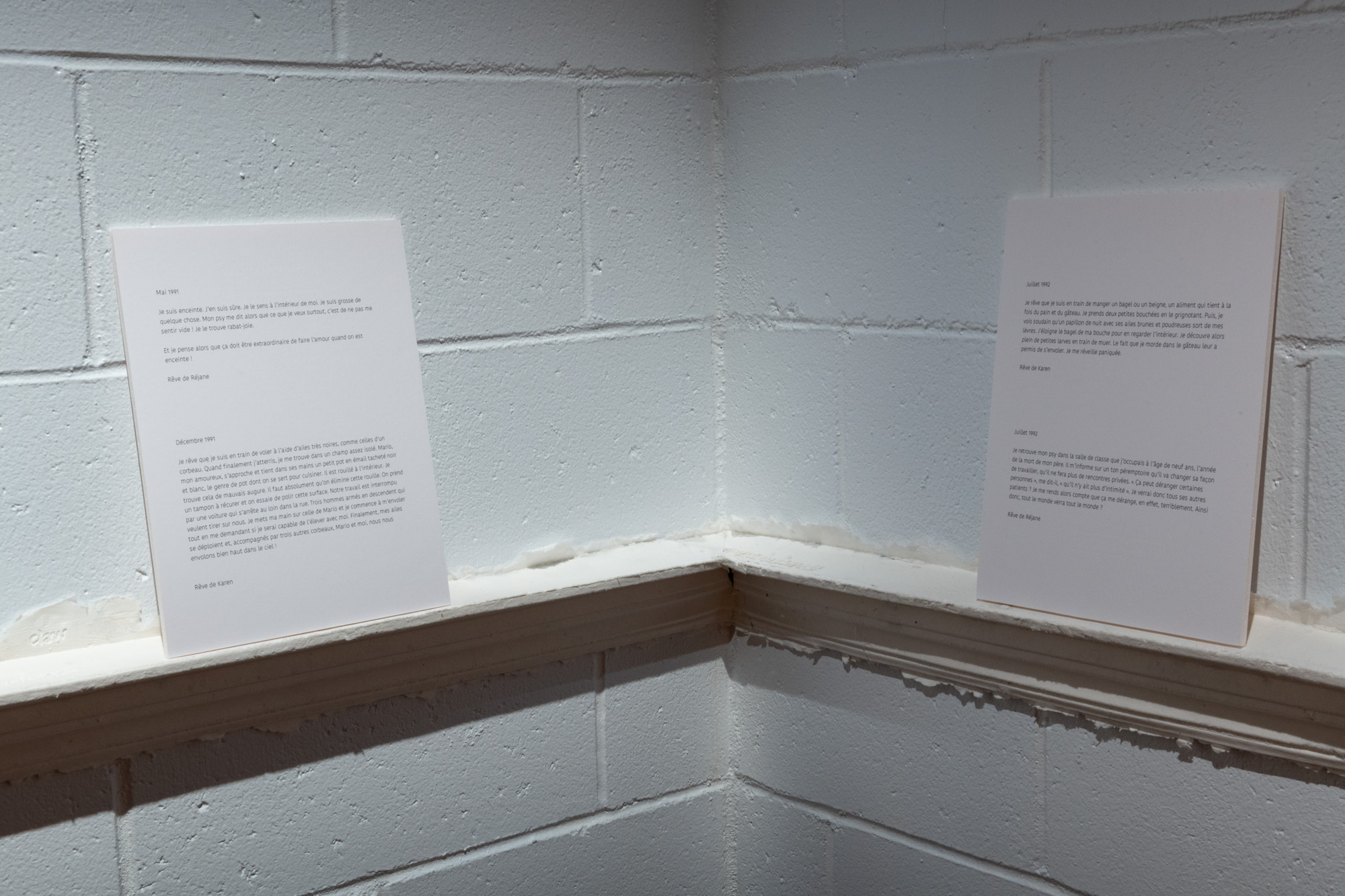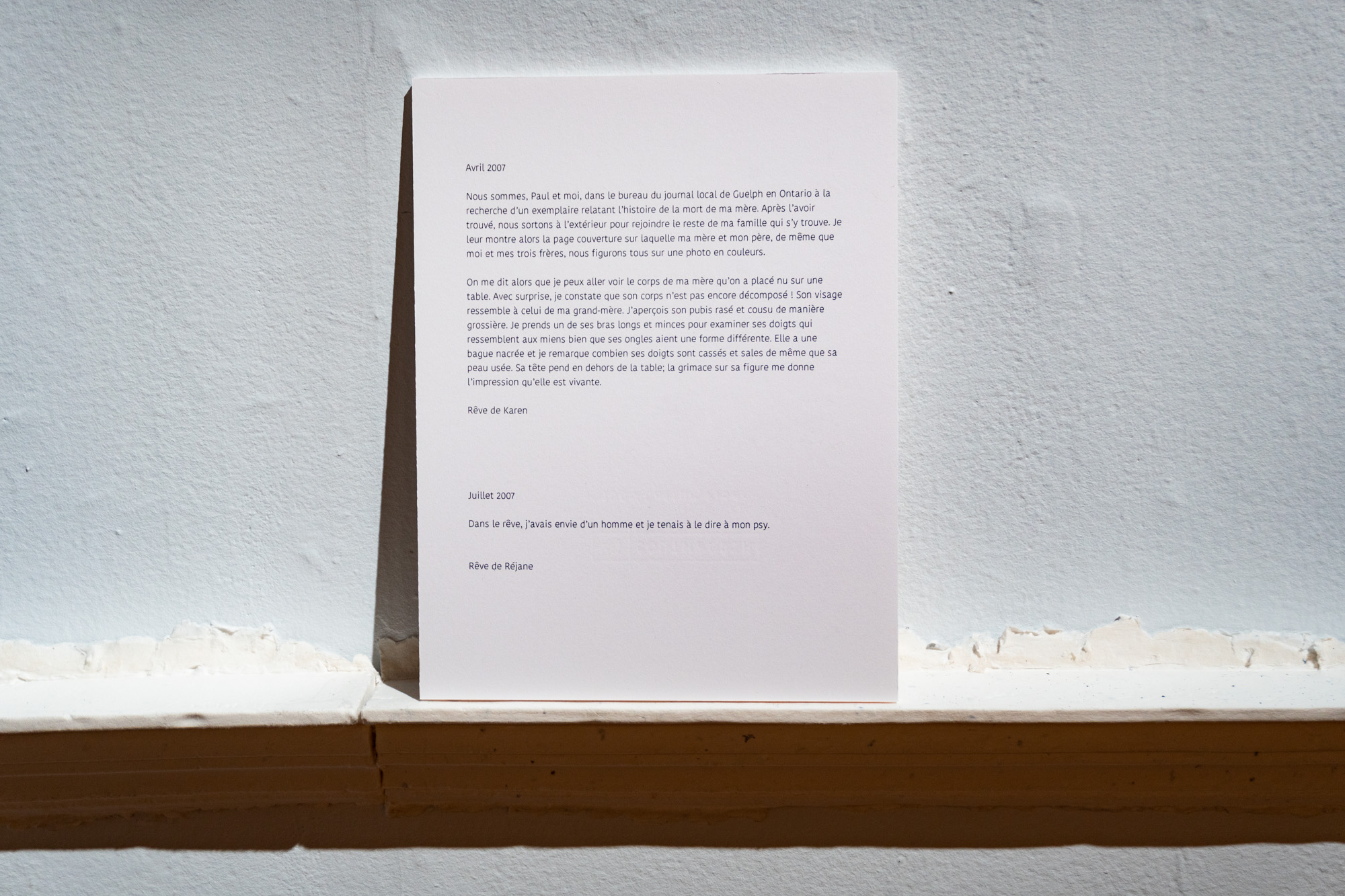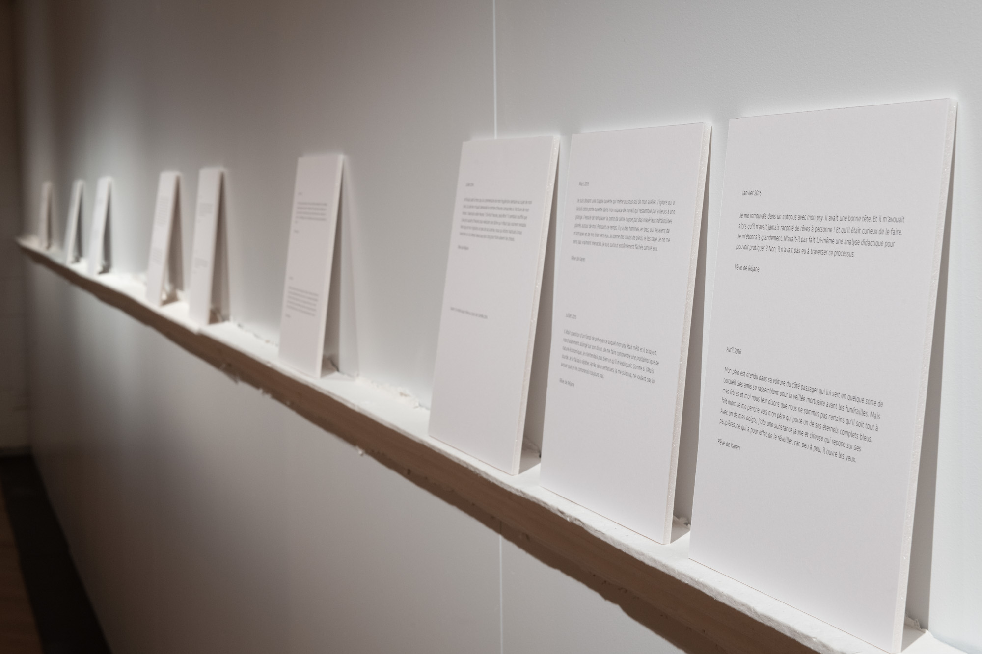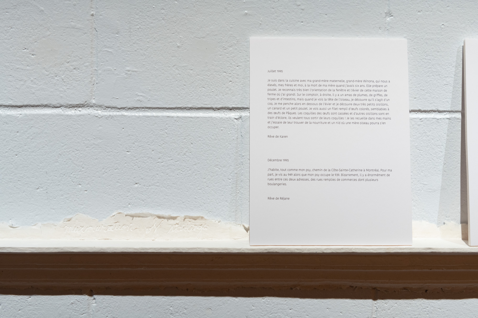 Pour Karen, le papier est un matériau fondamental, pour Réjane, ce sont les mots. En utilisant les pages manuscrites des cahiers de rêves de Réjane que celle-ci écrit depuis plus de trente ans, soit plus de 8 000 feuilles, Karen a construit une maison de rêves en papier. Le travail patient et répétitif qu’a exigé la fabrication de cette sculpture/installation fait ici écho à la discipline quotidienne d’écriture de Réjane tout en la matérialisant.