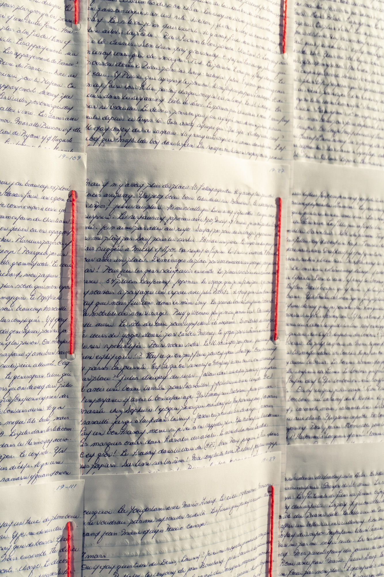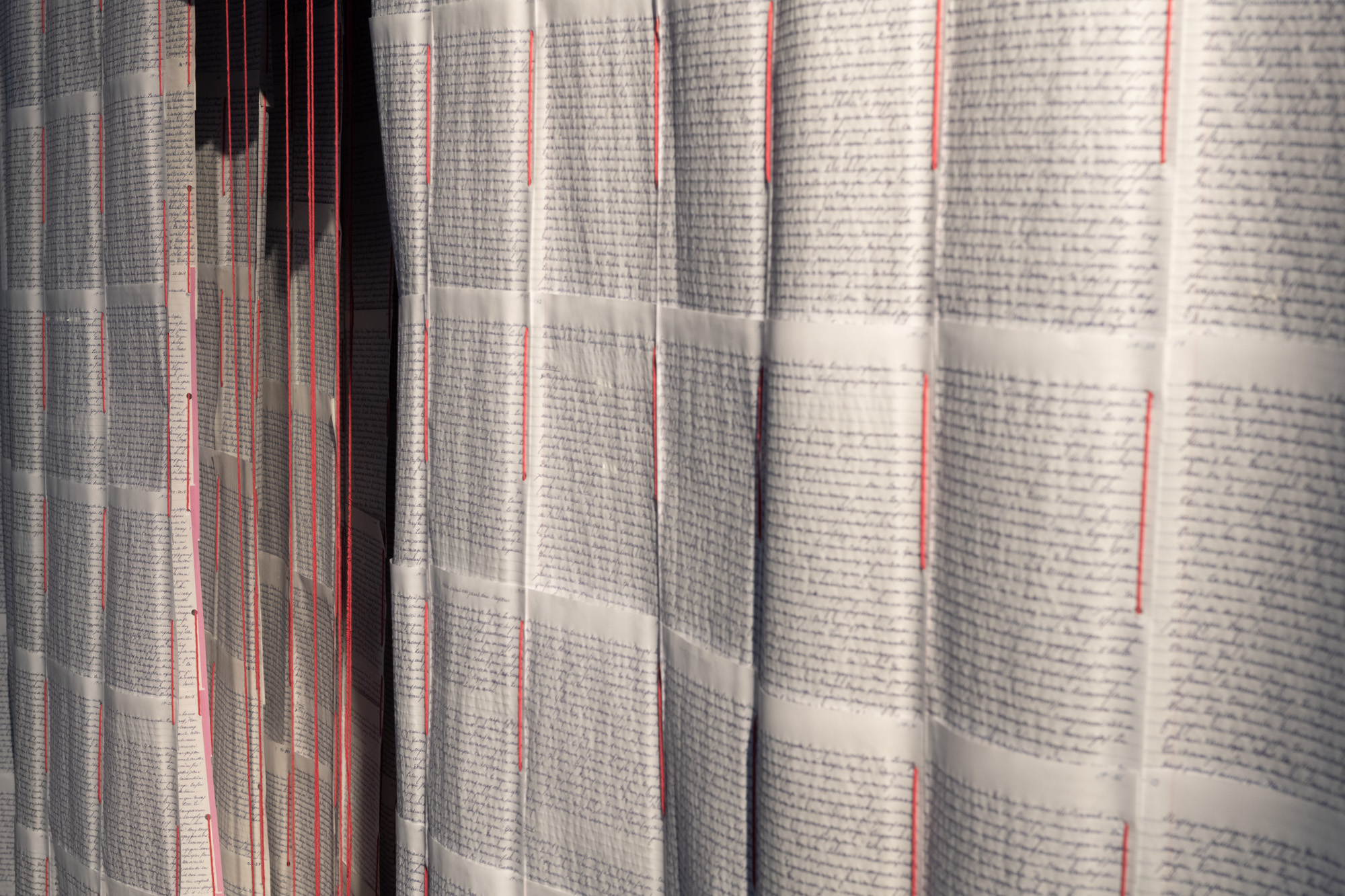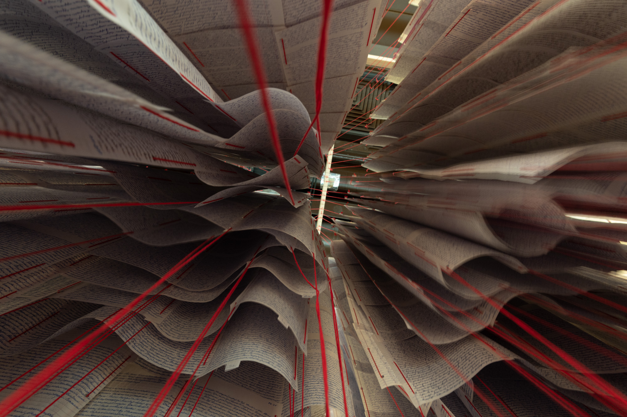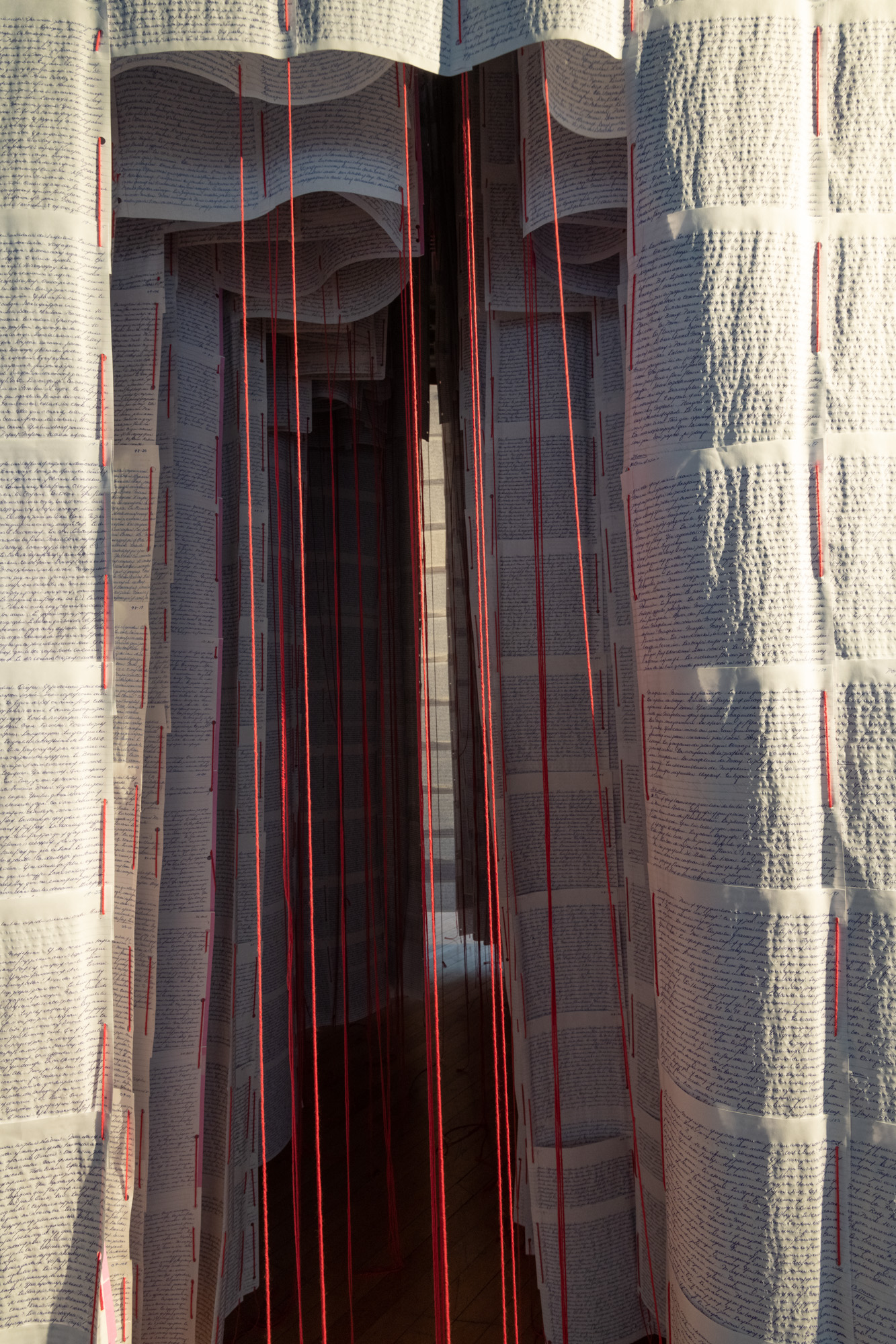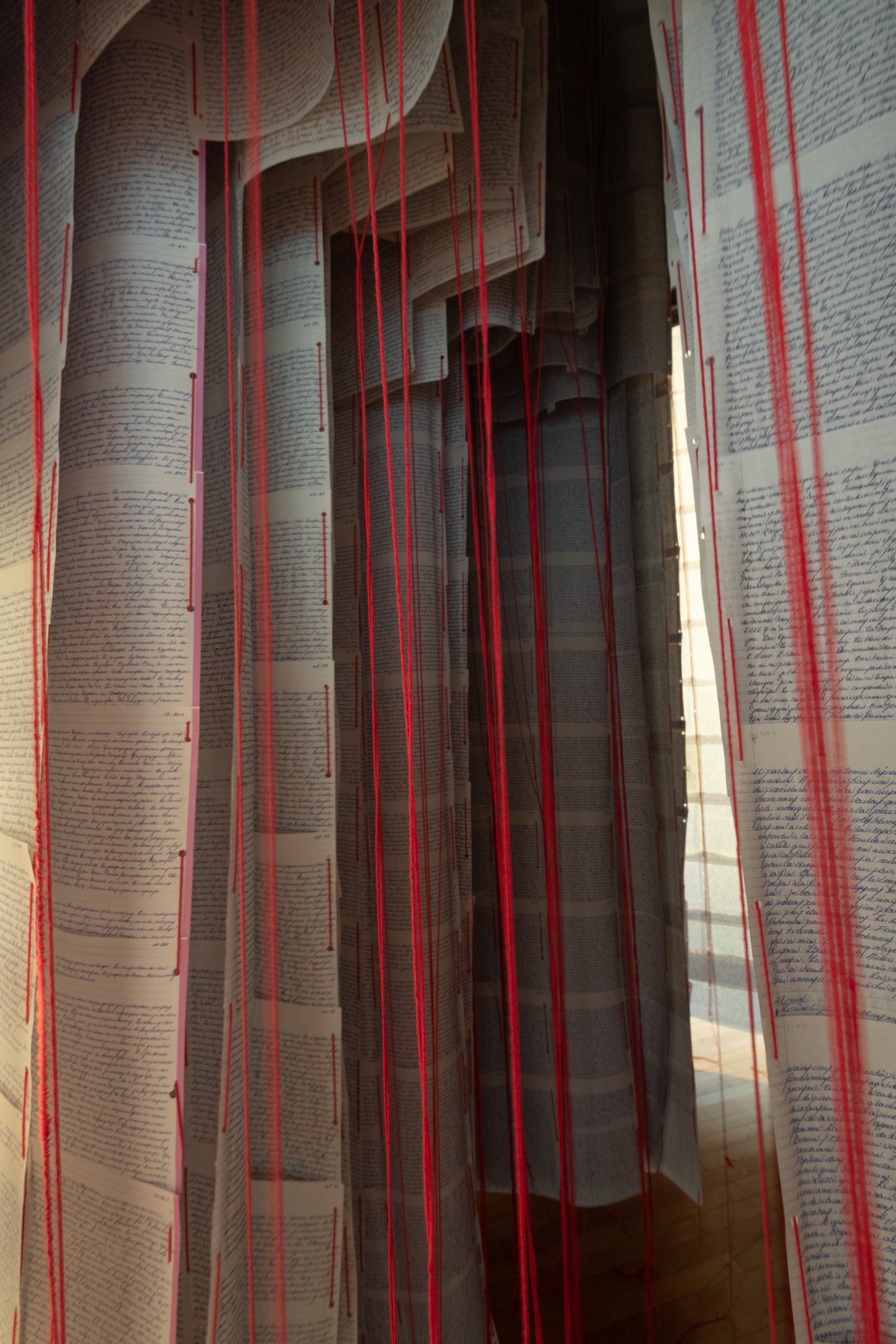 L’idée d’utiliser ces milliers de feuilles pour construire une maison en papier – rien de moins qu’une maison de rêves ! – est rapidement imposé à Karen. Aujourd’hui les visiteurs peuvent circuler autour de cette structure diaphane et flottante. Quant aux feuilles manuscrits suspendues dans l’espace, elles ont été tendues et liées entre elles par des réseaux de fils rouges qui découlent d’une rêve marquant faites par Karen, rêve dans lequel sa grand-mère lui offrait une pelote de fil rouge à Noël. Karen devrait cependant s’en servir pour emballer les présents de ces trois frères cadets. Filiation ? Héritage ? Devoir à accomplir auprès des hommes? Tant de nombreuses mythologies, un être humain, presque toujours une femme, crée l’univers en le tissant. Il y a donc un lien fort entre le tissage, la vie et les femmes. Par ailleurs, le fil rouge représente aussi, comme on le sait, l’idée maîtresse, ce fil qu’on ne peut retirer… sans risquer de découdre toute la structure !
