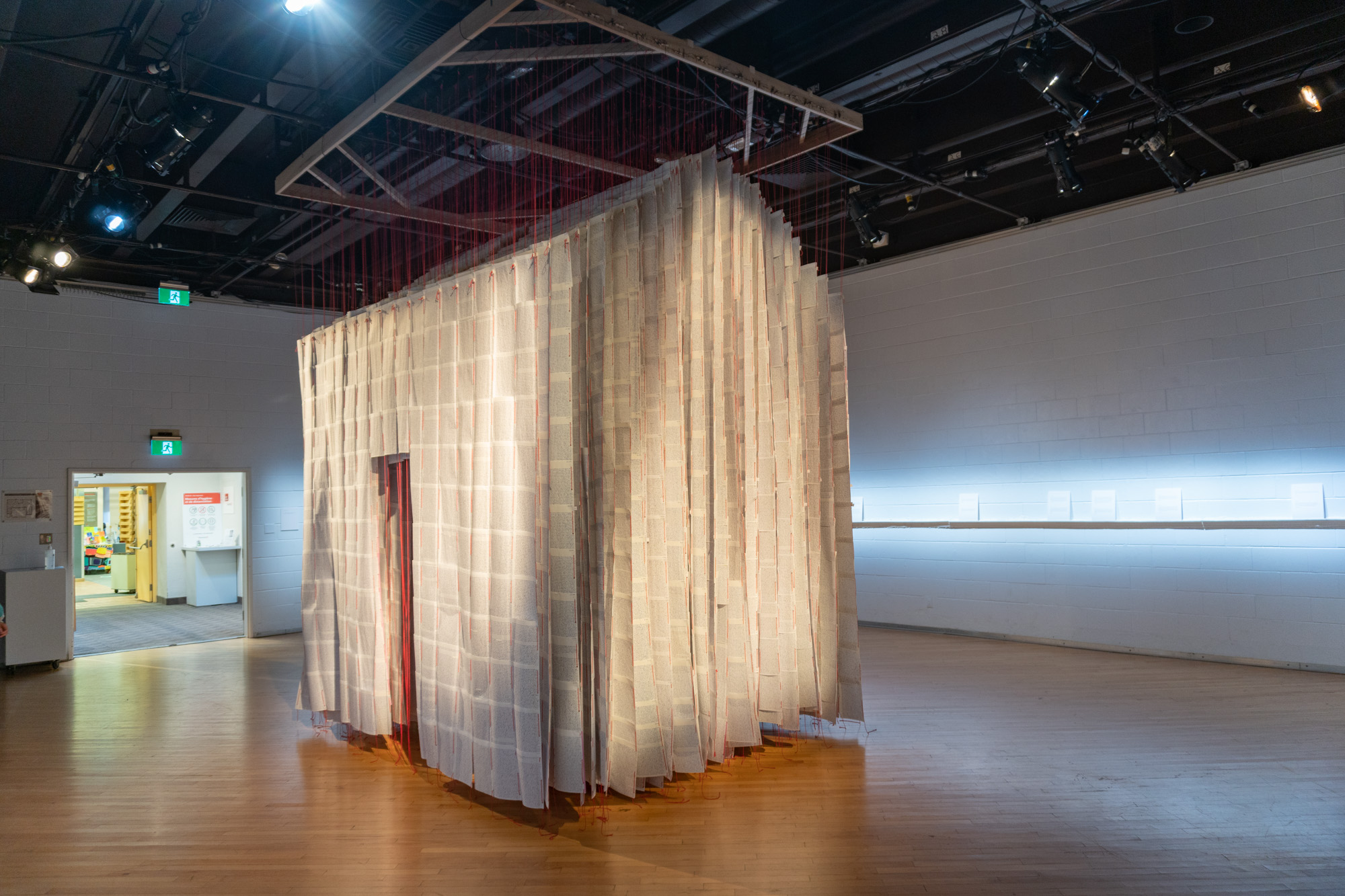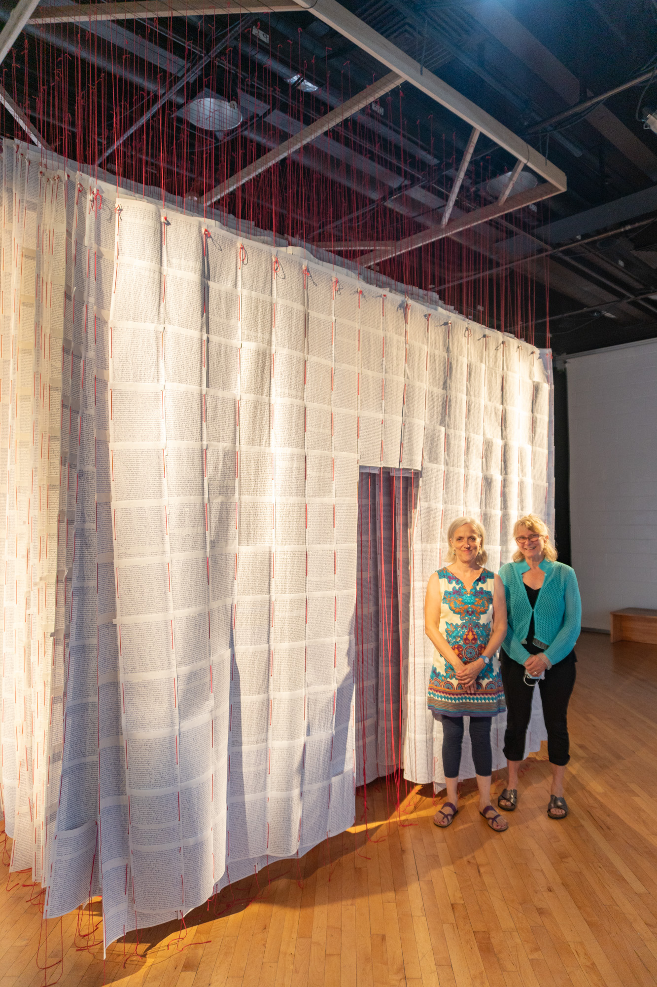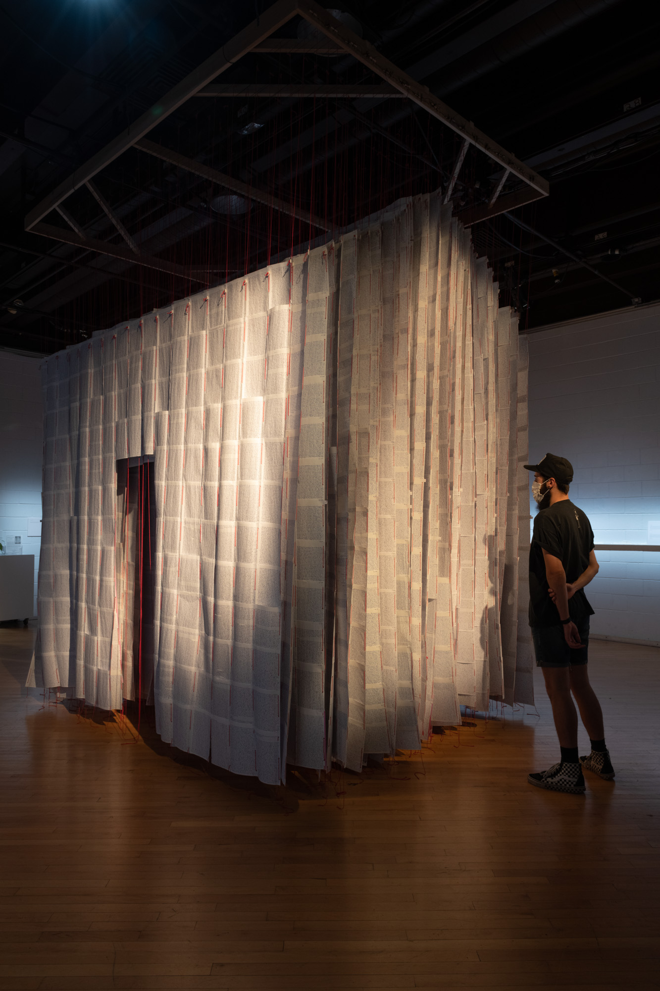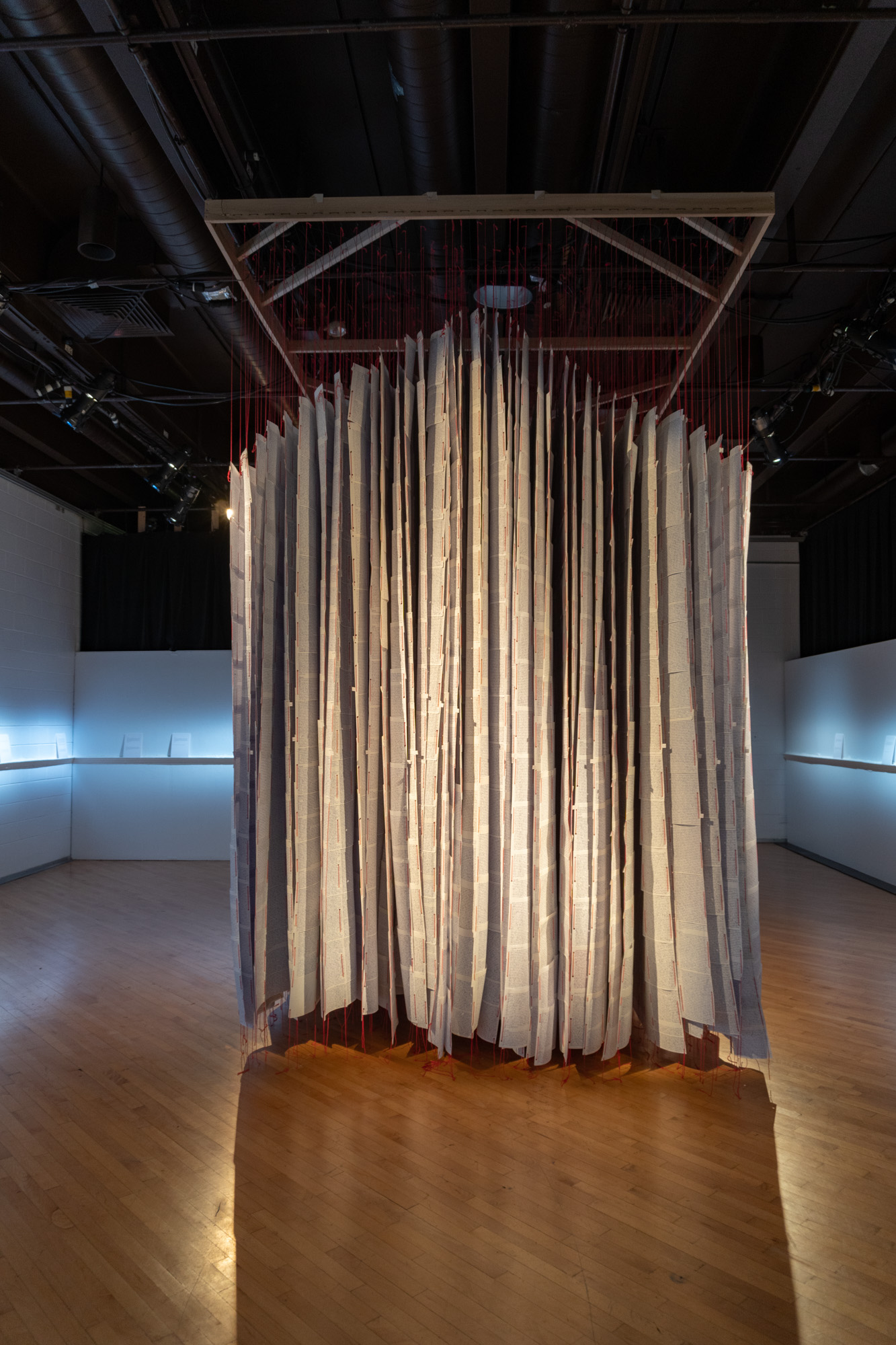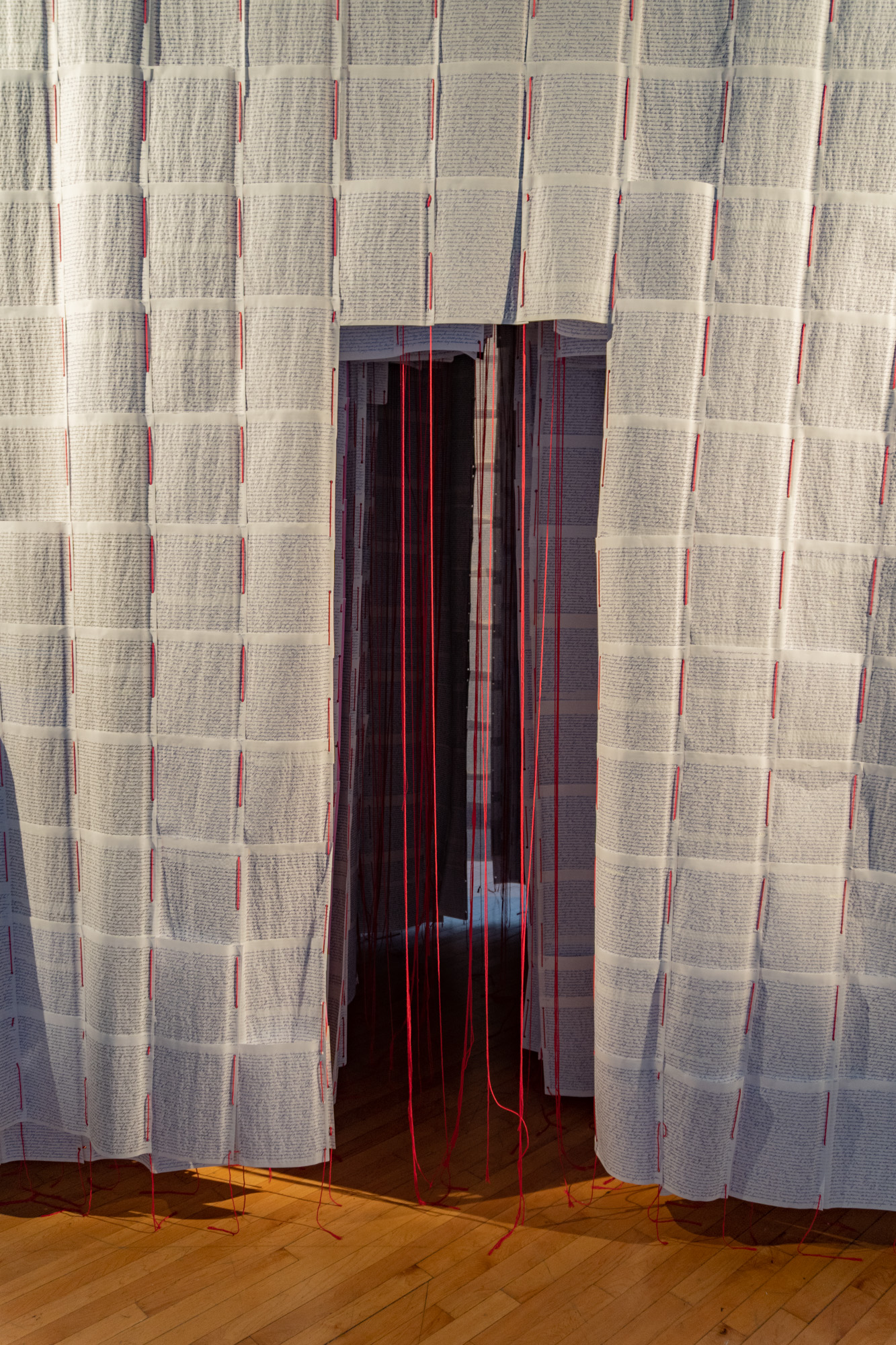L’idée d’utiliser ces milliers de feuilles pour construire une maison en papier – rien de moins qu’une maison de rêves ! – est rapidement imposé à Karen. Aujourd’hui les visiteurs peuvent circuler autour de cette structure diaphane et flottante. Quant aux feuilles manuscrits suspendues dans l’espace, elles ont été tendues et liées entre elles par des réseaux de fils rouges qui découlent d’une rêve marquant faites par Karen, rêve dans lequel sa grand-mère lui offrait une pelote de fil rouge à Noël. Karen devrait cependant s’en servir pour emballer les présents de ces trois frères cadets. Filiation ? Héritage ? Devoir à accomplir auprès des hommes? Tant de nombreuses mythologies, un être humain, presque toujours une femme, crée l’univers en le tissant. Il y a donc un lien fort entre le tissage, la vie et les femmes. Par ailleurs, le fil rouge représente aussi, comme on le sait, l’idée maîtresse, ce fil qu’on ne peut retirer… sans risquer de découdre toute la structure !