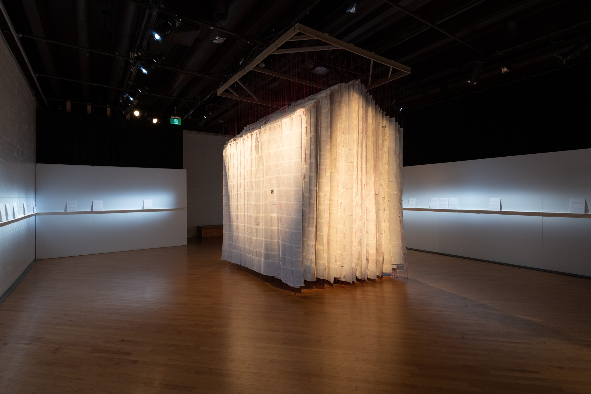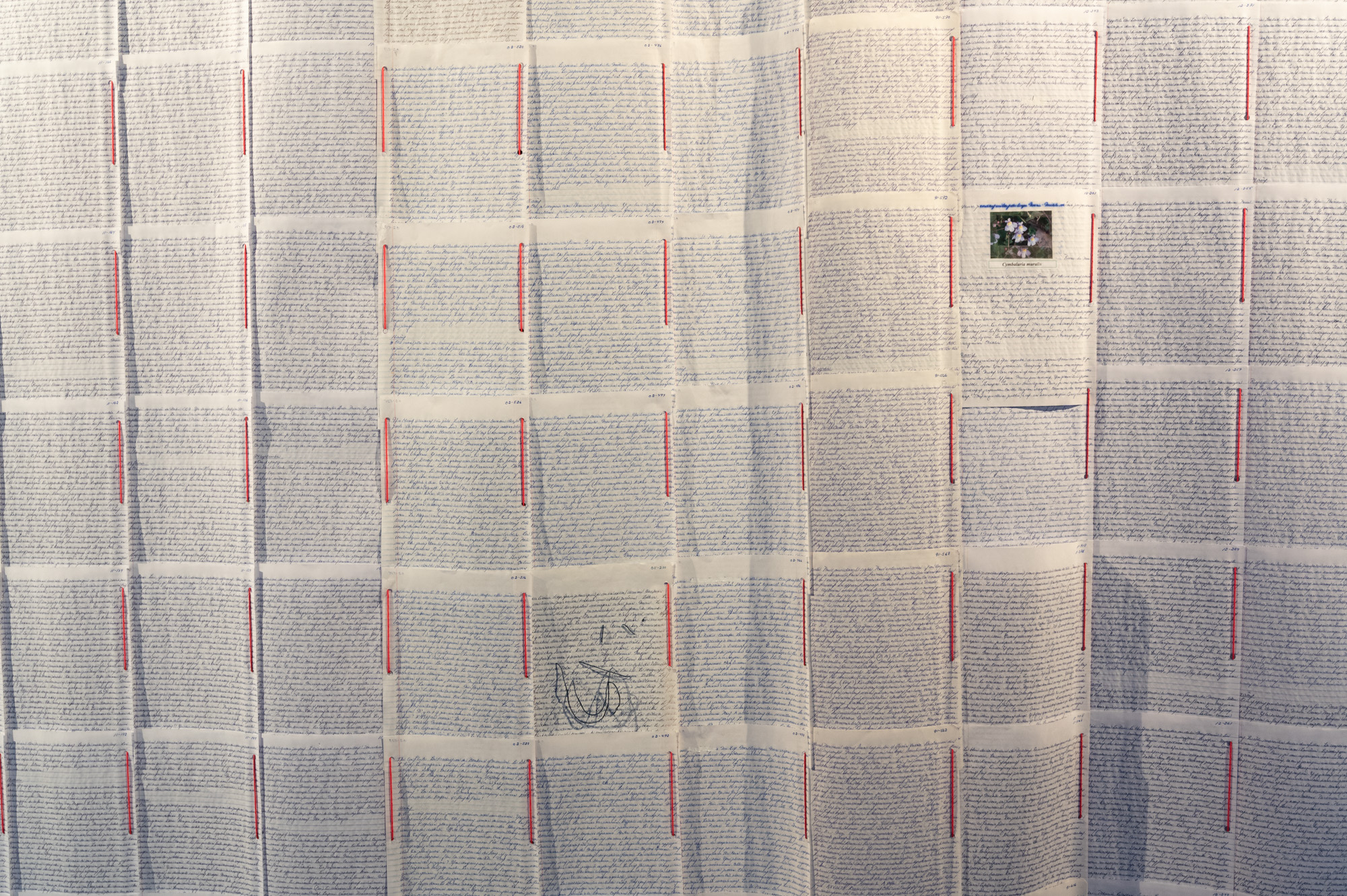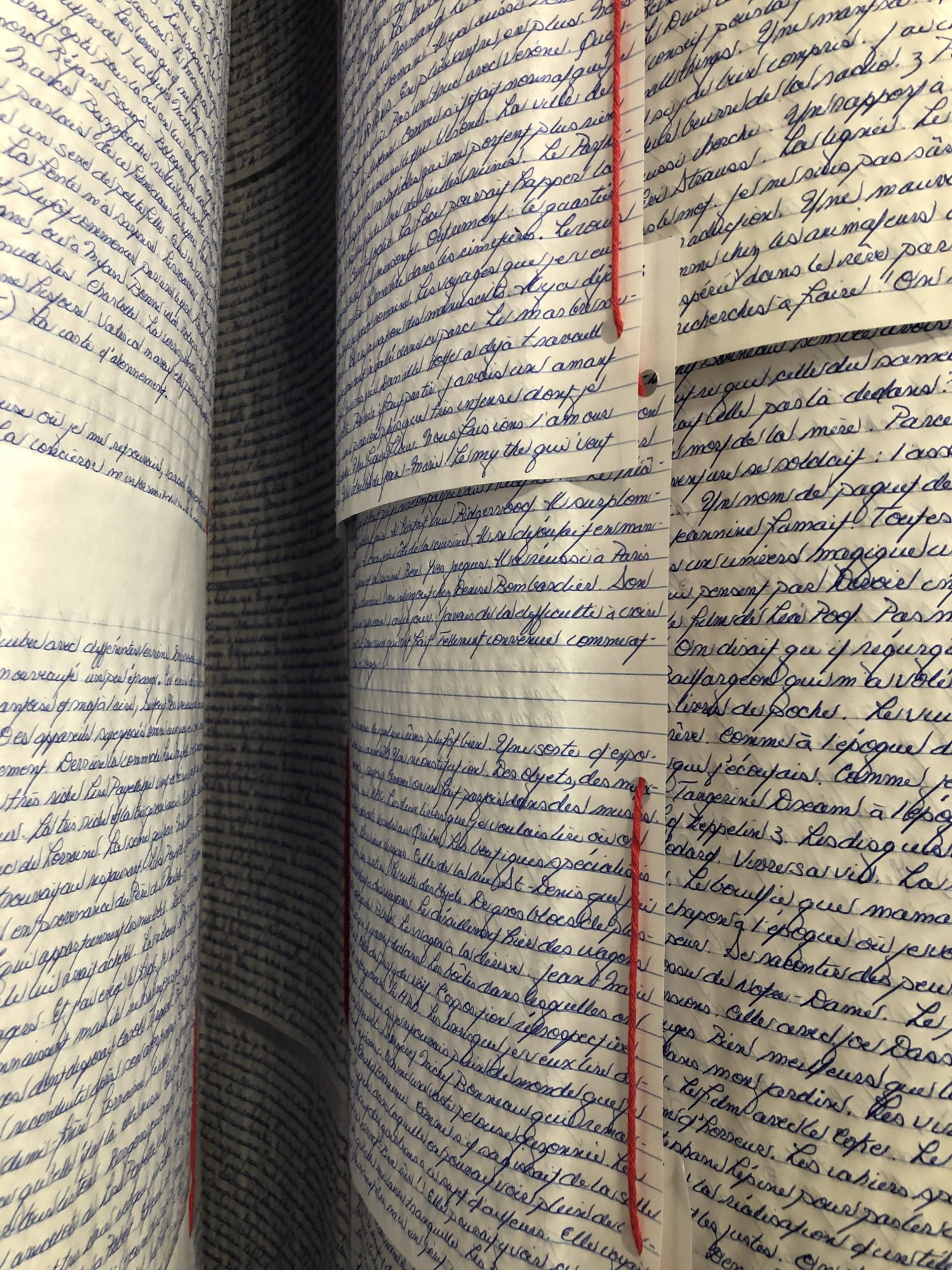 The house is made of approximately 15,000 pages of handwritten stream-of-conscious by Montreal author, Réjane Bougé – the result of a thirty-year-old, daily, writing practice inspired by her previous night’s dreams. Réjane was looking to give her collection to an artist working with paper. An initial attempt with Louise Viger ended abruptly with Louise’s death due to cancer. Manon Tourigny of Centre Clark brought them together. Réjane and Karen began meeting monthly in the summer of 2019. The idea to make the house came to Karen as a result of their meetings.