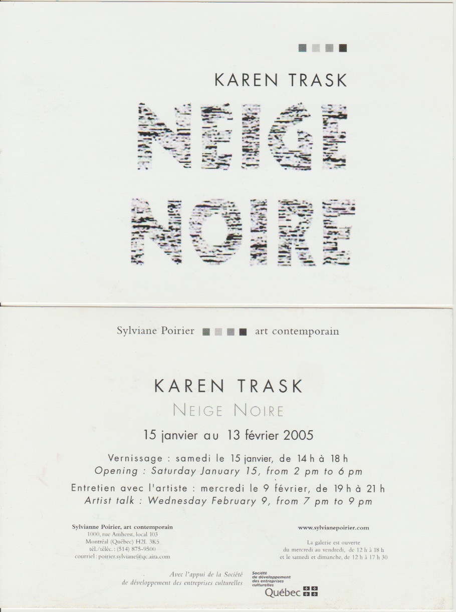 Neige noire was presented as Warm Snow in 2008 at Snap Main Gallery. See article from Vue Weekly, March 20 – March 26, 2008.