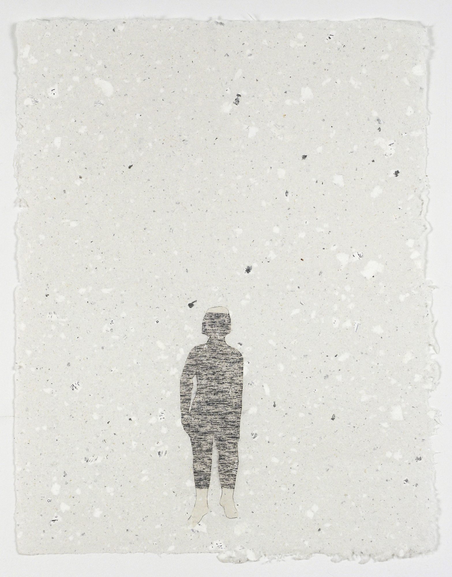 In one of the works, an entire edition of lithographs is hung together to create one large-scale composite mural. Here, an image of static captured from a television screen was transferred onto stone and printed on a variety of white and off-white, handmade sheets of paper. Another of the works, a video loop presents three separate walks taken on a huge pile of snow removed from airstrips at the Pierre Trudeau Airport in Montreal. Walking on the uppermost edge of this very, black, melting pile late in the month of May contributed to the idea and to the naming of this project.