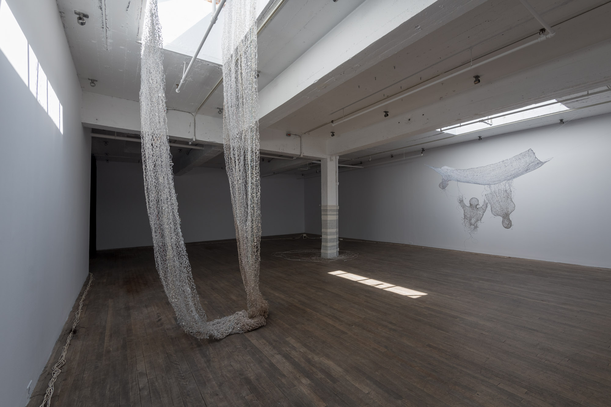 The Waves by Virginia Woolf is present as work titles and as material in the work. The heart of the book for me is that we are all connected, that there is a thread between me and everyone else, that our bodies and our genders are blurred. Growing up on a farm, I developed a profound respect for the rhythms of nature, but as a teenager, I watched in horror as my father, like many others at the time, cut down trees and brutally straightened a meandering creek to make room for a few more rows of corn. Nœuds d’écoute Listening Knots has allowed me to connect to the land and the water.