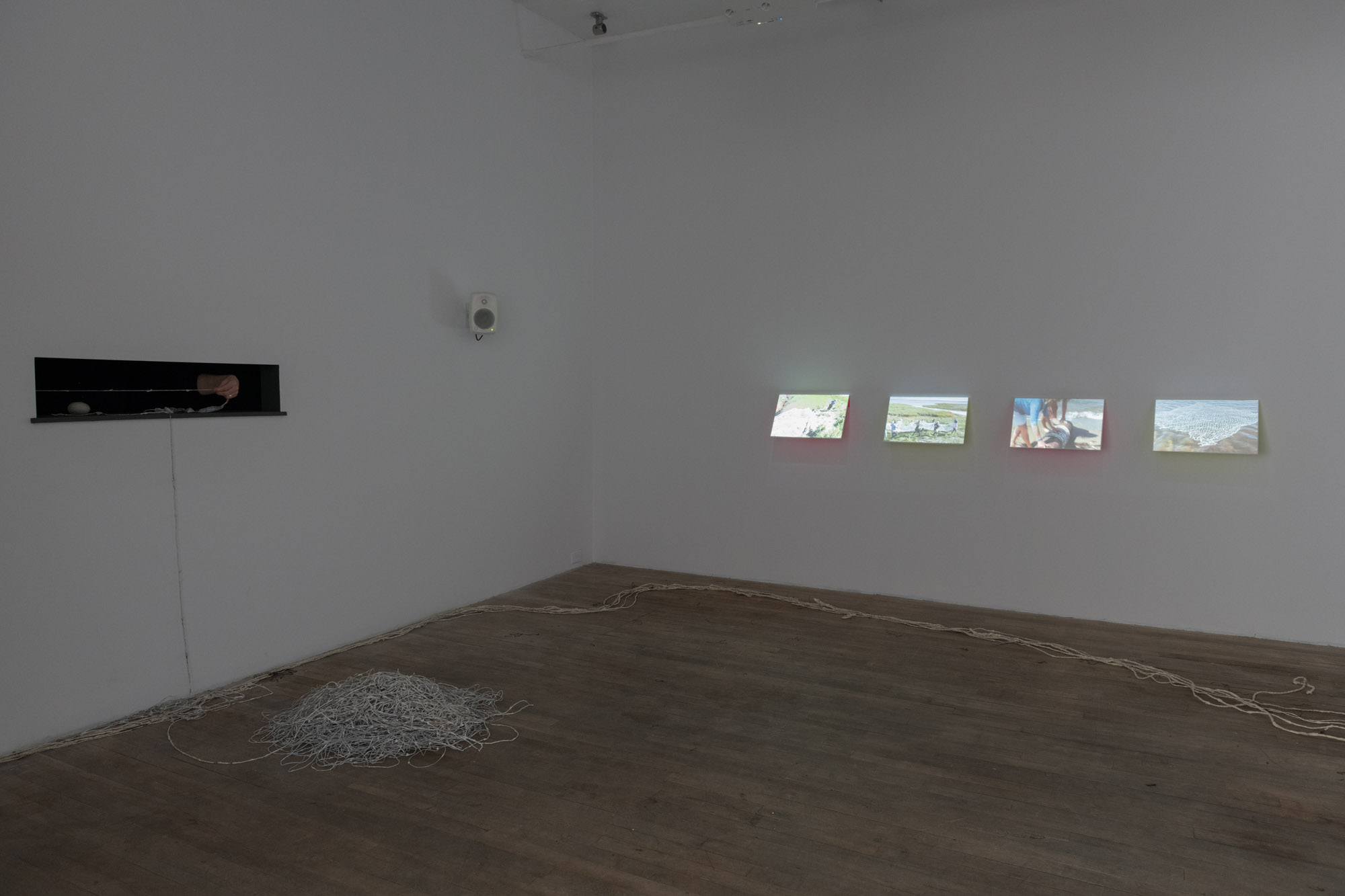 Nœuds d’écoute / Listening Knots comprend des installations textuelles, une projection vidéo et une performance continue inspirée par Les vagues de Virginia Woolf. Elle l’appelait son « poème-jeu ». Imaginez-moi comme Virginia Woolf avec une caméra et le désir de jouer avec des corps de texte, le corps humain, la marée, l’océan et la terre. Cette pensée a guidé la réalisation de l’œuvre au cours d’une résidence de deux ans à l’Université de Moncton, à Moncton et à l’Université Mount Allison, à Sackville au Nouveau-Brunswick. Les étudiants, les amis, l’océan et la terre étaient des participants actifs.