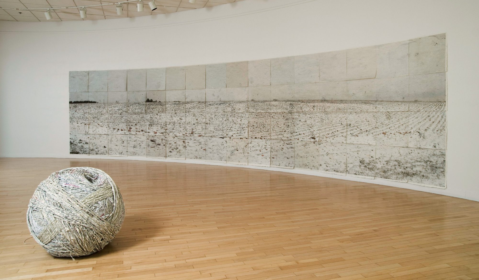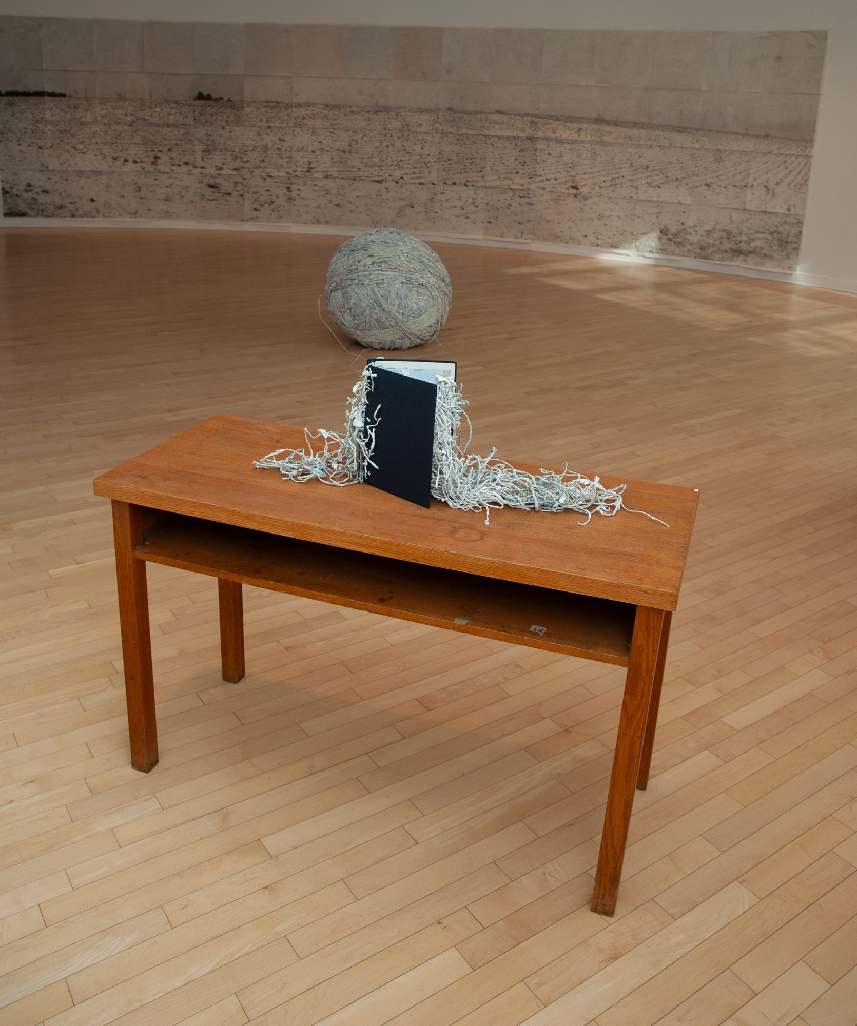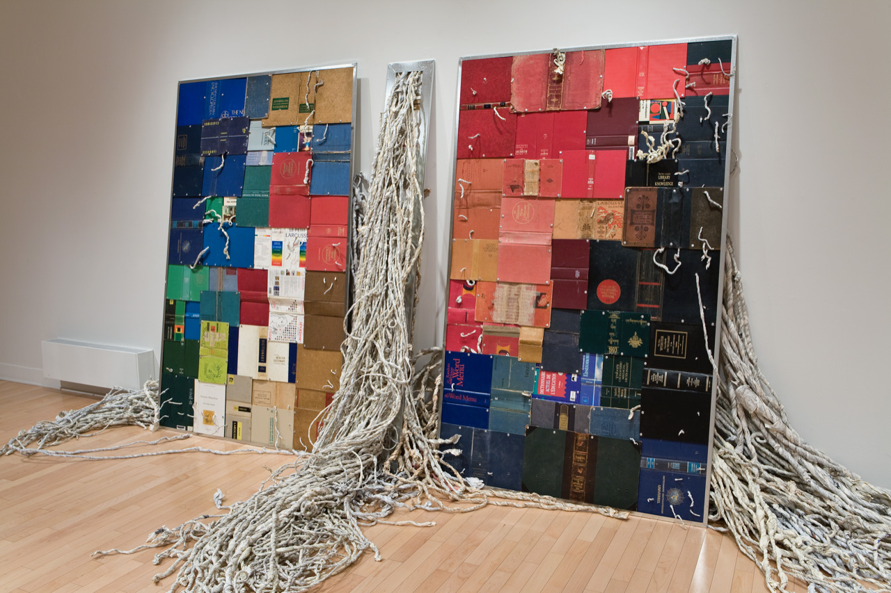 In Où vont les mots / Where the Words Go, hundreds of dictionaries have been dismantled and transformed into a series of sculptures and one giant mural. Their printed papers were either torn and recycled into fresh sheets of paper or reconstituted through spinning into long paper threads. A desire to subvert the power and authority of certain types of written texts and to highlight the presence of the paper used in printing these texts were the starting points for this work.