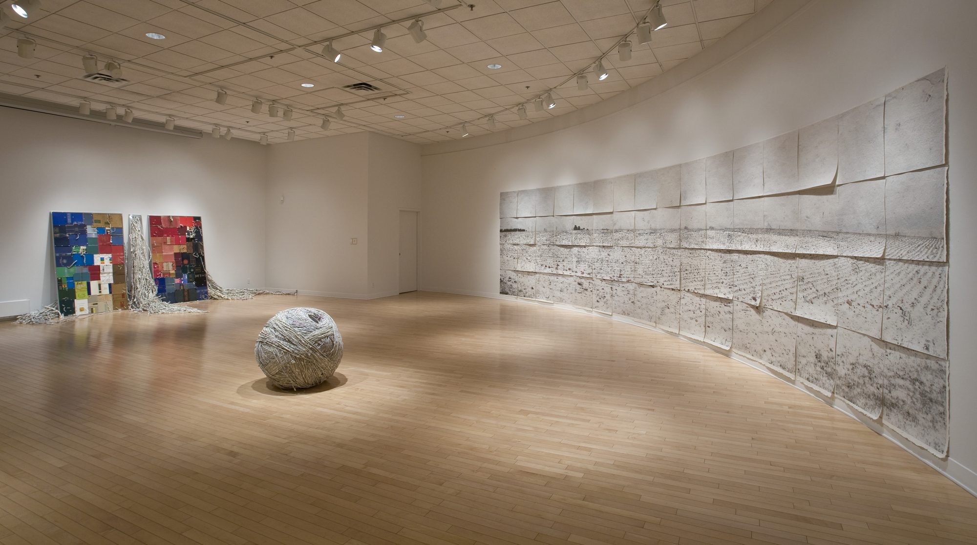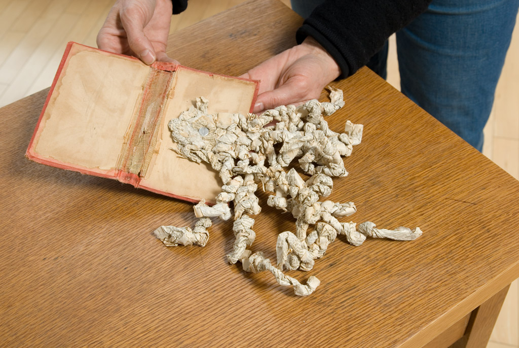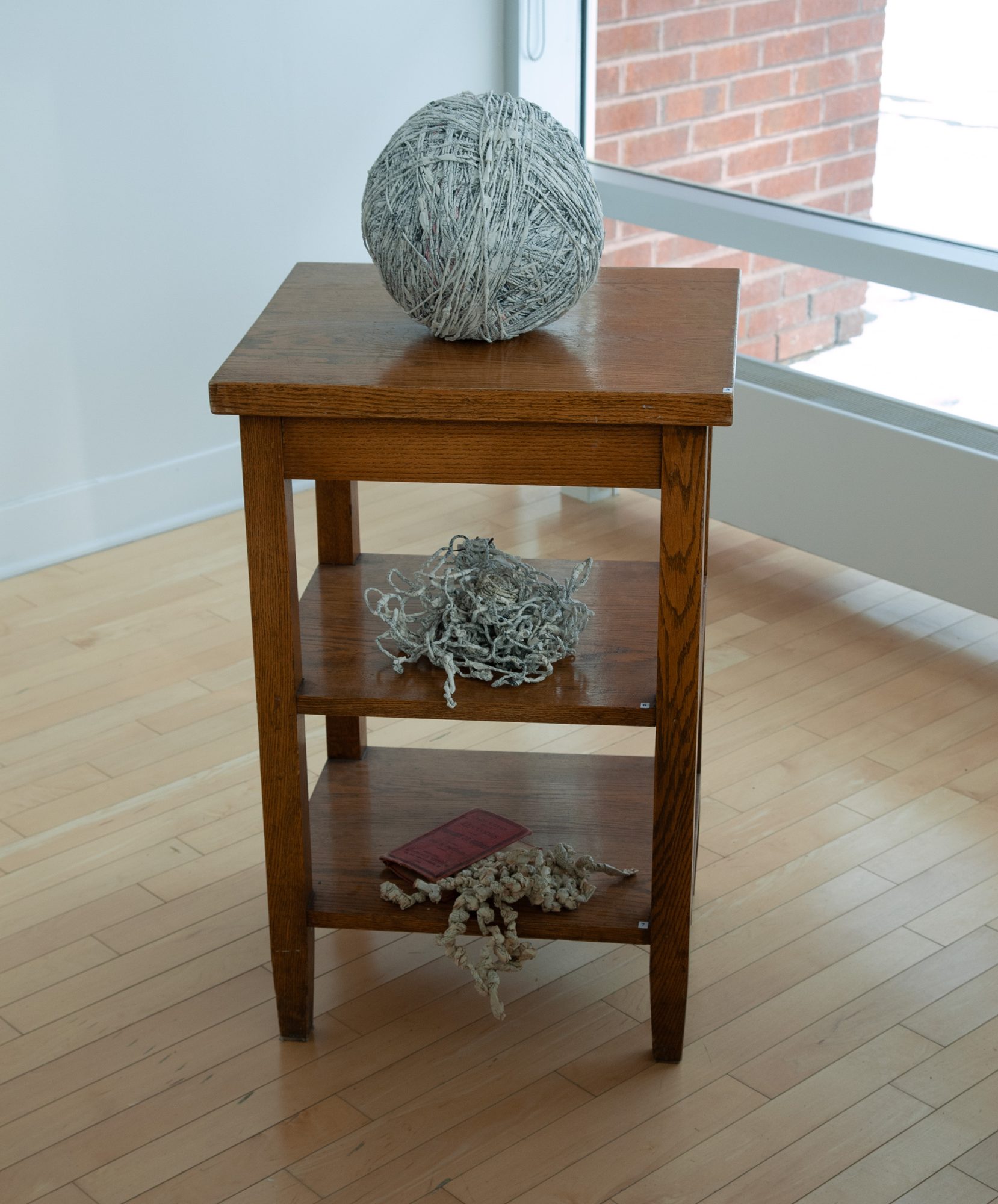 In Où vont les mots / Where the Words Go, hundreds of dictionaries have been dismantled and transformed into a series of sculptures and one giant mural. Their printed papers were either torn and recycled into fresh sheets of paper or reconstituted through spinning into long paper threads. A desire to subvert the power and authority of certain types of written texts and to highlight the presence of the paper used in printing these texts were the starting points for this work.
