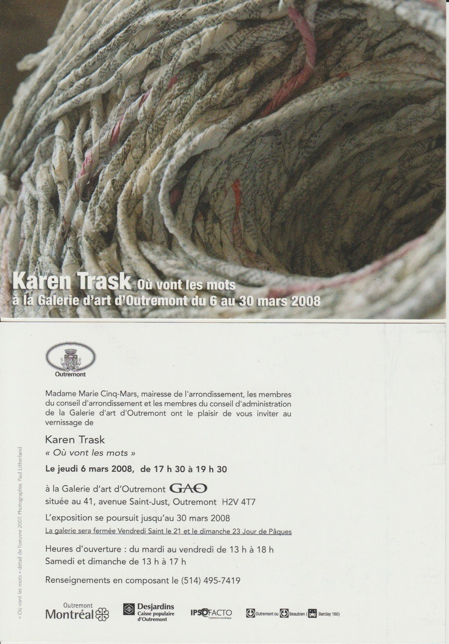 The exhibition Où vont les mots proposes a dialogue between text and paper, and the landscape. It includes three artist books, two sculptures made from dictionaries, a paper poem installed on the window of the gallery and a large-format, composite mural of a snowy landscape, ink-jet printed onto paper made especially by the artist for this image. Shifu, the Japanese technique for spinning paper into paper threads is featured in these works. The work Portes was later transformed into Inside Passage / Passage intérieur, 2010. In 2010, parts of this exhibition travelled to Grenfell Art Gallery (formerly known as Sir Wilfrid Grenier College Art Gallery) at Memorial University of Newfoundland in Corner Brook, and were exhibited in an exhibition entitled Where the Words Go curated by Charlotte Jones.