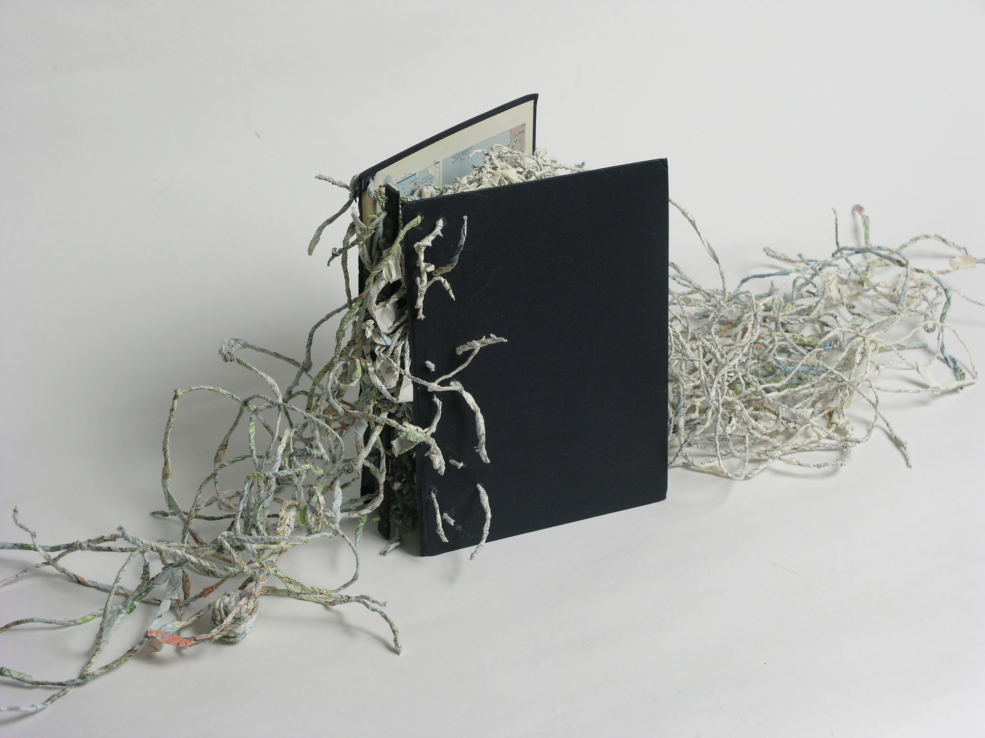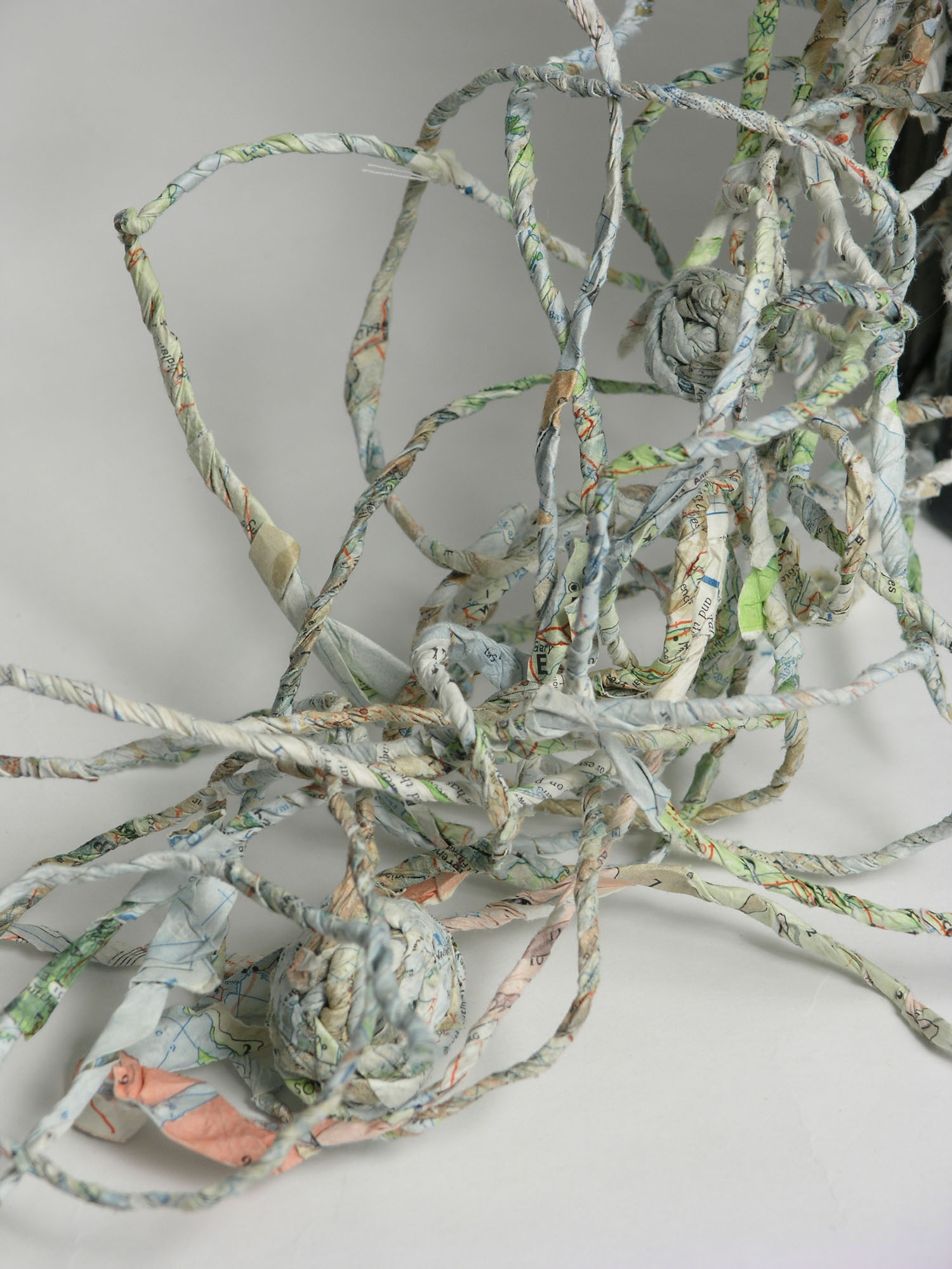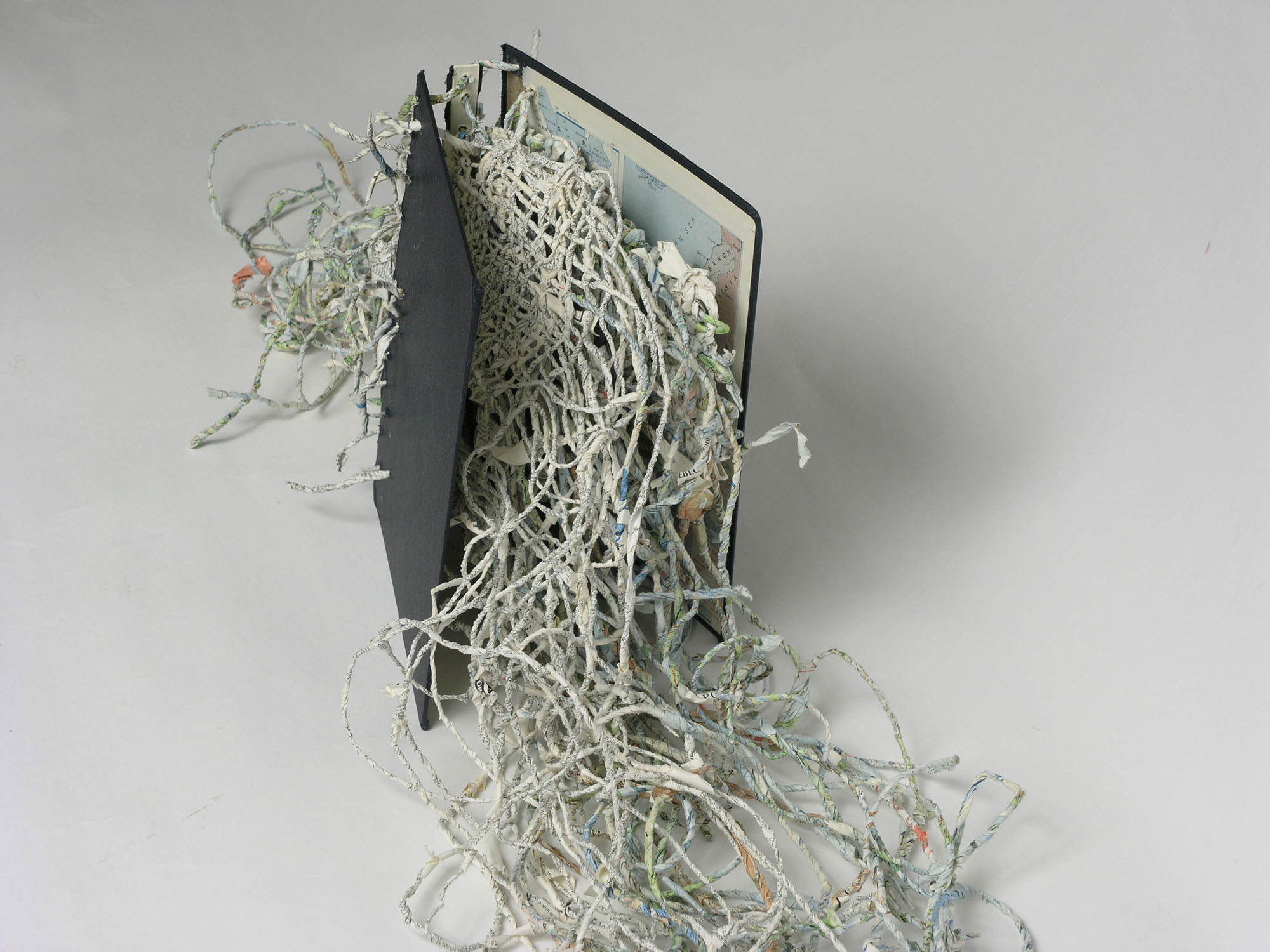 One sentence describes the objective of much of my work: I want to touch words; I want to touch the space between words. My creative process has developed as a series of poetic investigations exploring human experience through language. A love-hate relationship to the written word was born out of loss. When I was 6 years old, my mother died in a car accident. Learning to read and to write coincided with death. This marked the beginning of a dialogue with absence, that I have been exploring, breathing, falling into and ultimately searching for words to describe. Paper, normally the invisible and ignored support material is one of the materials I use to create this presence of absence. My creative process includes researching the etymological roots of words and experimenting with early textile arts technologies such as spinning and weaving. Knowing the stories behind the evolution of words such as: text, (from textus meaning textile in Latin,) to spin, (to draw out of chaos, Latin,) stitch or suture (Sanskrit, word sutra, meaning thread and narrative scriptures) is an important part of this process.