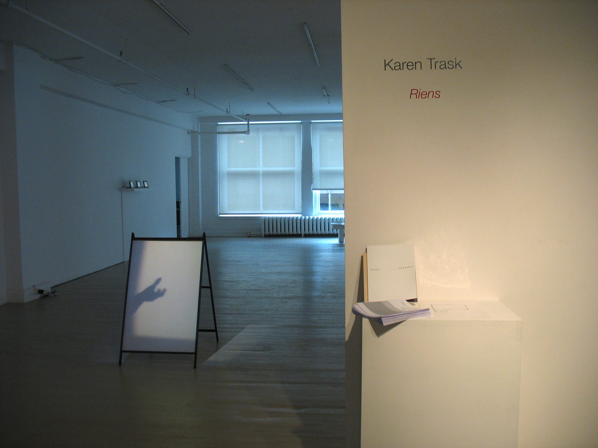 Au centre de cette recherche de longue haleine, l’écriture s’impose comme un outil vital. Si on trouve les mots dans presque tous les projets de Karen Trask, le livre d’artiste qui accompagne cette exposition en démontre l’envergure littéraire. Le « rien » y rejoint l’amour et la mort, les deux grands balanciers du sensible, les plus forts moteurs du vertige. Les brèches ouvertes sur le vécu de l’artiste, parfois sur certaines expériences des plus marquantes, côtoient des références documentées, des citations essentielles à la problématique qui l’occupe depuis tant d’années. À travers les réflexions de l’artiste, le « rien » entendu comme absence de l’être se révèle dans une déclinaison complémentaire et juste face aux ombres et aux objets qui l’entourent.