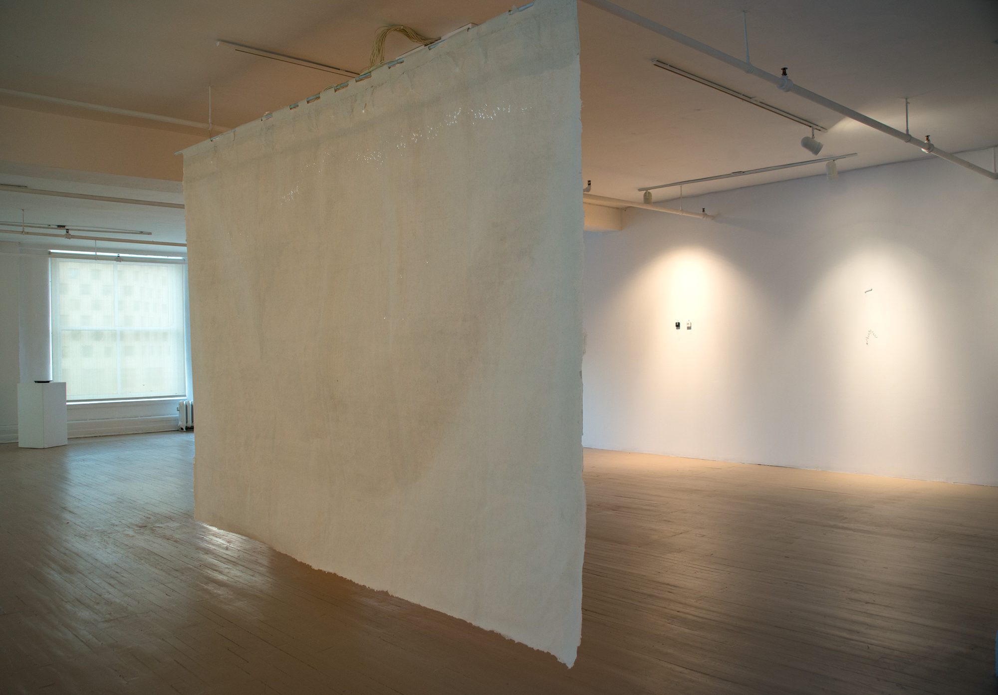 « Je vois le ciel comme un voile, comme un grand papier ». Les mots de l’artiste font écho à cette impression, presque romantique, qui se dégage lorsqu’on se tient, dans l’espace déjà vaste de la galerie, devant cette immense feuille de papier qui semble avoir fossilisé un moment particulier de l’univers. Le sublime n’est jamais loin de l’idée du néant. D’ailleurs, tout ces « riens » bougent, ils sont en mouvement. Ce sont des « riens » inscrits dans une temporalité, allant ainsi à l’encontre de l’absence pensée comme statisme. Cette temporalité n’est pourtant pas linéaire ; elle rappelle plutôt une pulsation à la fois cyclique et furtive. L’éternel recommencement du rien.