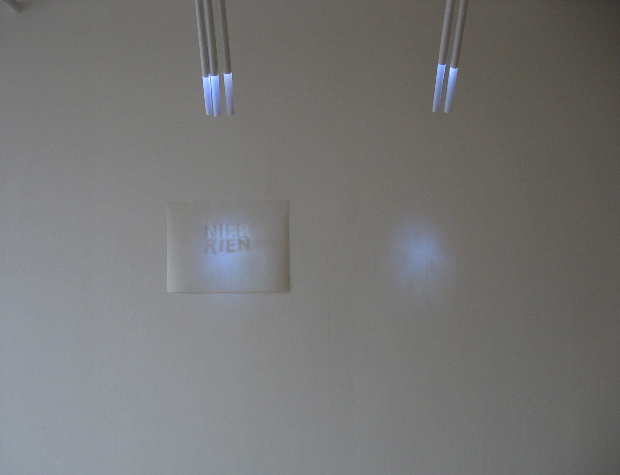 Riens is an exhibition including several kinetic sculptures, a video projection, video installations and paper tableaux with integrated programmed lighting. The exhibition was presented late in the autumn of 2012 without any artificial lighting other than what was programmed and part of the sculptural elements, so as the days shortened the afternoon light disappeared by 4pm and the gallery was dark.
