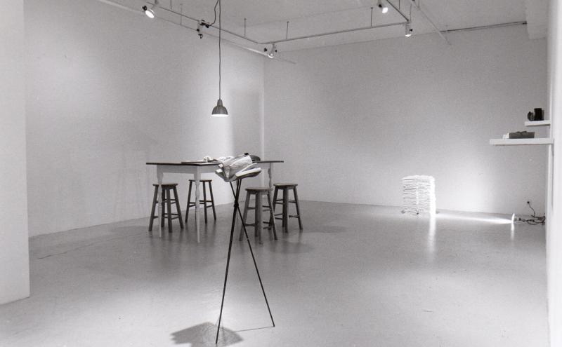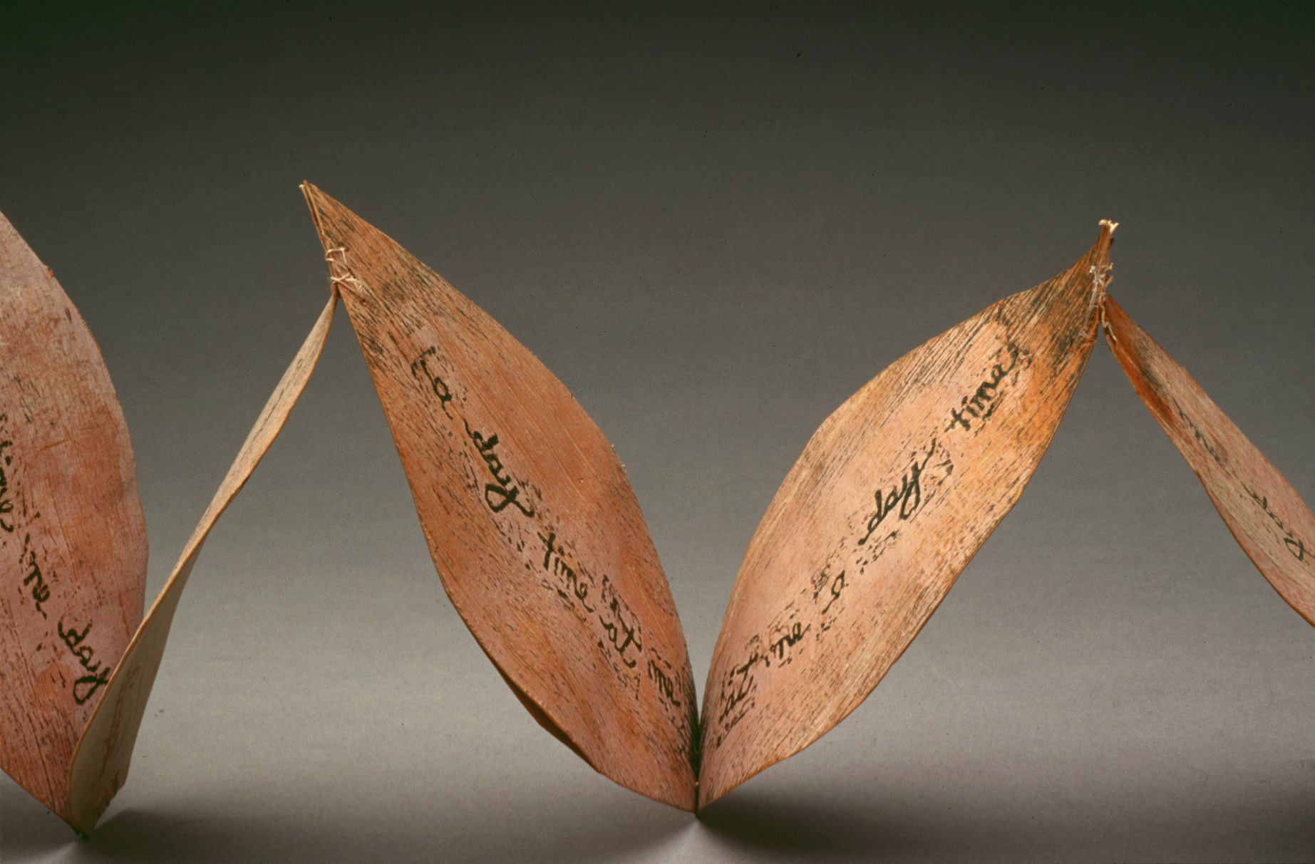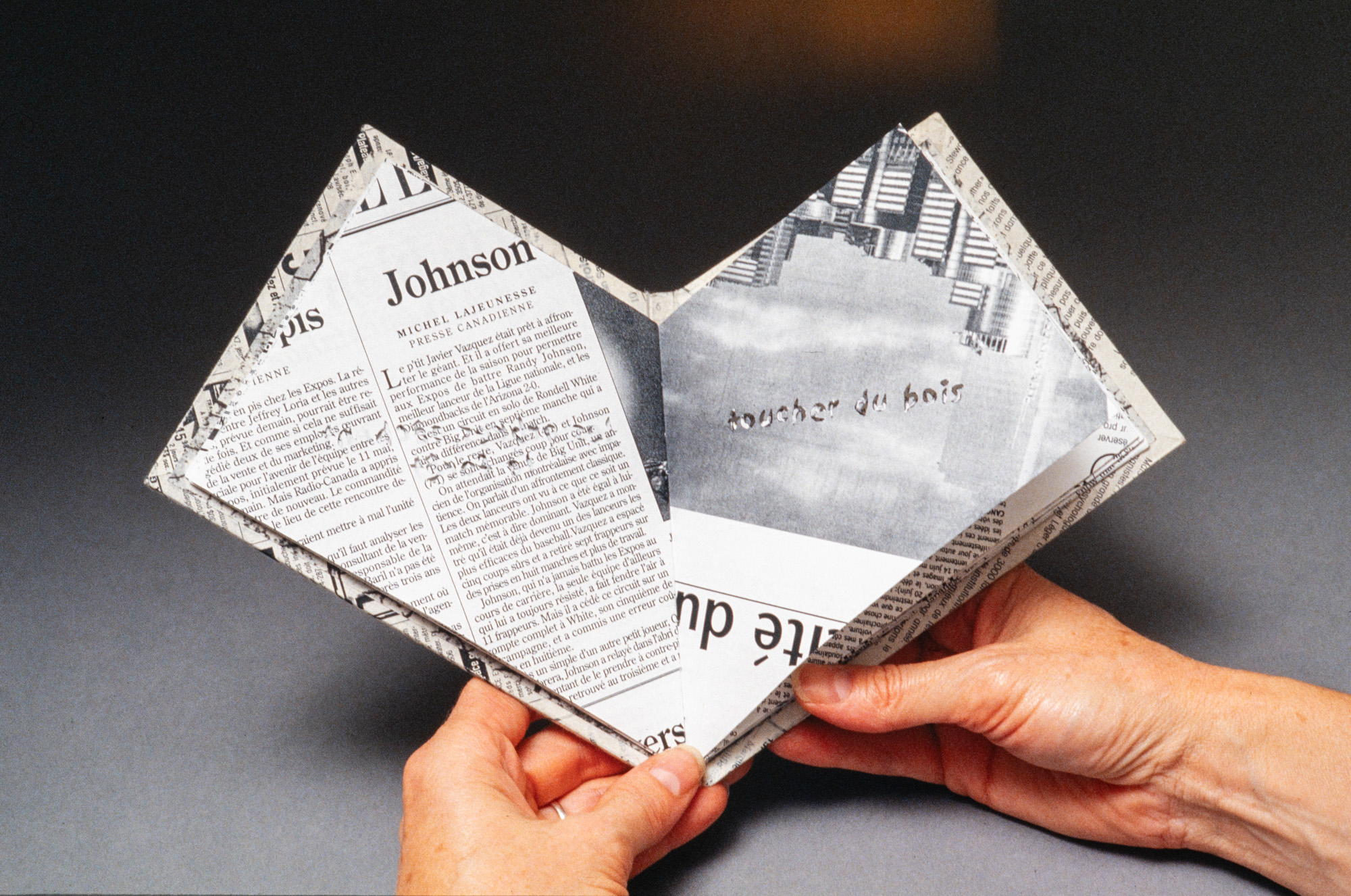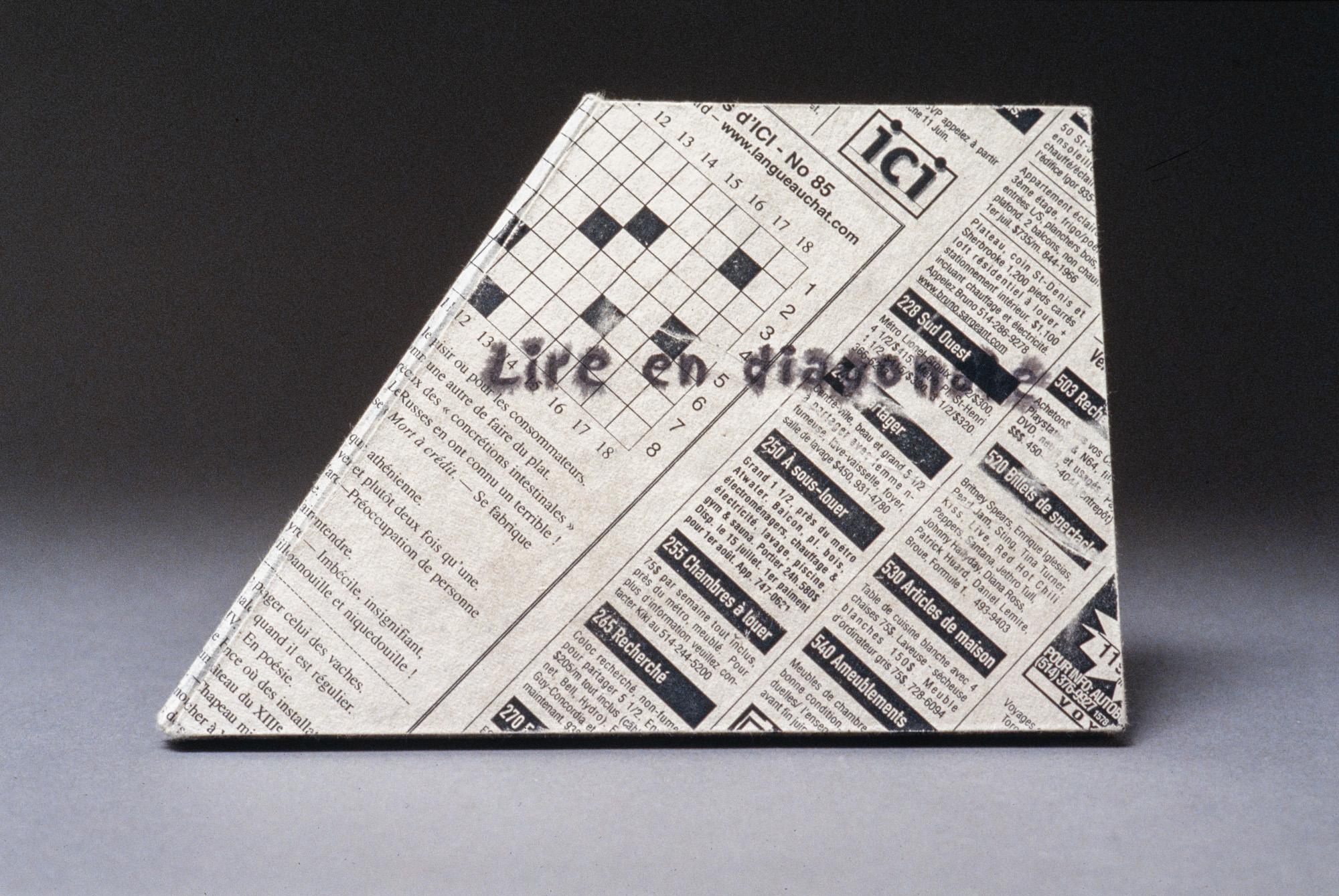 In the gallery’s small room, Karen Trask offers us a series of artist’s books where a reflection on the materiality of the object and our relationship to it is developed. The language and the image are found there, but the material qualities of the supports draw and hold our attention to what gives substance to these representations. Curiously, words and images acquire an increased virtuality. Starting from the book, this work, in its astonishing simplicity, takes us back to its vegetal origin and introduces the tree as a motif. But this tree, even if it is materially present in different forms, is also crossed by language. Conversely, language, although strongly inscribed in the material, retains all its evocative power. Objects come to us in different appearances and imply different relationships. They are sometimes sculptures to look at and involve displacement,