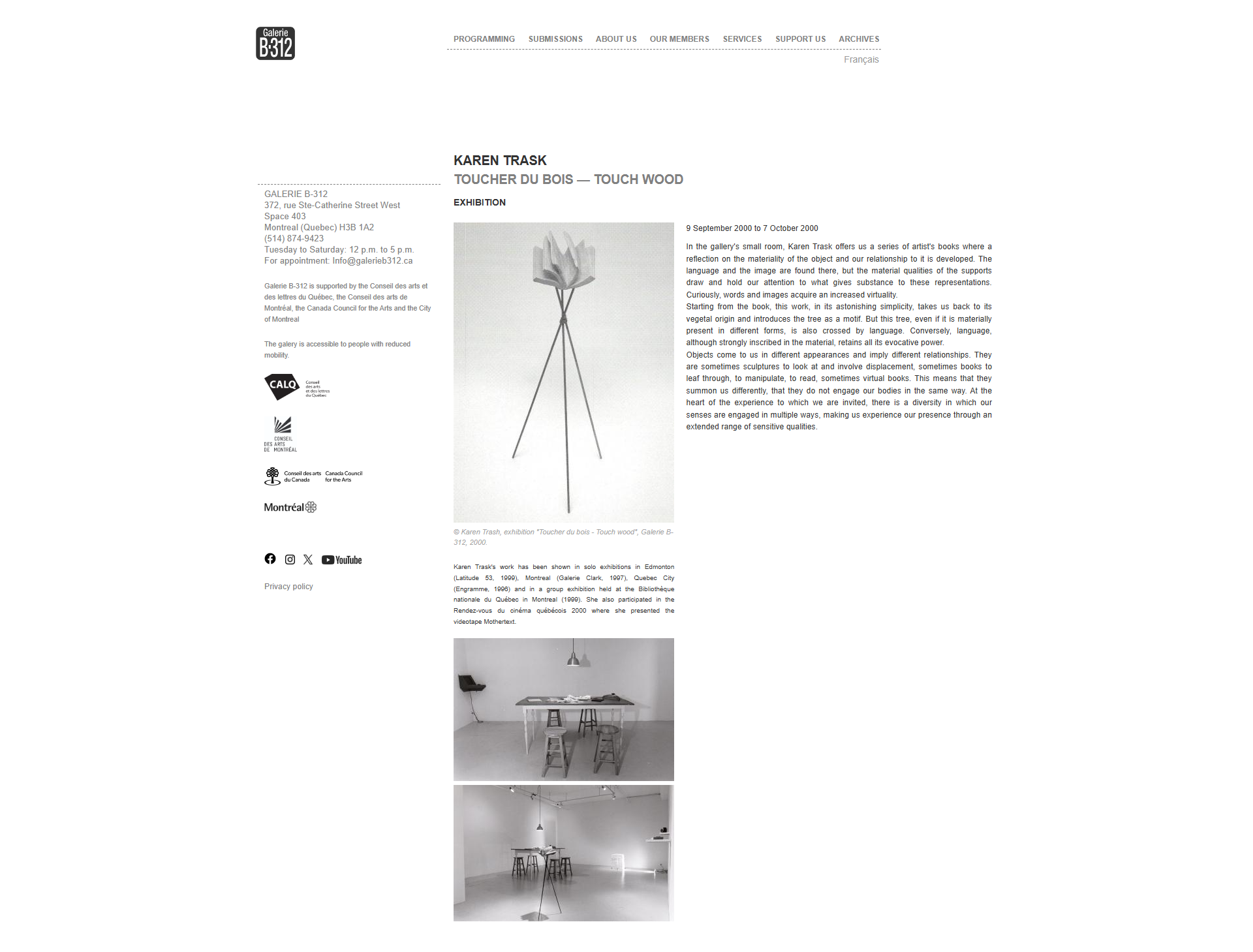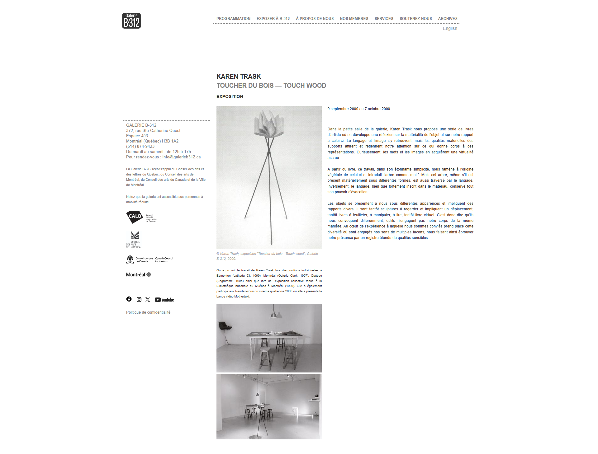 Karen Trask (2000). Galerie B312, Montréal, Québec, cahier #47, 5 p.